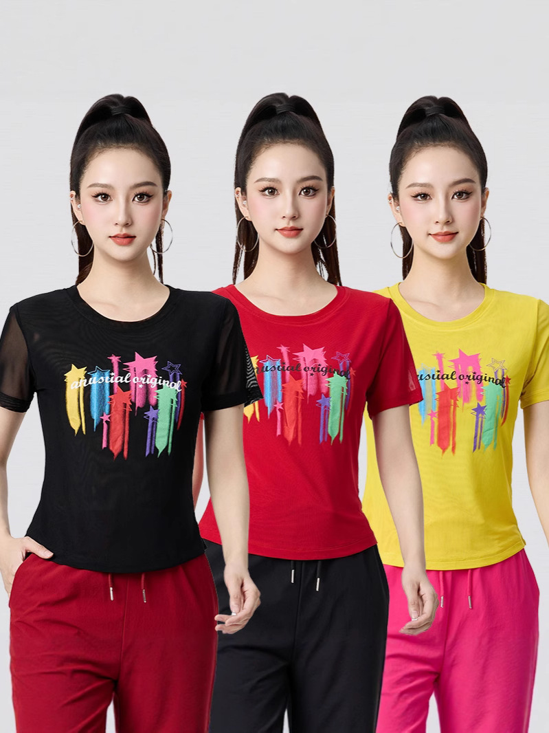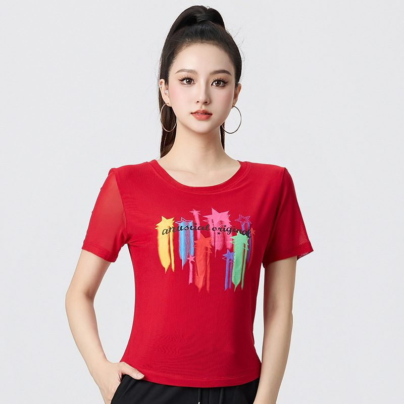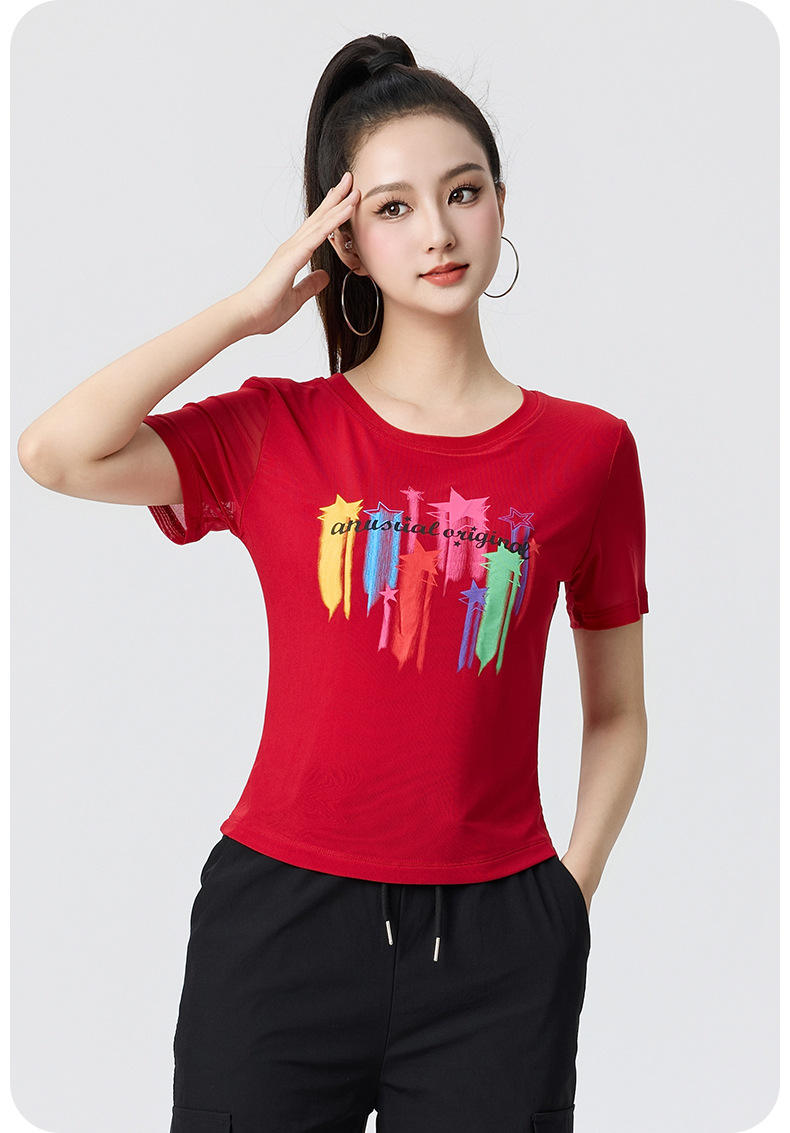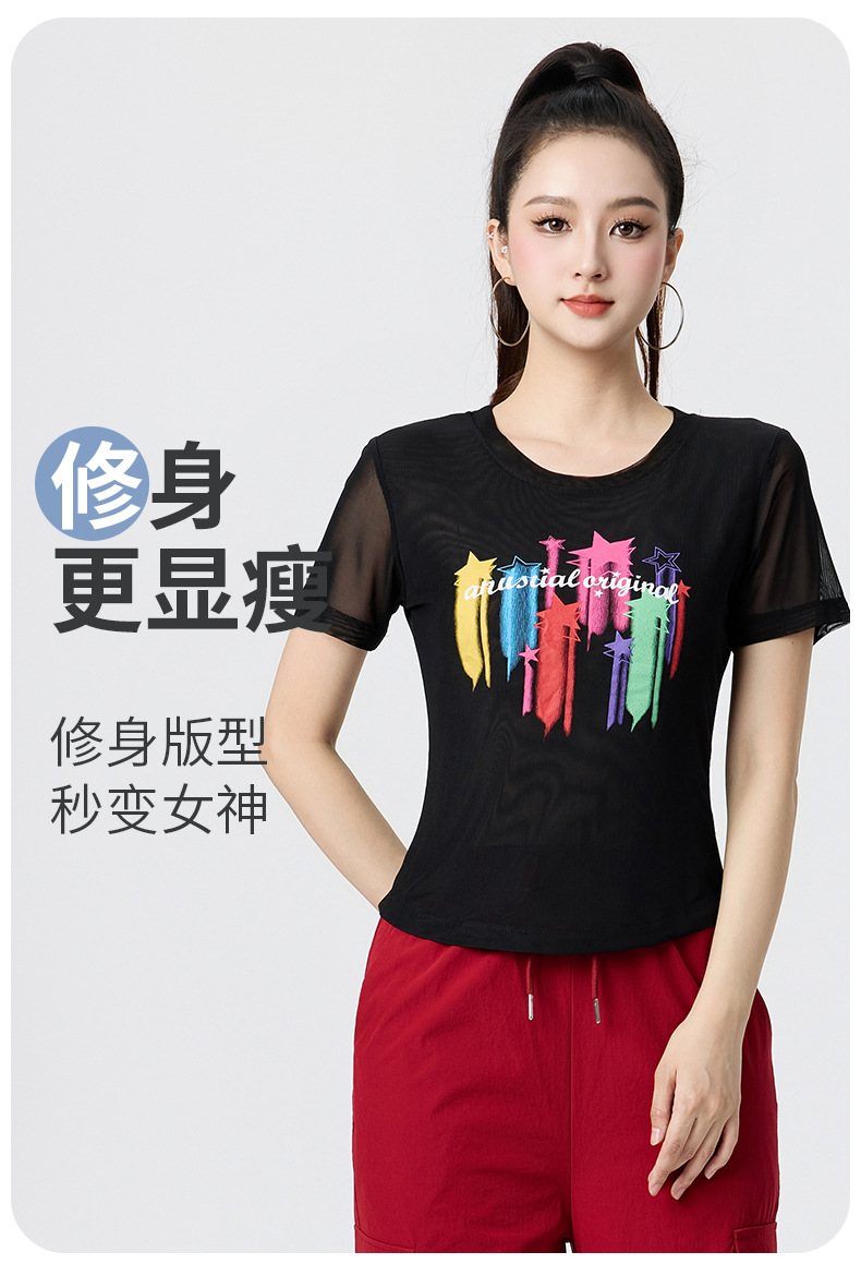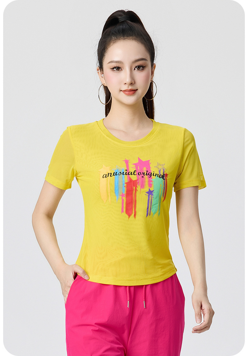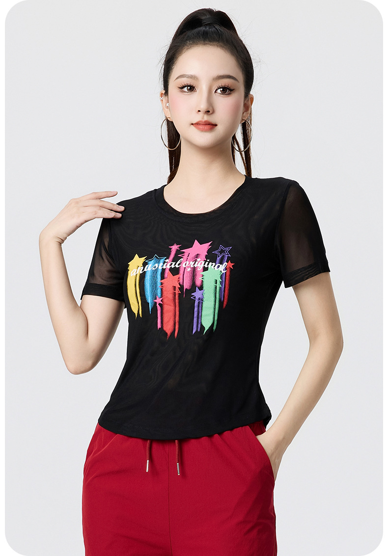 Новая летняя спортивная одежда, топы, двухслойная сетчатая одежда с круглым вырезом и принтом, высокоэластичная модная одежда для фитнеса в стиле хип-хоп, танцевальная одежда