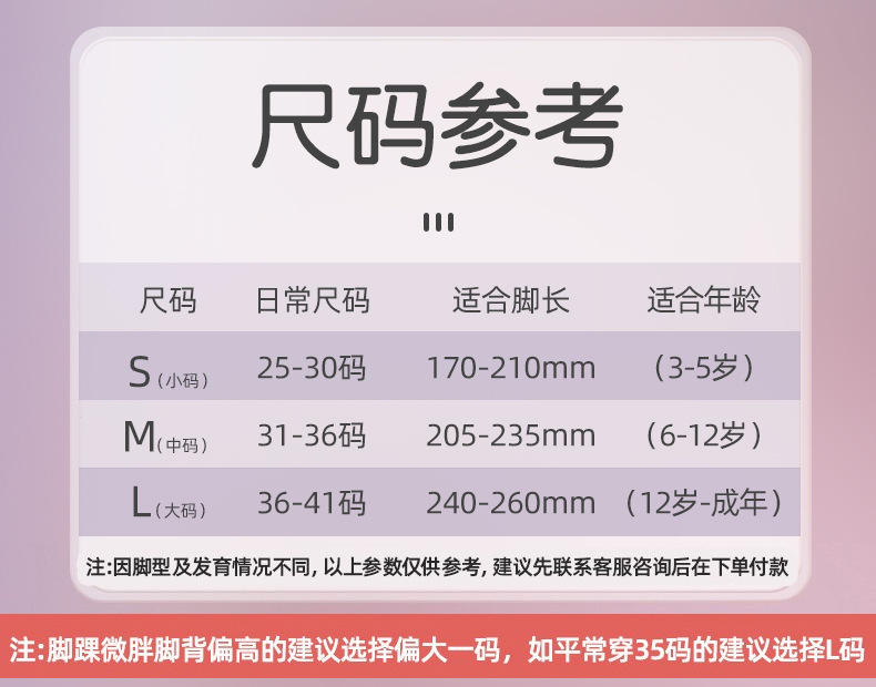 Размер S (подходит для детей 3-7 лет), размер повседневной обуви 26-31.; Размер М (подходит для детей 6-12 лет), размер повседневной обуви 32-36.; Размер L (подходит для детей от 12 лет - взрослых) повседневный размер обуви 37-41.