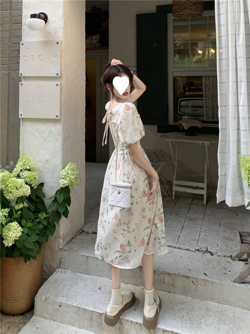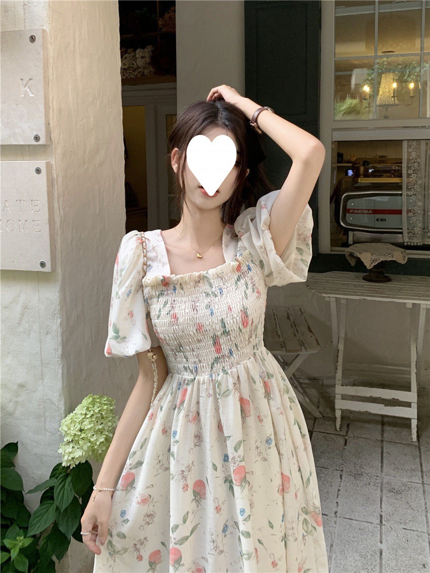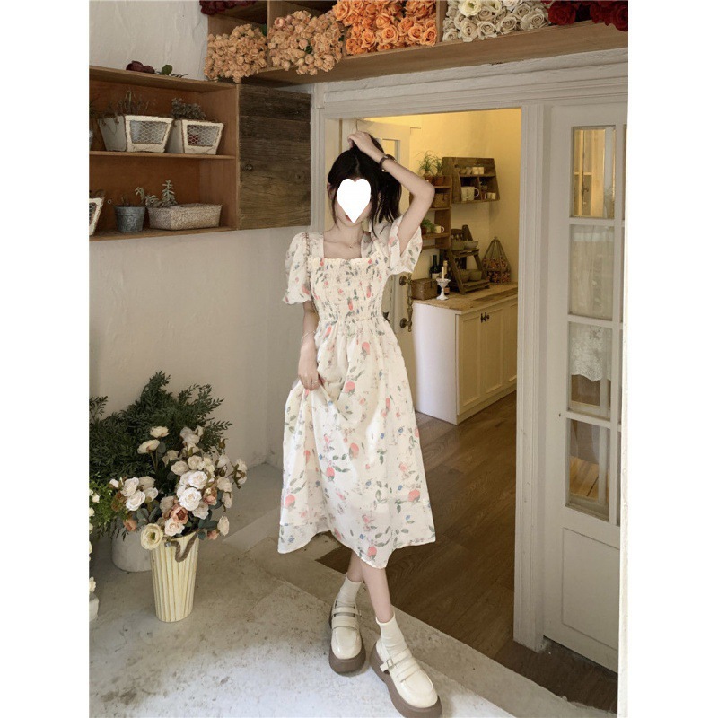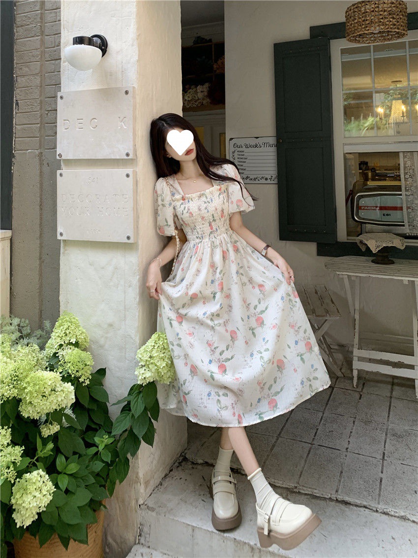 Летнее милое платье с цветочным принтом и квадратным вырезом для студенток с нежной юбкой средней длины, утягивающей талию.