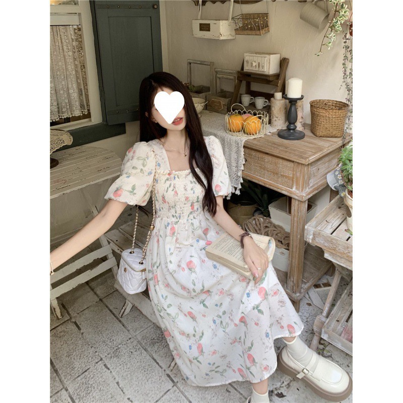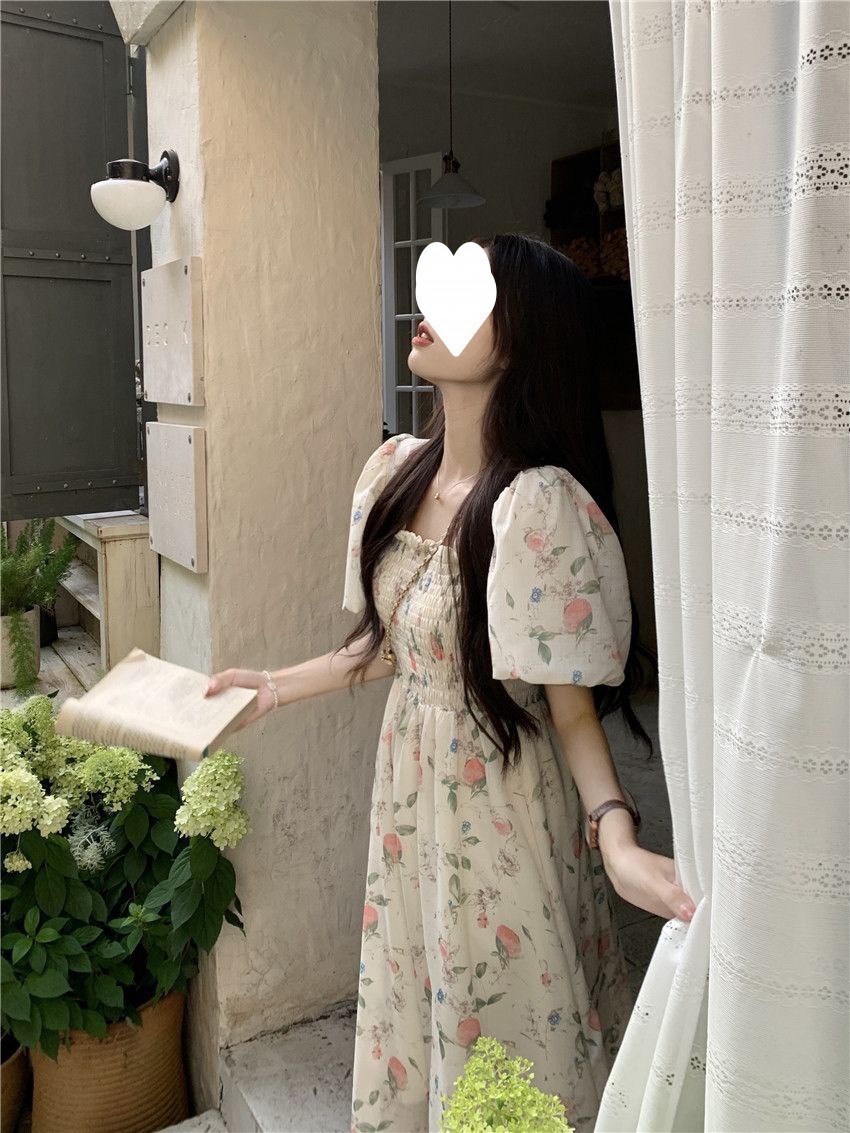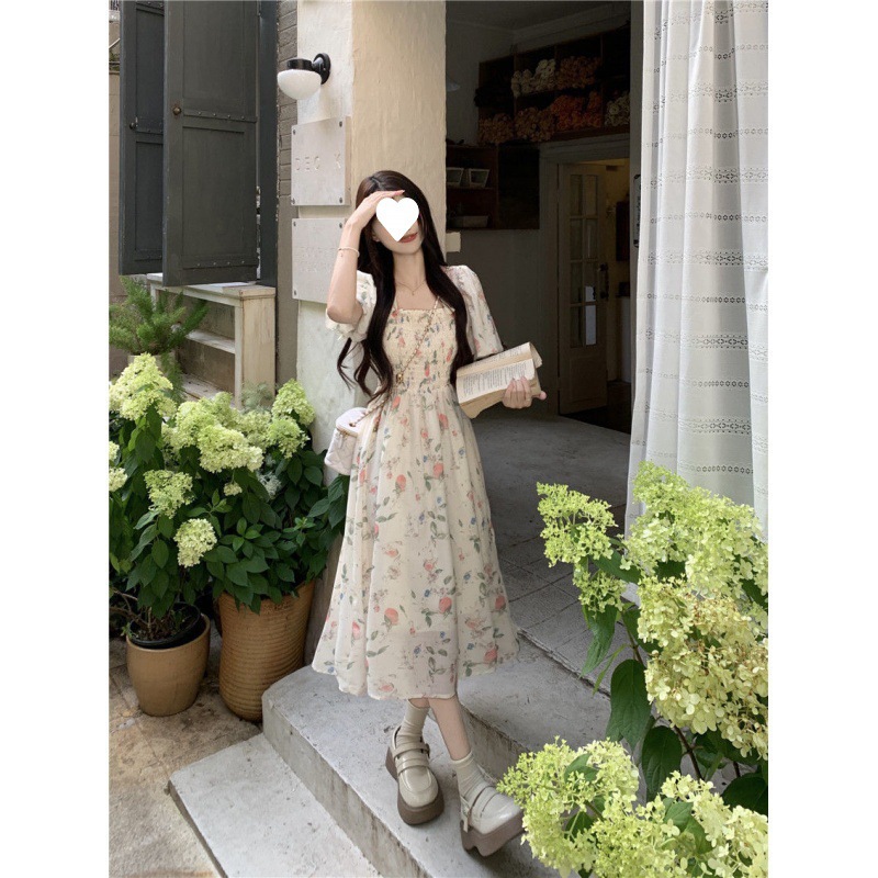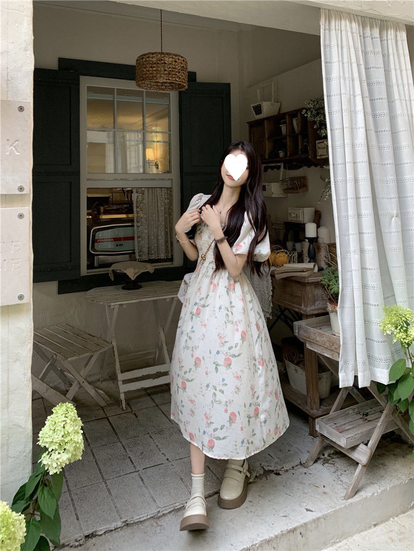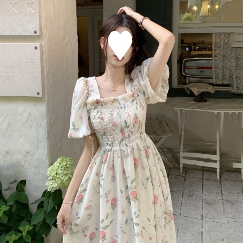Летнее милое платье с цветочным принтом и квадратным вырезом для студенток с нежной юбкой средней длины, утягивающей талию.