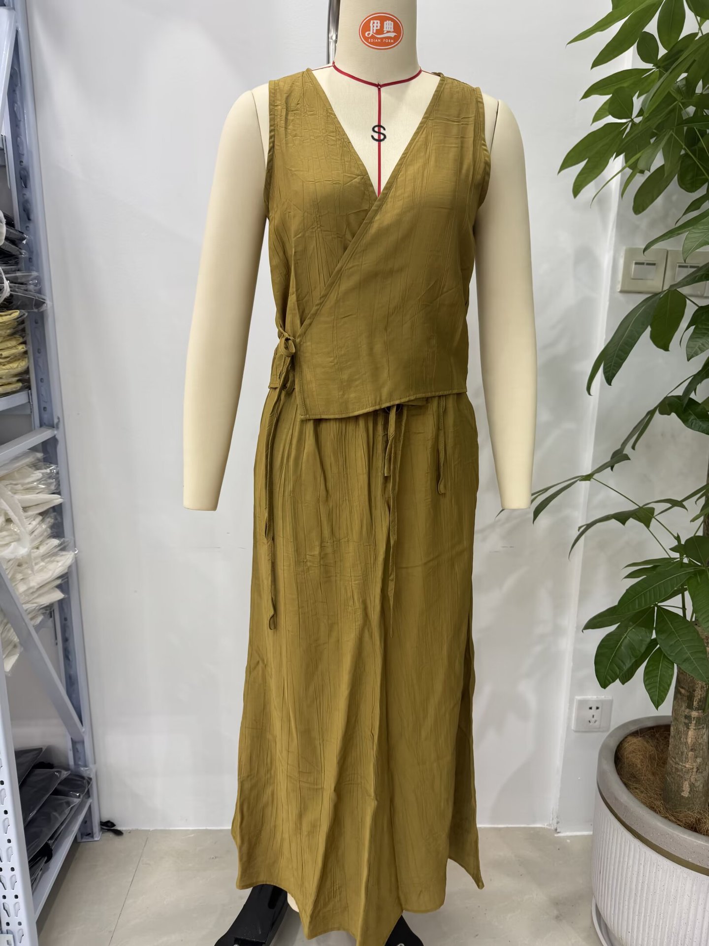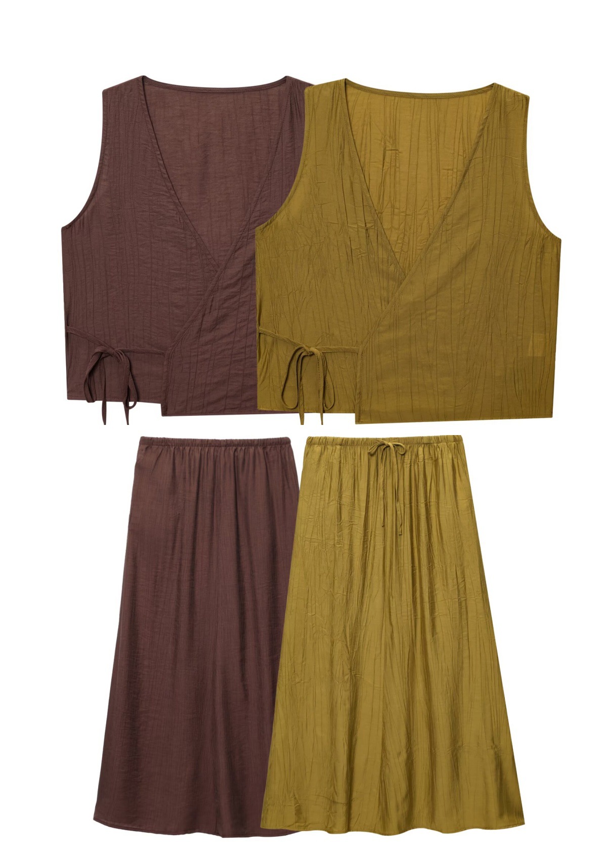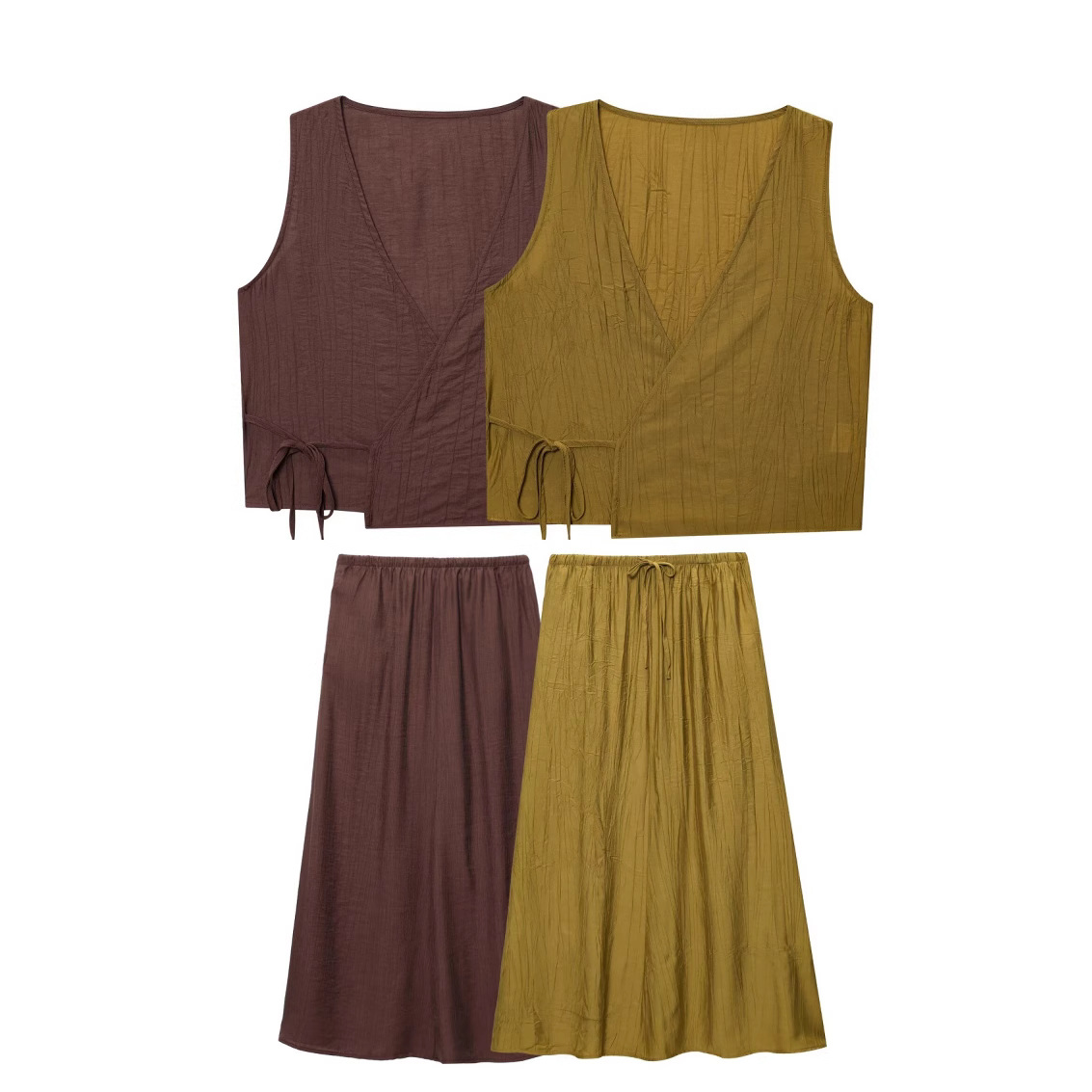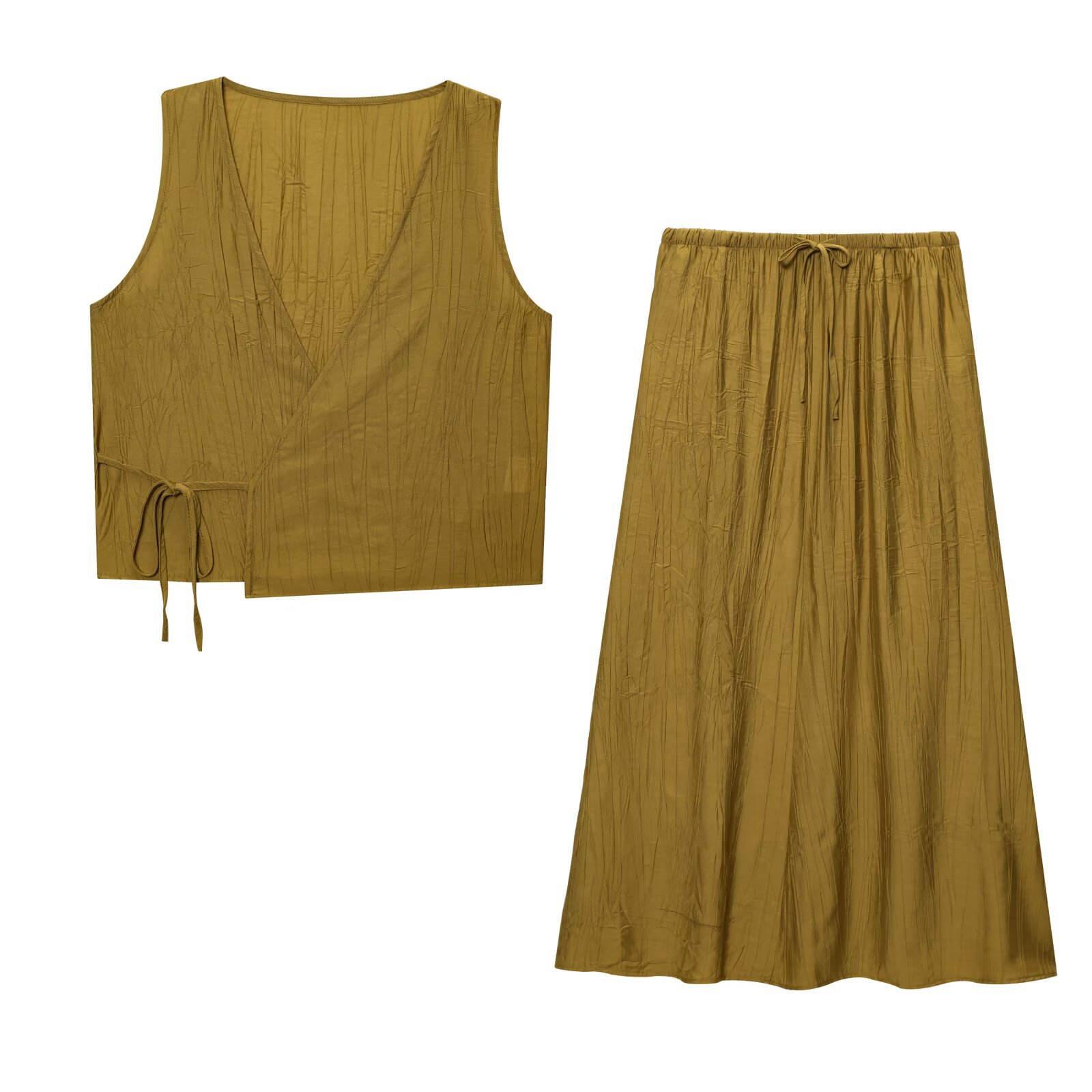 Летний костюм 2025 года в европейском и американском стиле: топ-жилет с V-образным вырезом и эффектом складок + миди-юбка для женщин U1627/28
