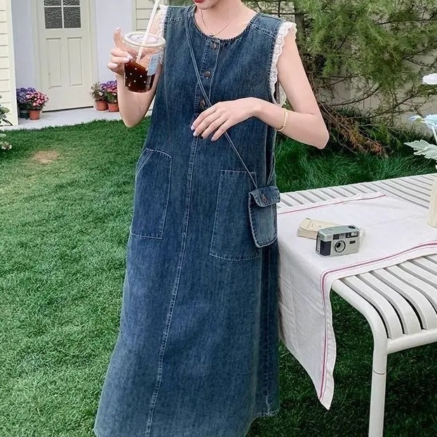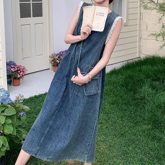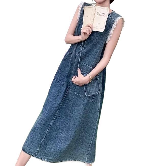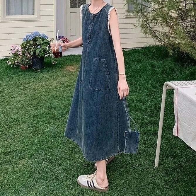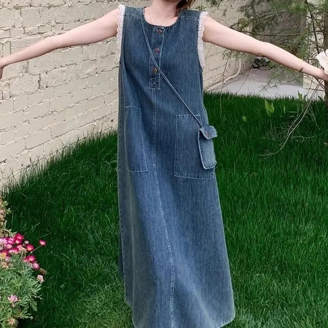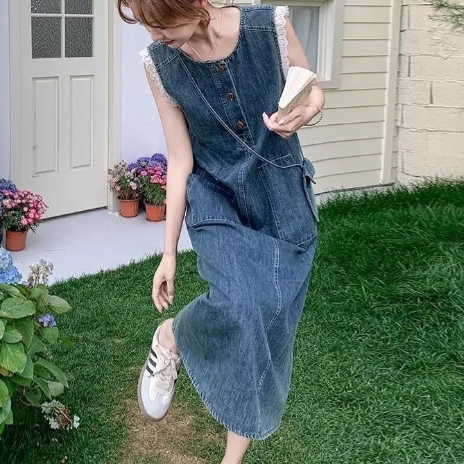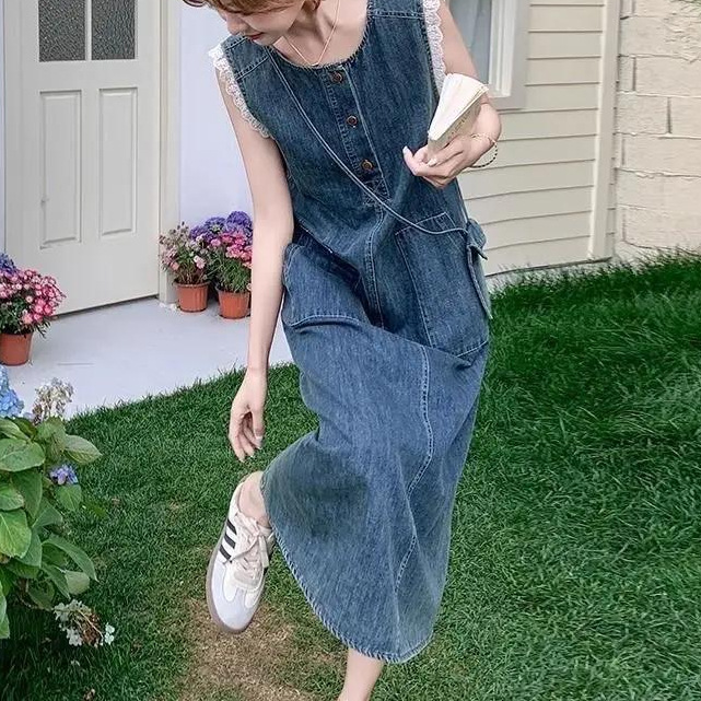 Корейское кружевное платье без рукавов для женщин, лето 2025, тонкий стиль, ретро джинсовая длинная юбка