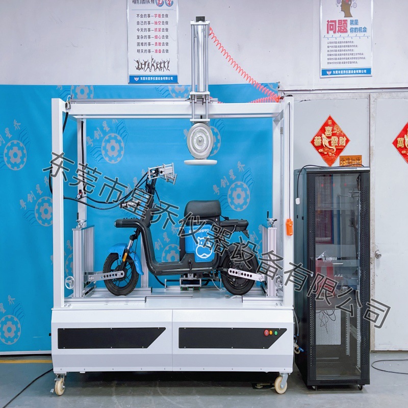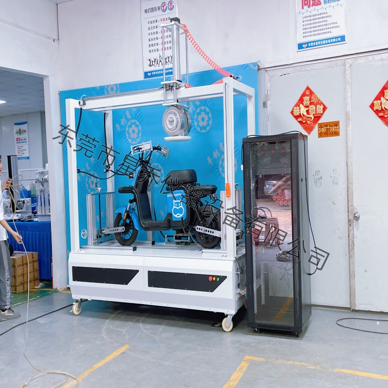 本机主要模拟电动自行车使用的实际情况将成品车固定在测试台架上,根据测试要求固定砝码,调整好安全装置在计算机上设置测试参数后,即可进行测试。