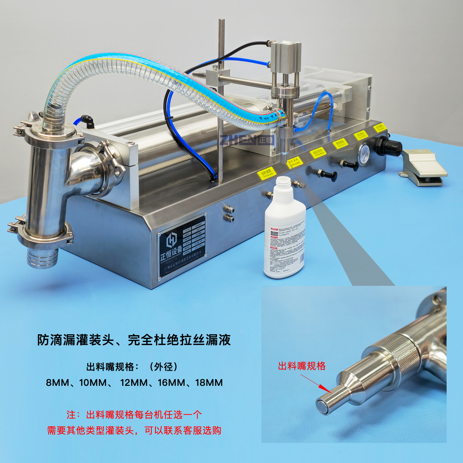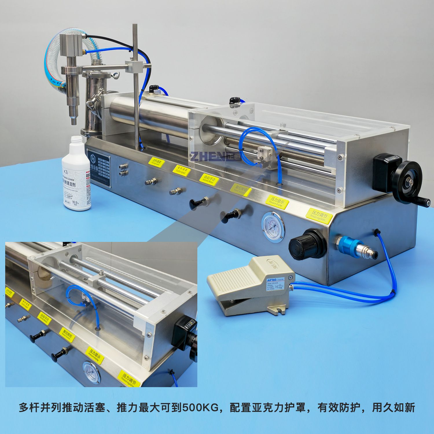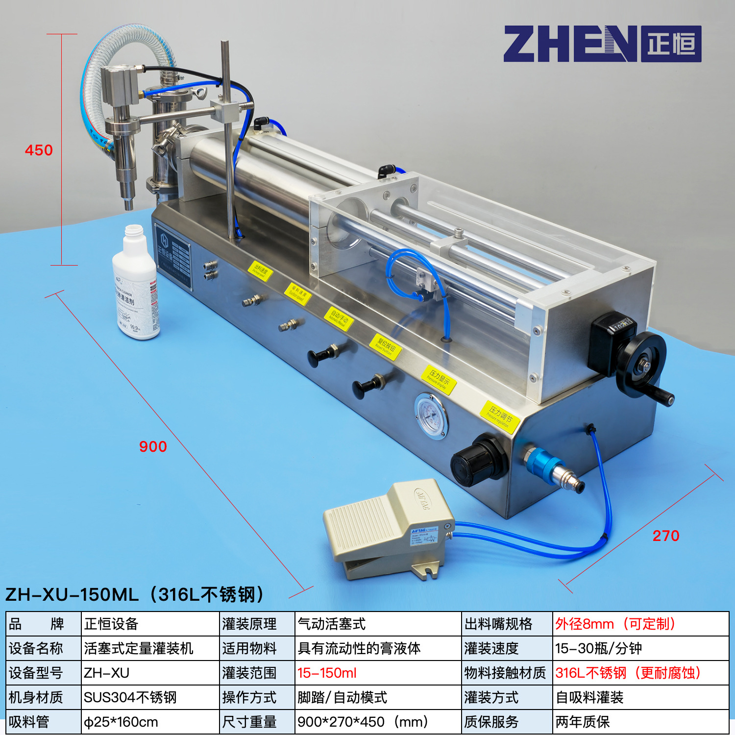 Полуавтоматическая машина для количественного розлива моющих средств ZH-XU с пневматическим поршневым типом, для пастообразных и жидких продуктов.