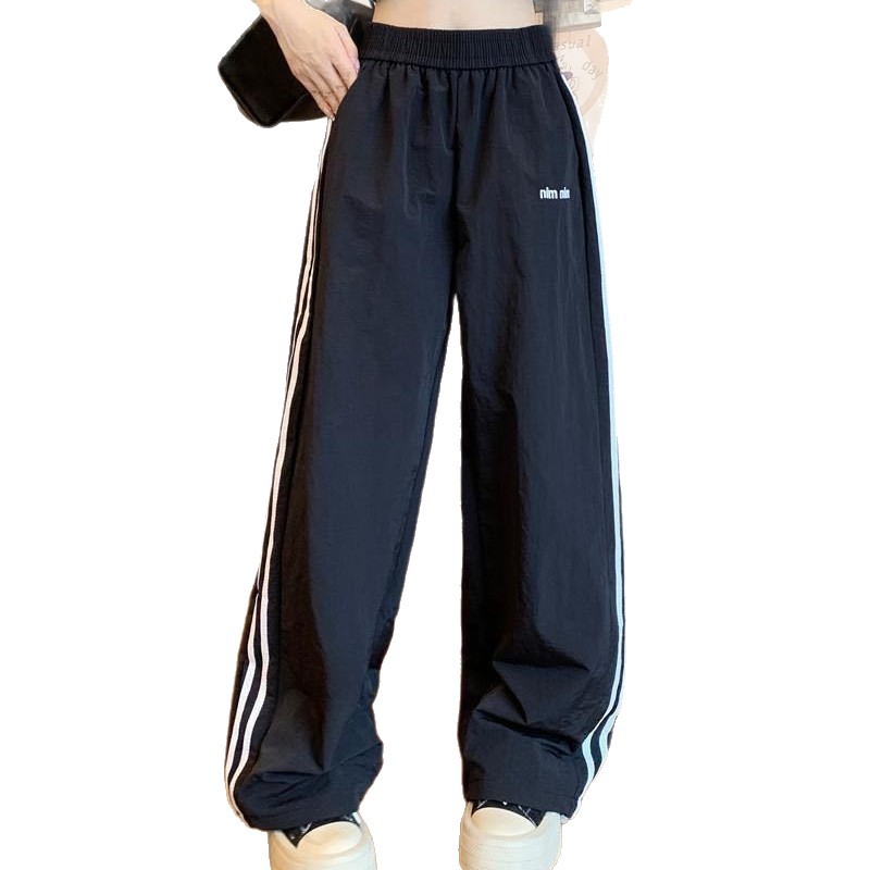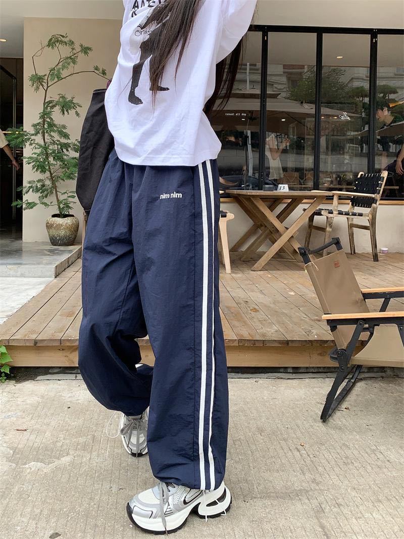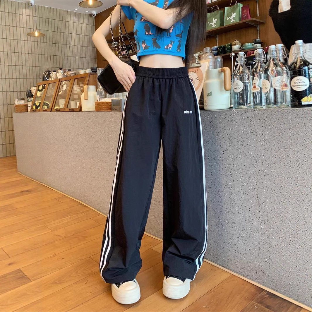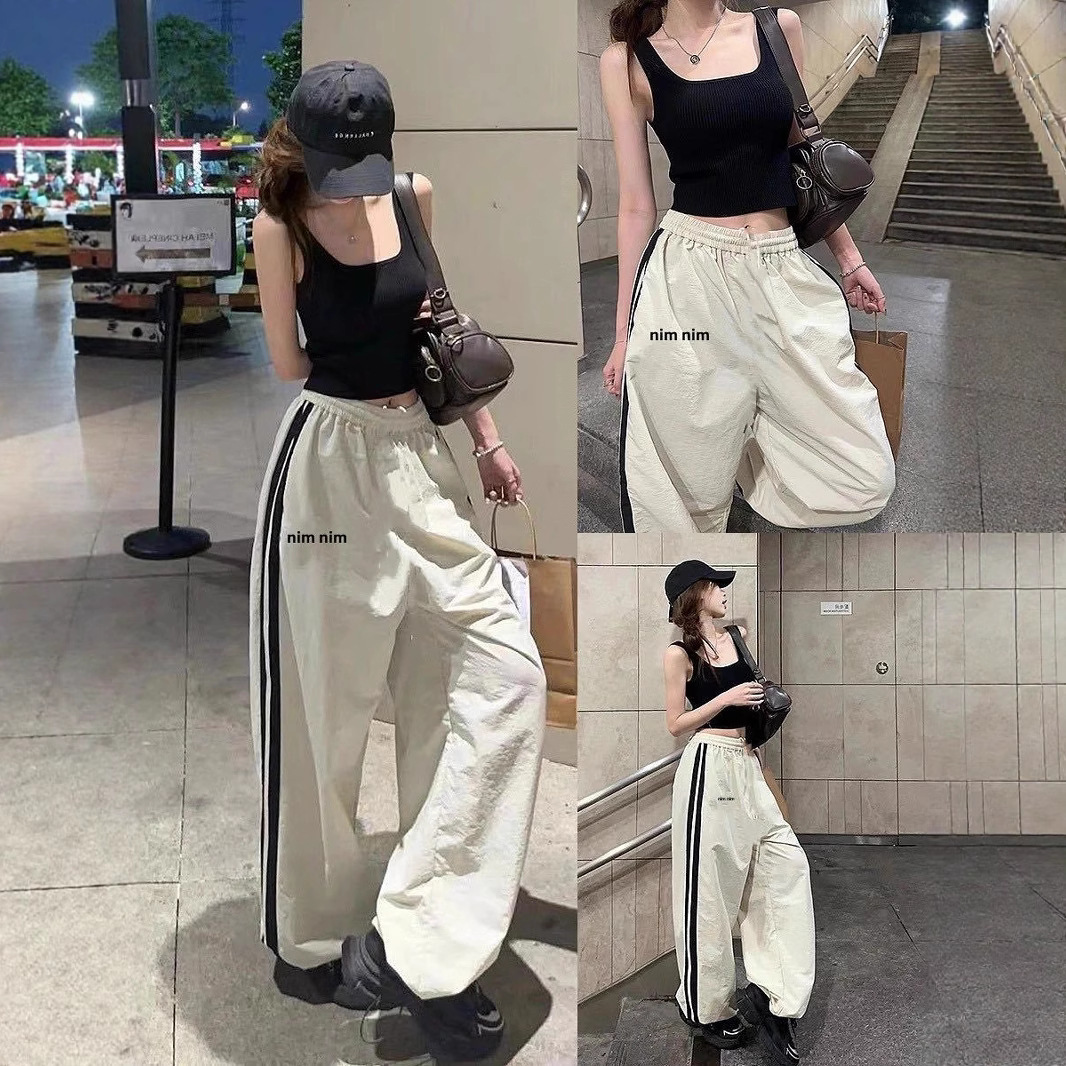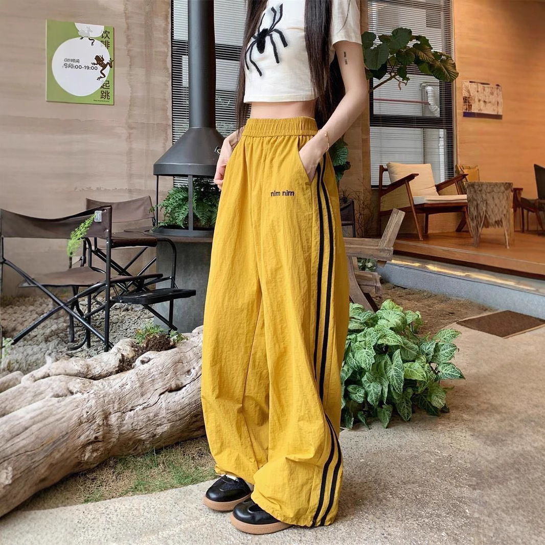 Новые летние быстросохнущие спортивные брюки в американском стиле для женщин, модные повседневные брюки в полоску с цветными блоками и дизайном допамина, прямые брюки.