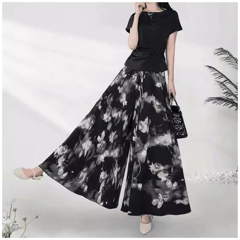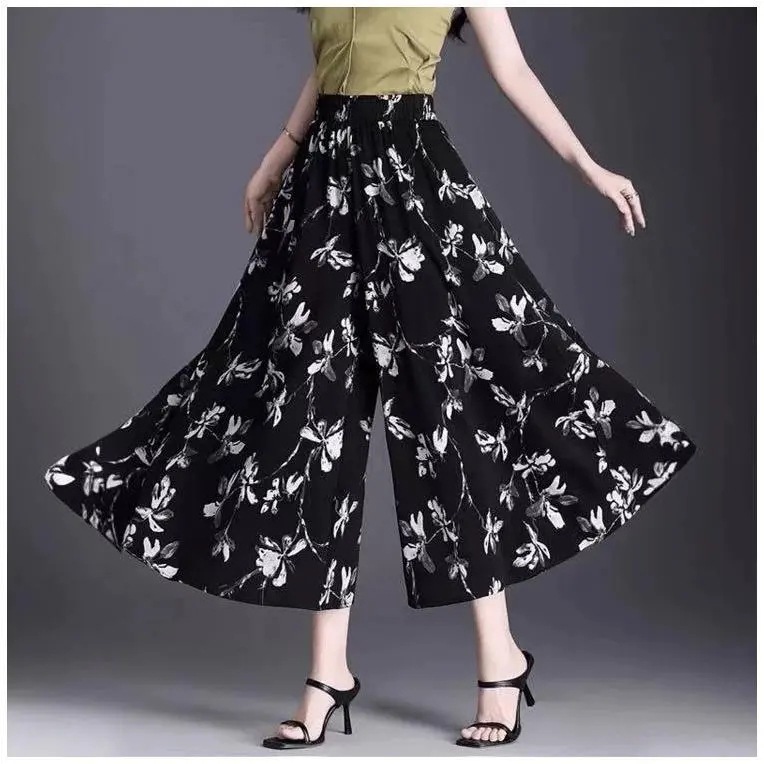 Тонкие летние дышащие повседневные брюки с принтом, брюки-кюлоты, элегантная драпированная эластичная юбка с цветочным принтом, широкие брюки три четверти