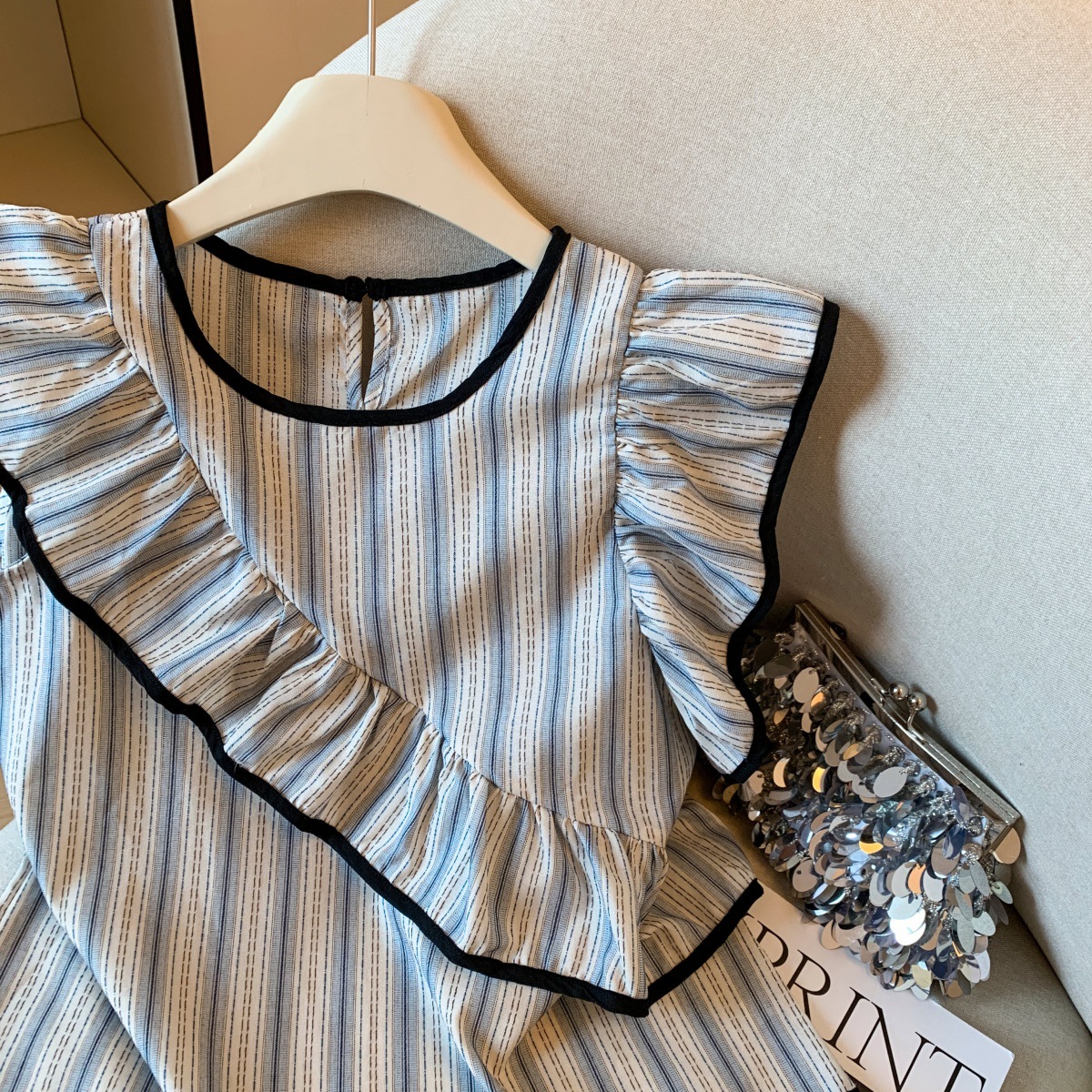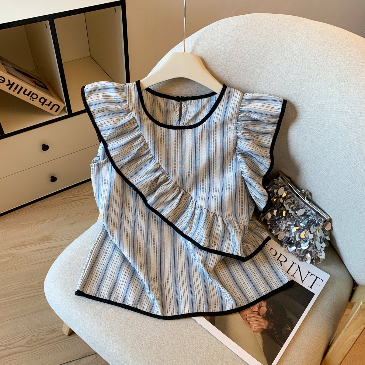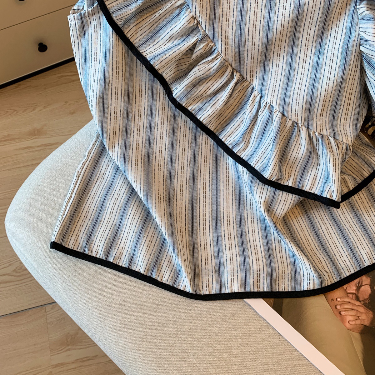 Женский топ с голубыми полосками, лоскутной отделкой, рюшами и рукавами-крылышками, летняя мода 2025 года, утягивающий, омолаживающий, закрывающий руки.