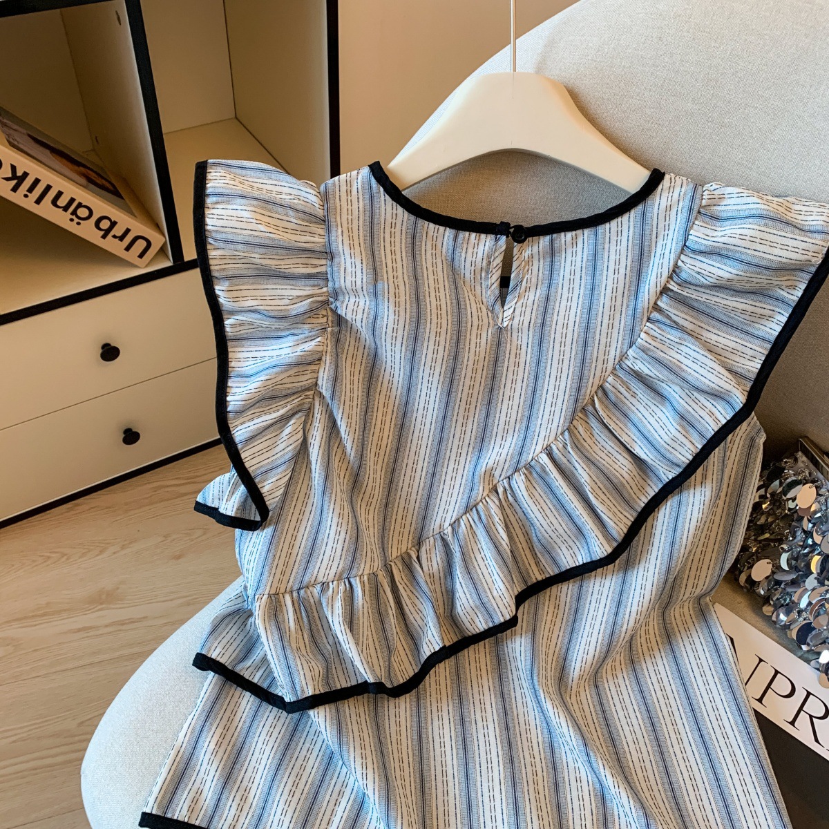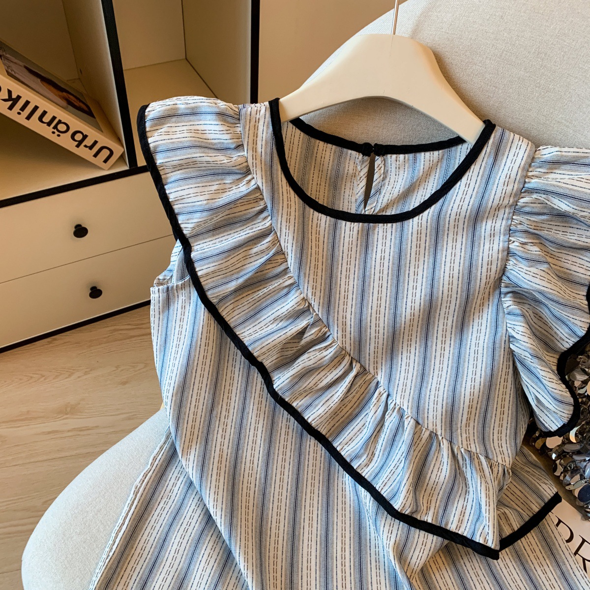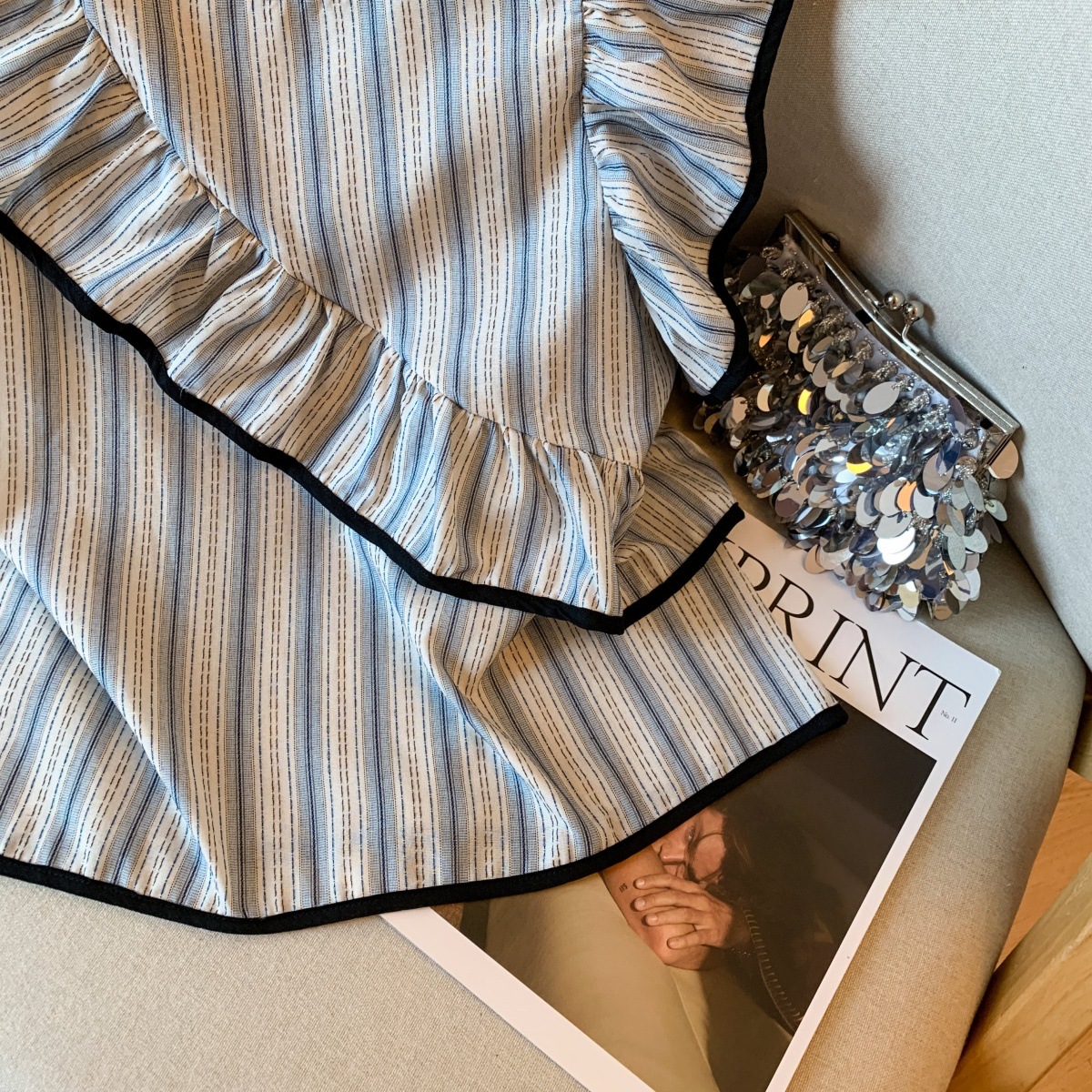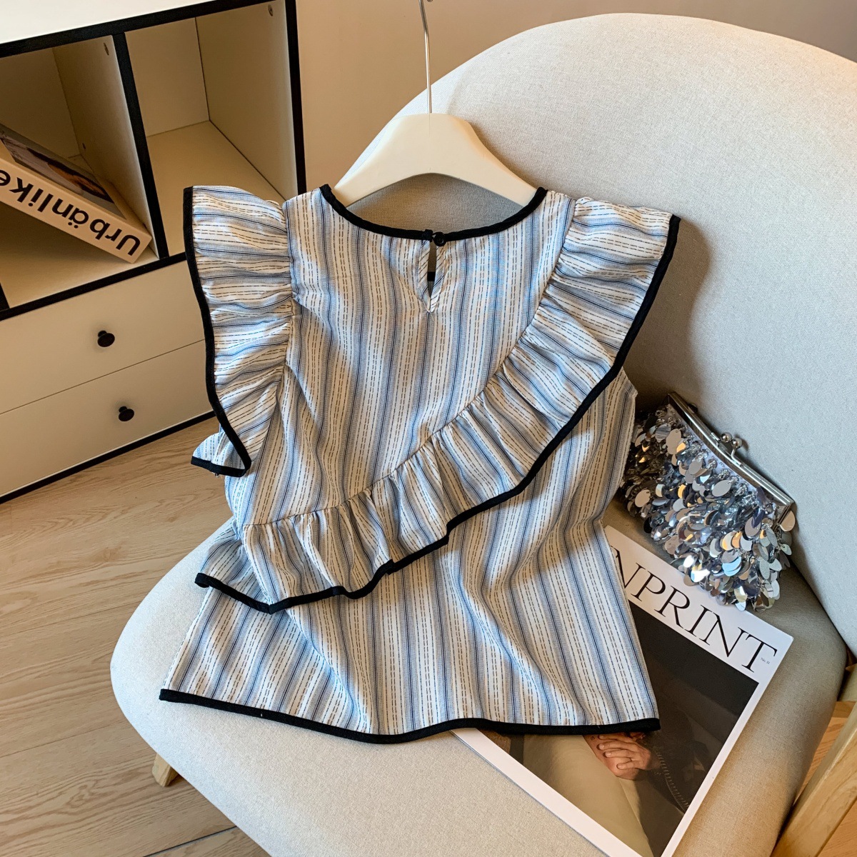 Женский топ с голубыми полосками, лоскутной отделкой, рюшами и рукавами-крылышками, летняя мода 2025 года, утягивающий, омолаживающий, закрывающий руки.