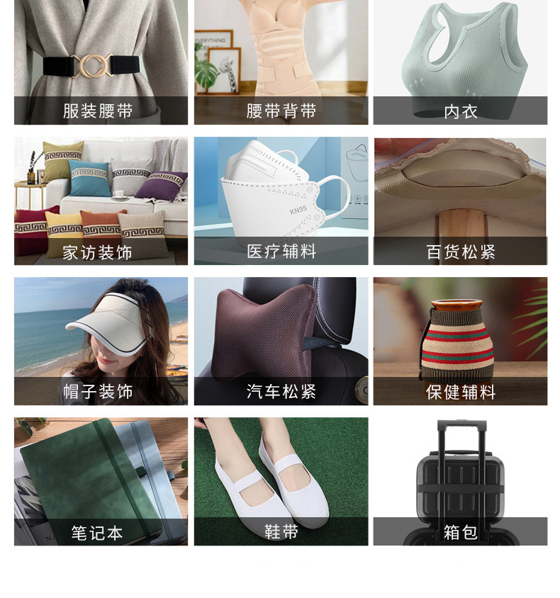 повязка на глаз; защитное снаряжение; шляпа; шапочка для душа; повязка на голову; одежда; ручное вязание; Домашний текстиль; бахилы; стакан с водой; одежда; защитная одежда; батут; медицинские принадлежности; Аксессуары для одежды; метка веревки; чемодан; Спортивные товары; Обувь; Упаковка ювелирных изделий; Промышленное использование; строка подарочного пакета; повязка для волос; Уличные палатки; Сушка одежды, упаковка, связывание