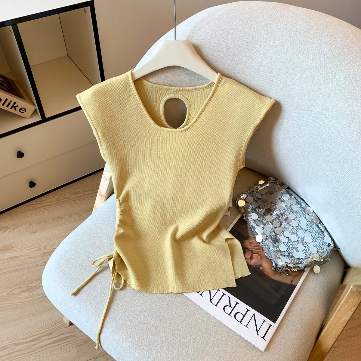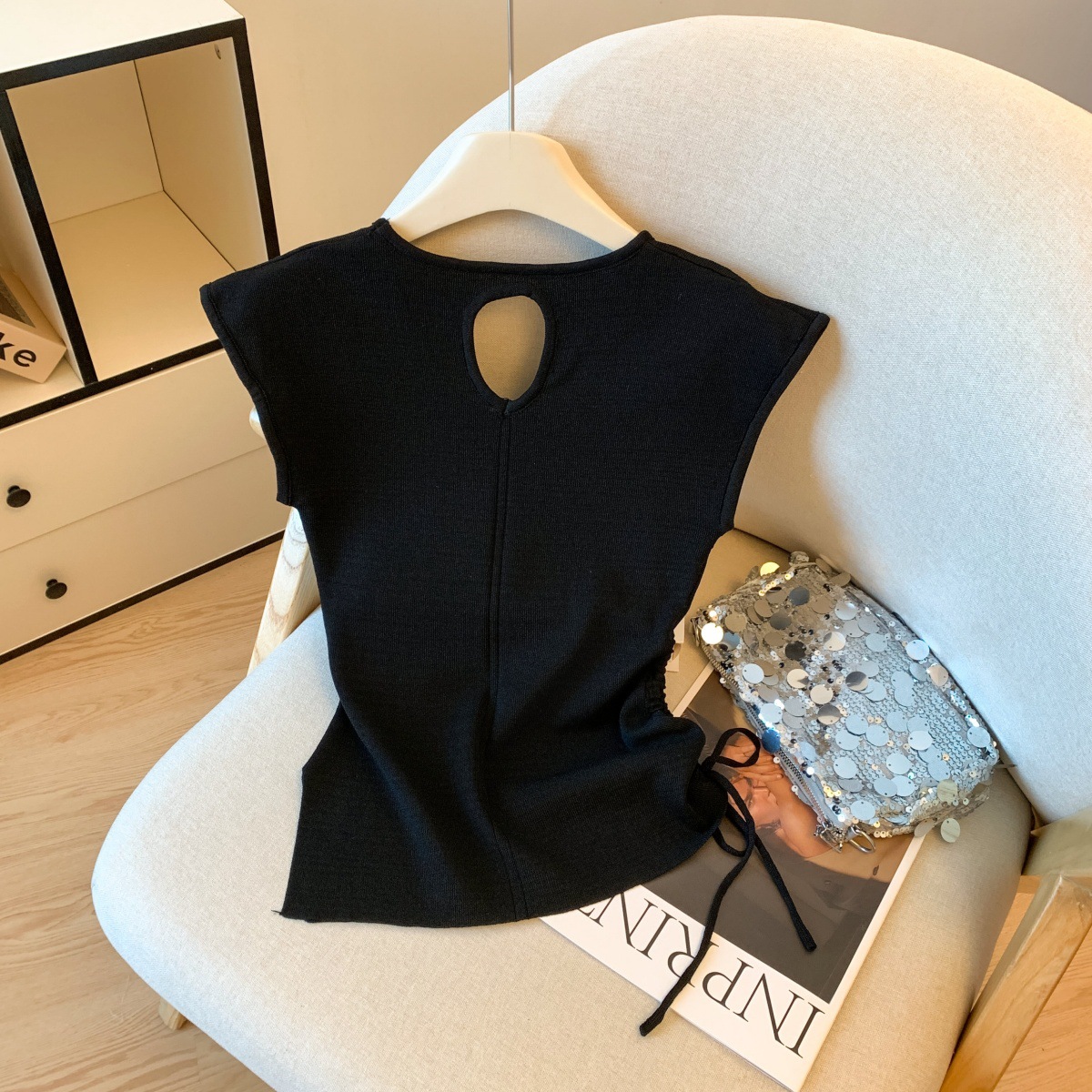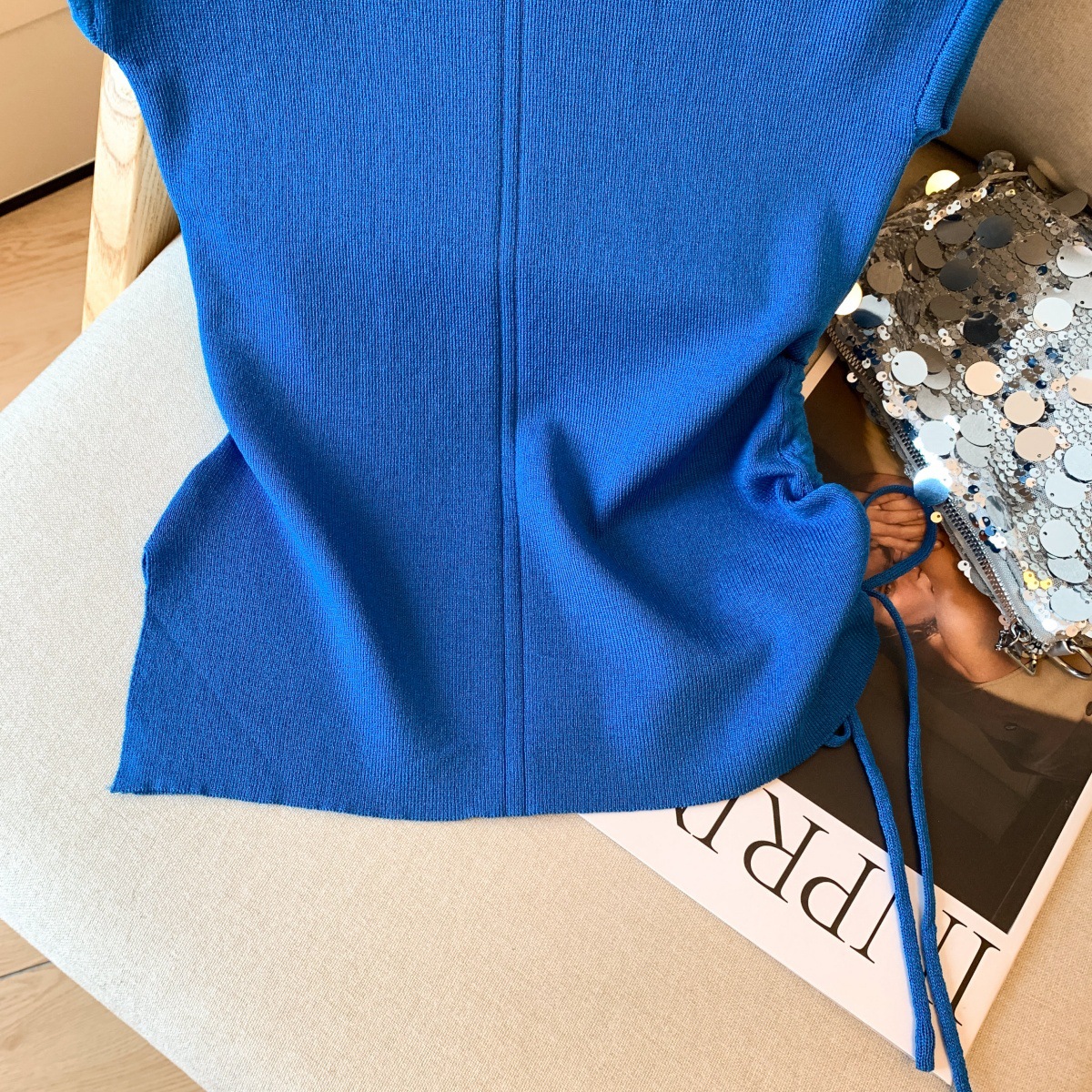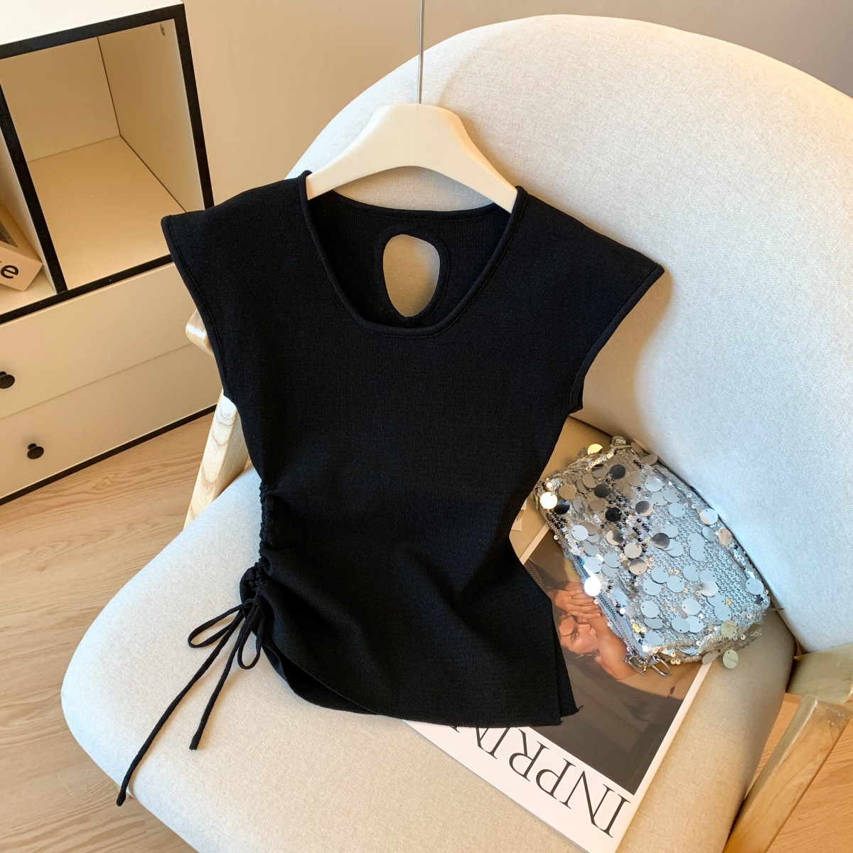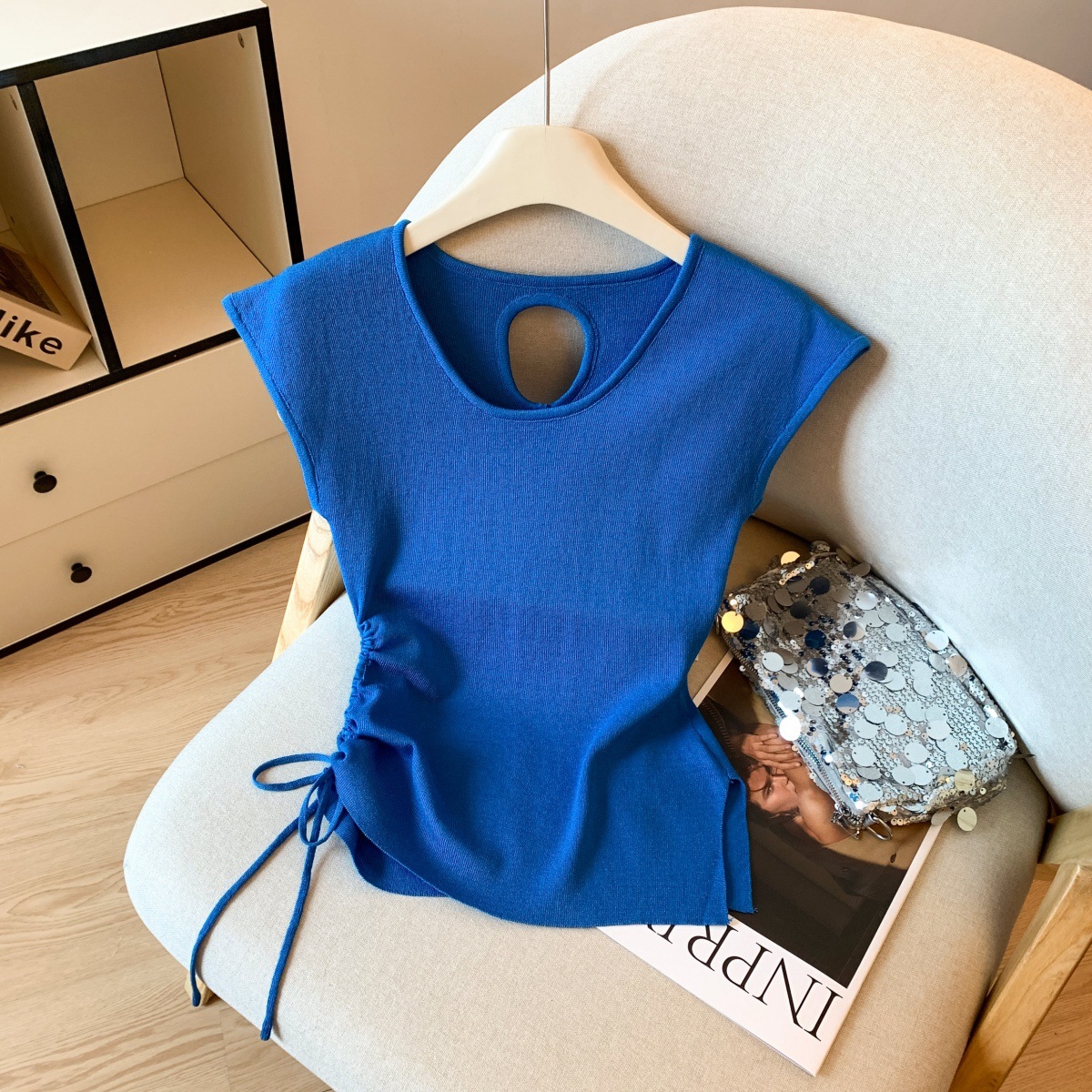 Настоящая фотография корейского трикотажа из полого ледяного шелка для женщин, облегающий крой, шнурок, асимметричный дизайн, топ с короткими рукавами.