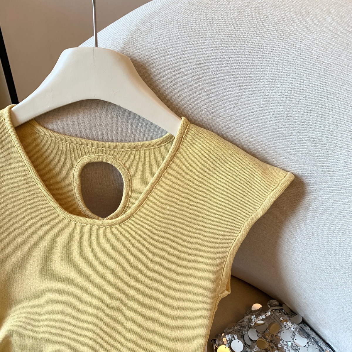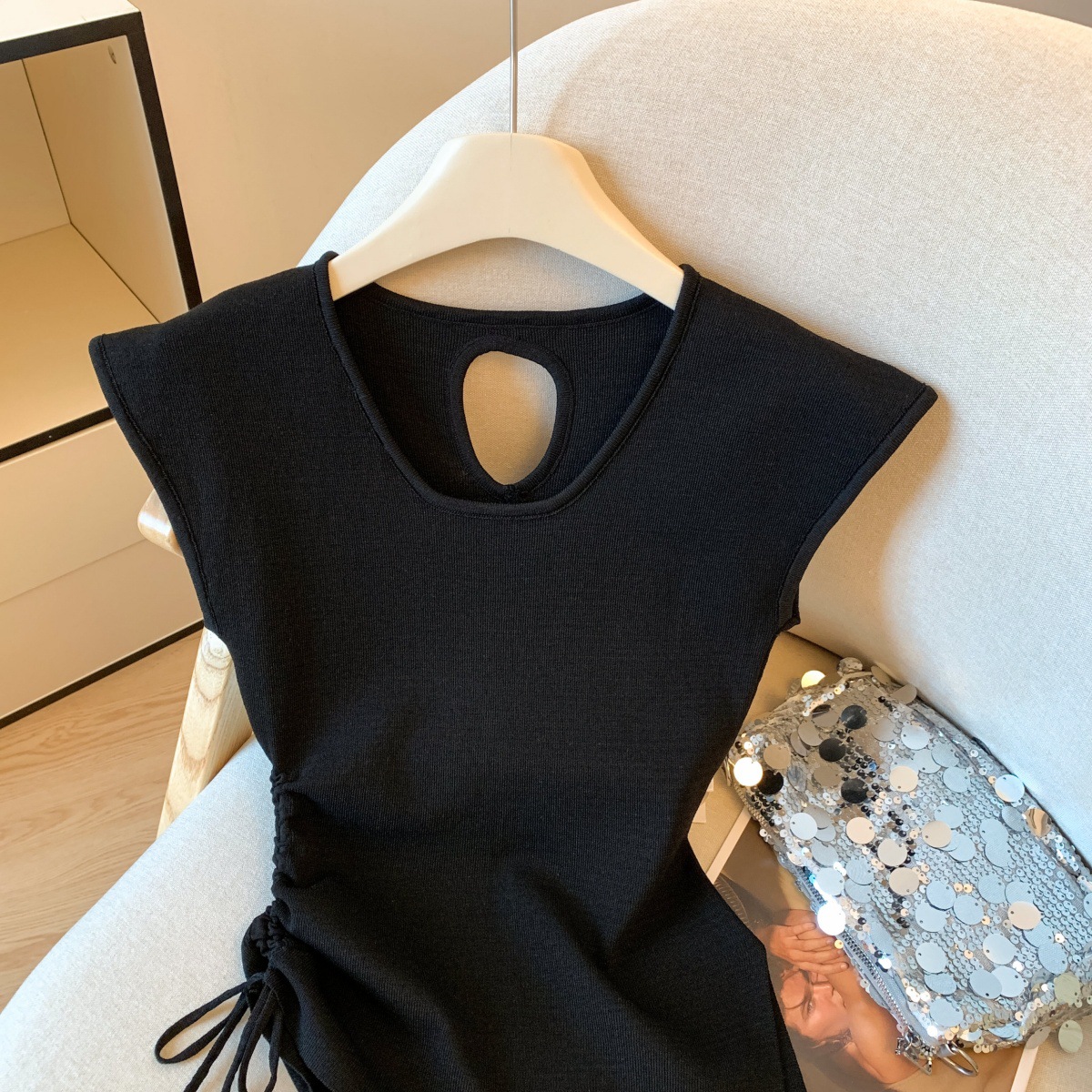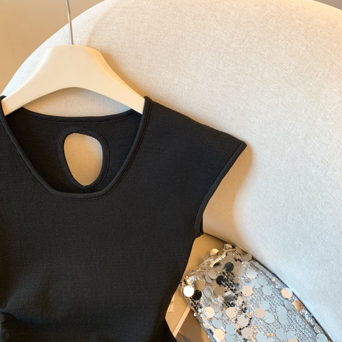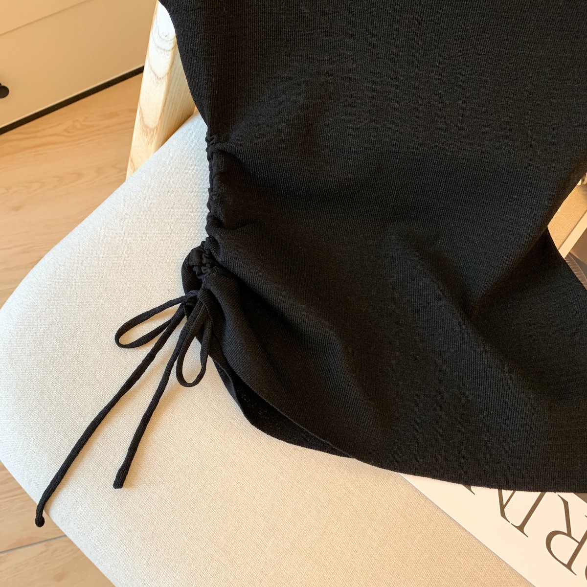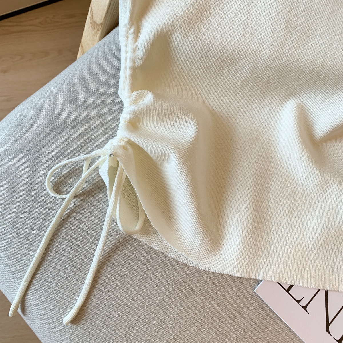 Настоящая фотография корейского трикотажа из полого ледяного шелка для женщин, облегающий крой, шнурок, асимметричный дизайн, топ с короткими рукавами.