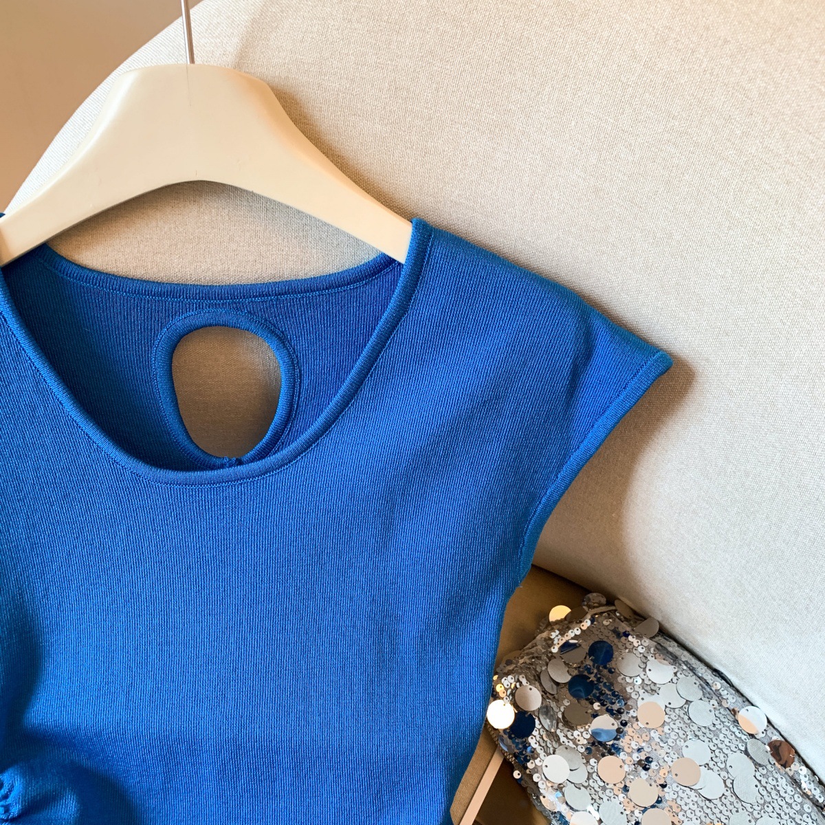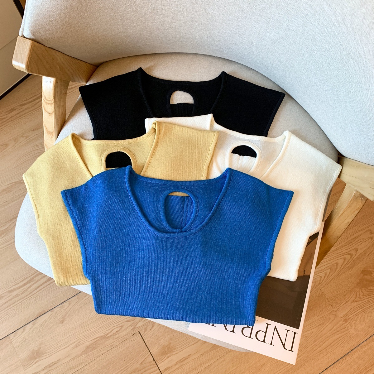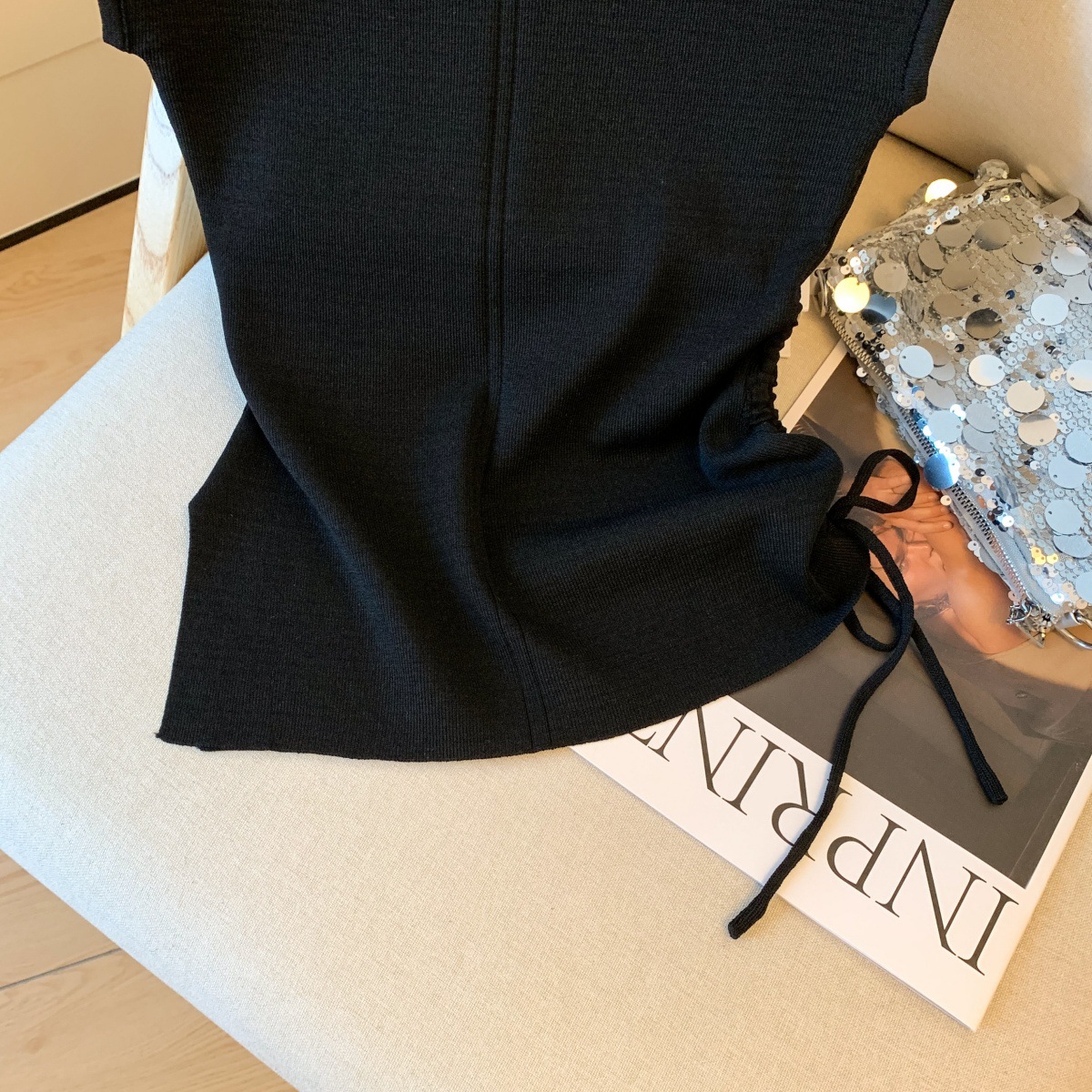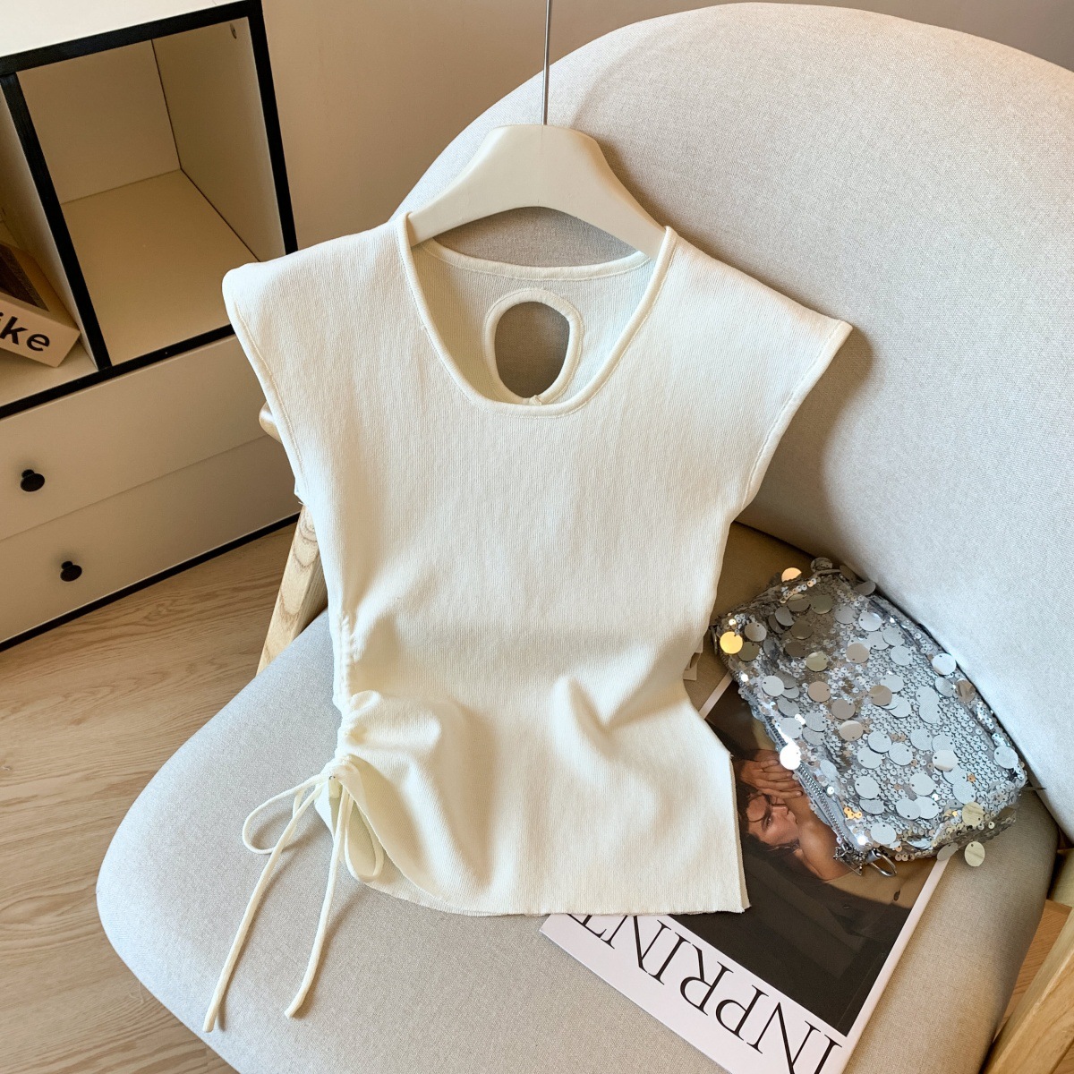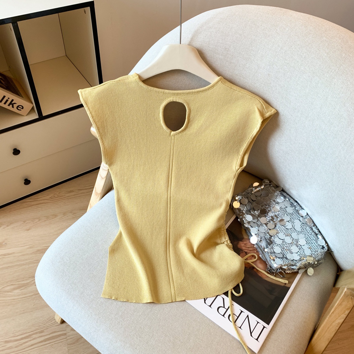 Настоящая фотография корейского трикотажа из полого ледяного шелка для женщин, облегающий крой, шнурок, асимметричный дизайн, топ с короткими рукавами.
