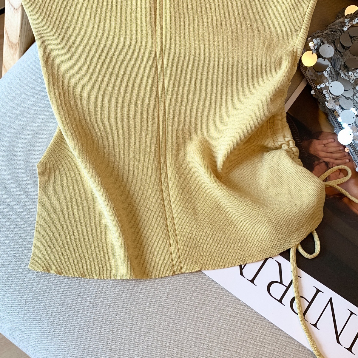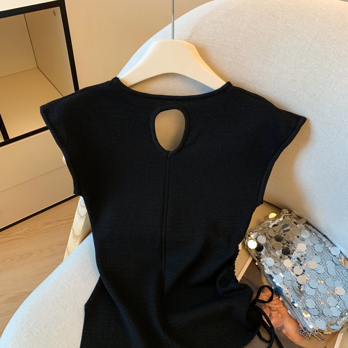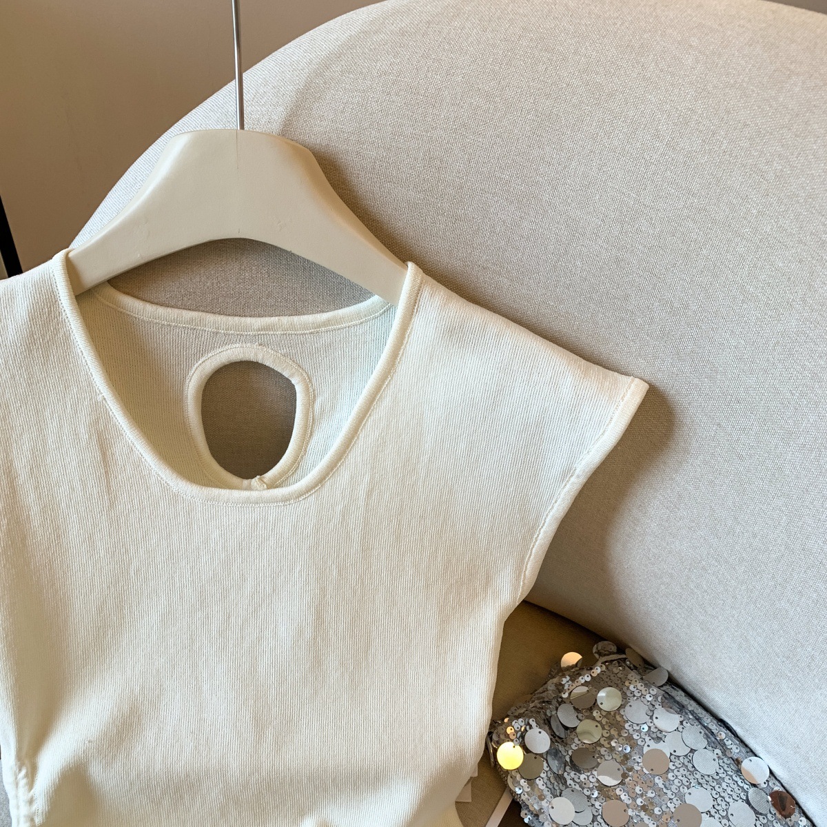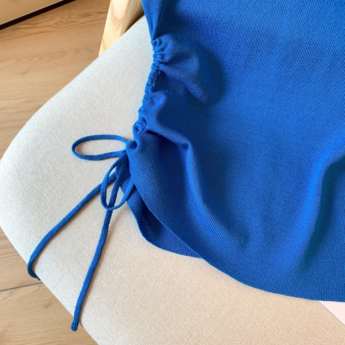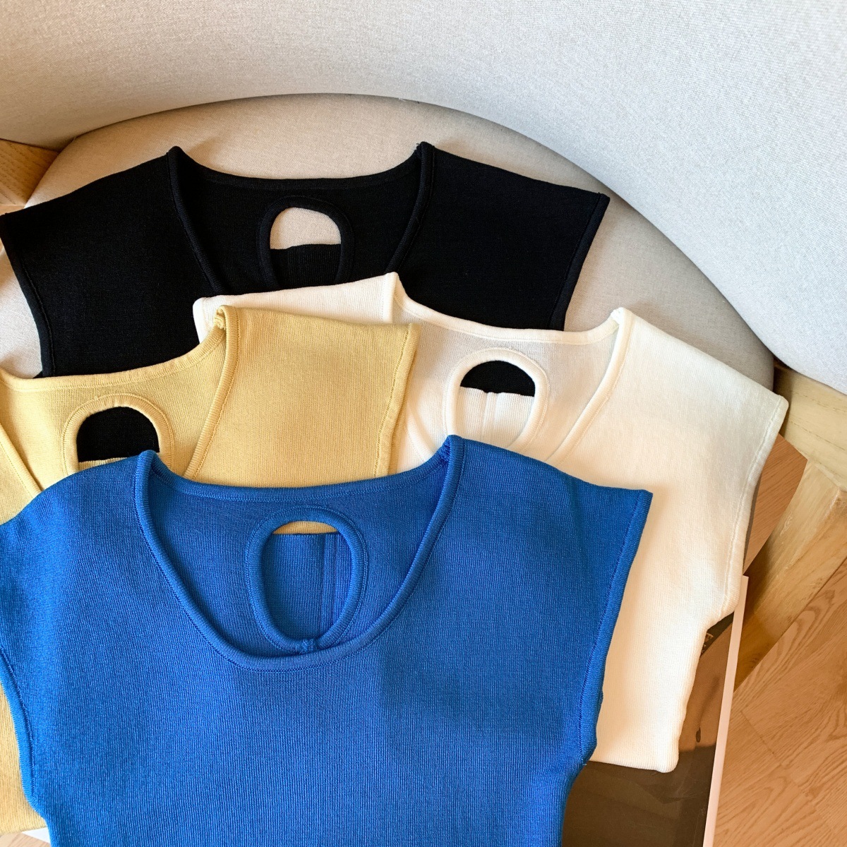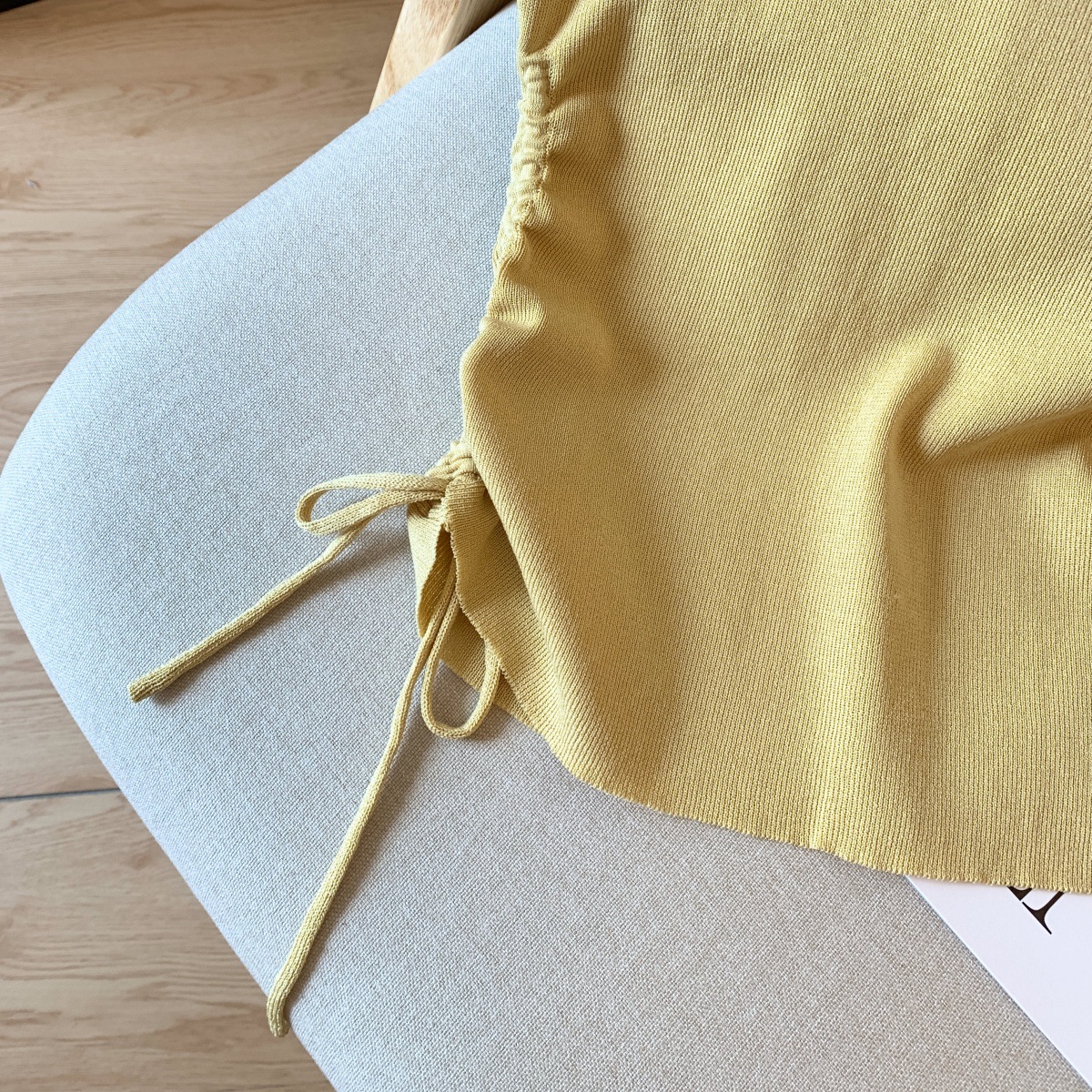 Настоящая фотография корейского трикотажа из полого ледяного шелка для женщин, облегающий крой, шнурок, асимметричный дизайн, топ с короткими рукавами.
