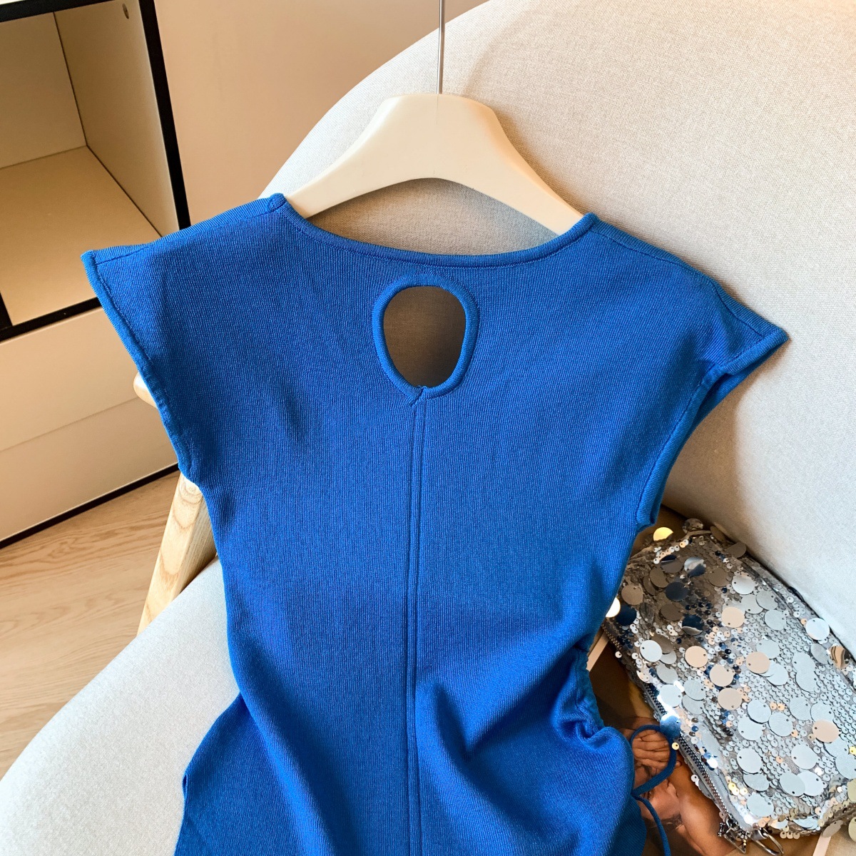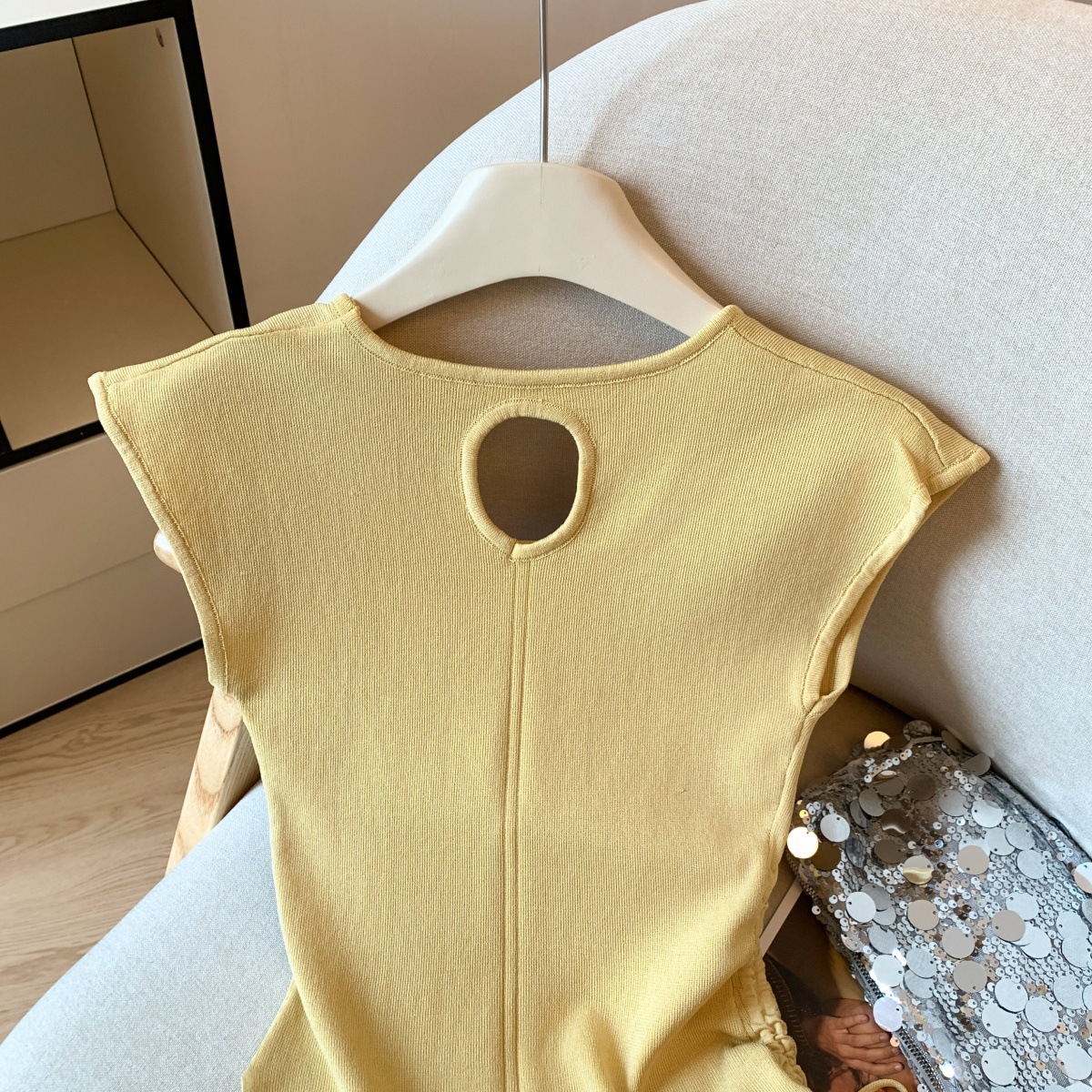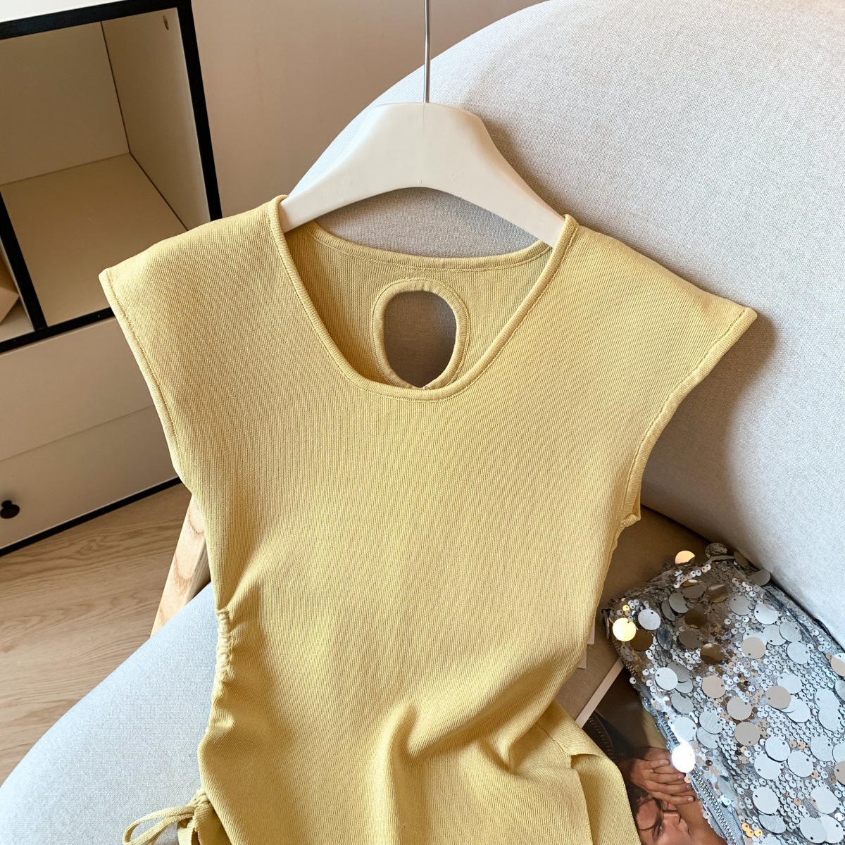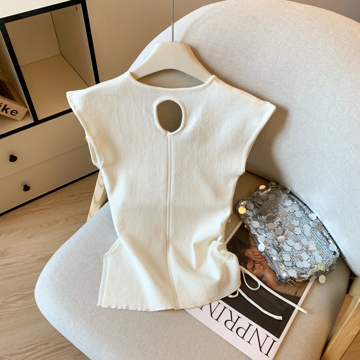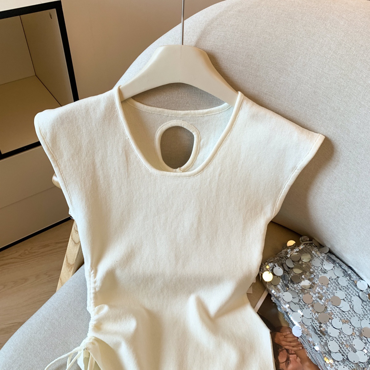 Настоящая фотография корейского трикотажа из полого ледяного шелка для женщин, облегающий крой, шнурок, асимметричный дизайн, топ с короткими рукавами.