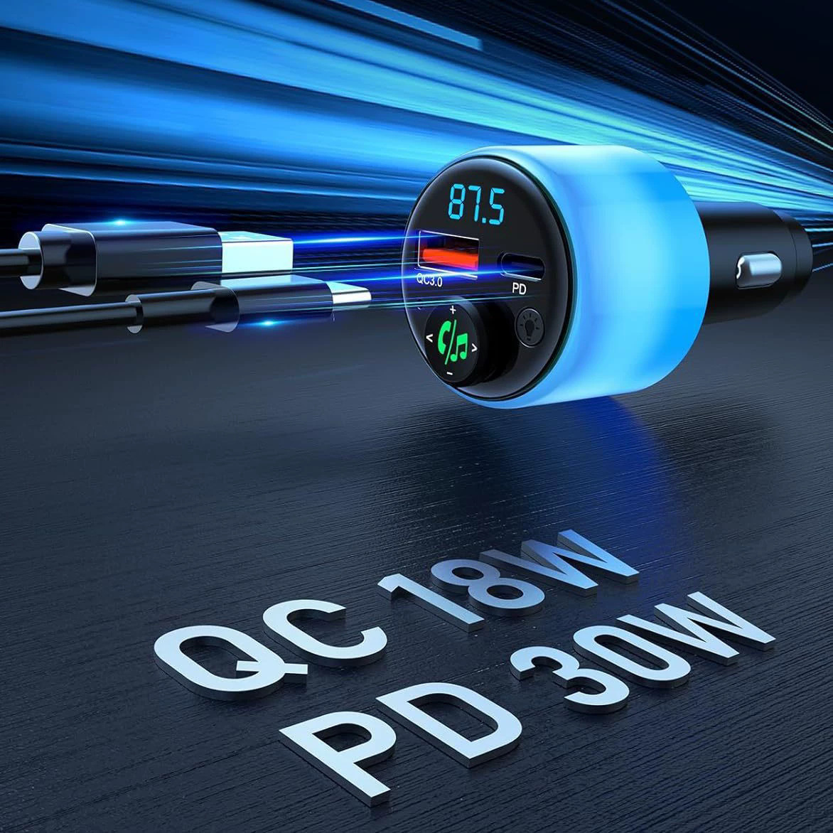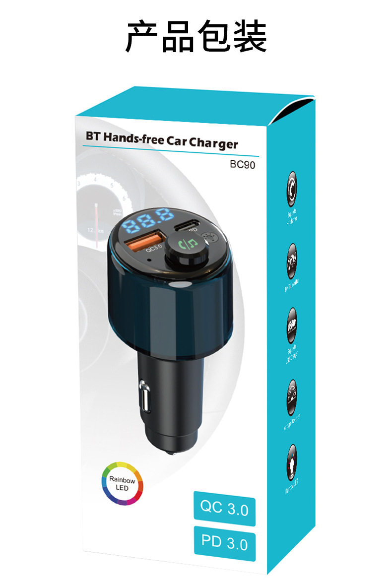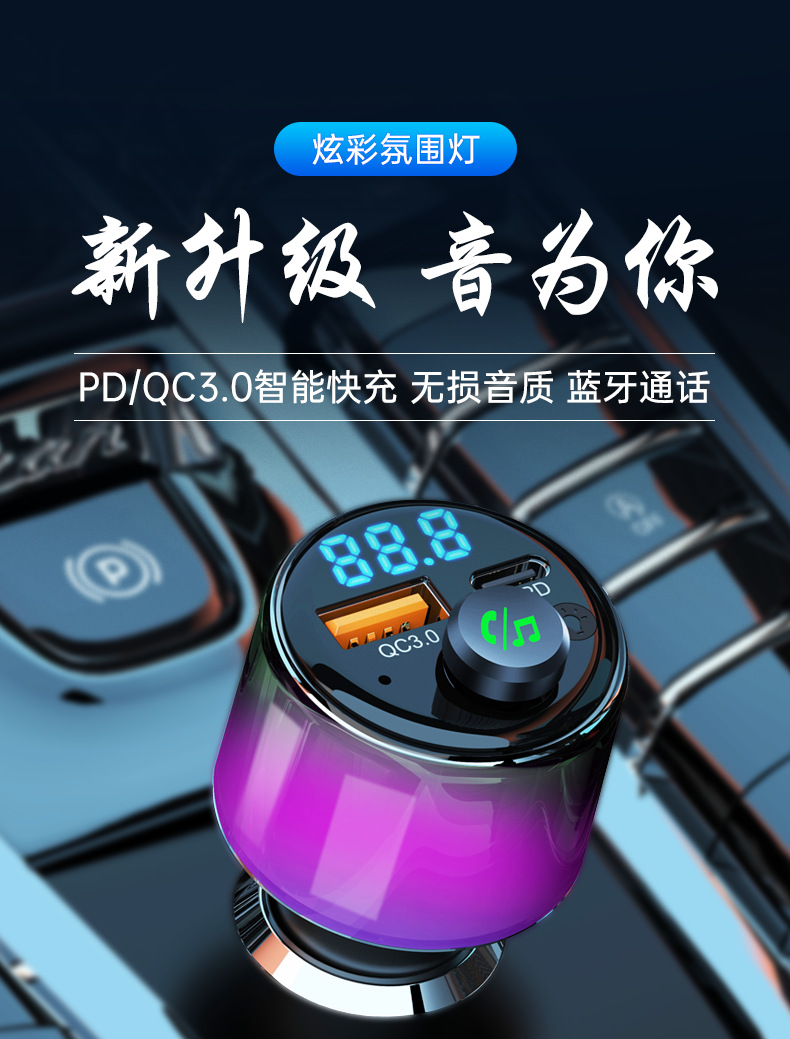 车载蓝牙发射器车载MP3 FM 蓝牙车充 PD30W+QC18W快充 氛围灯BC90