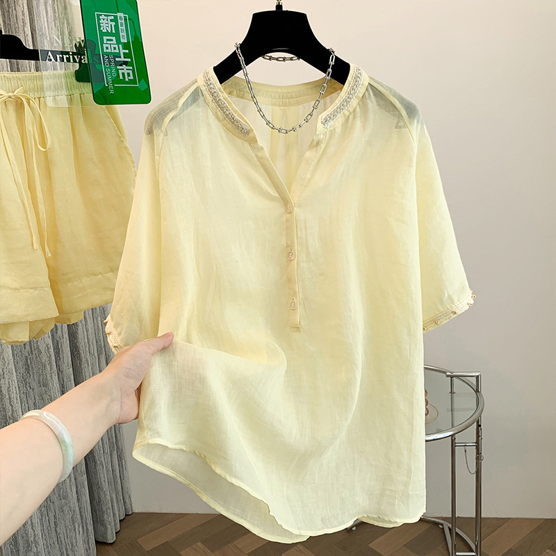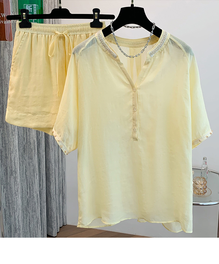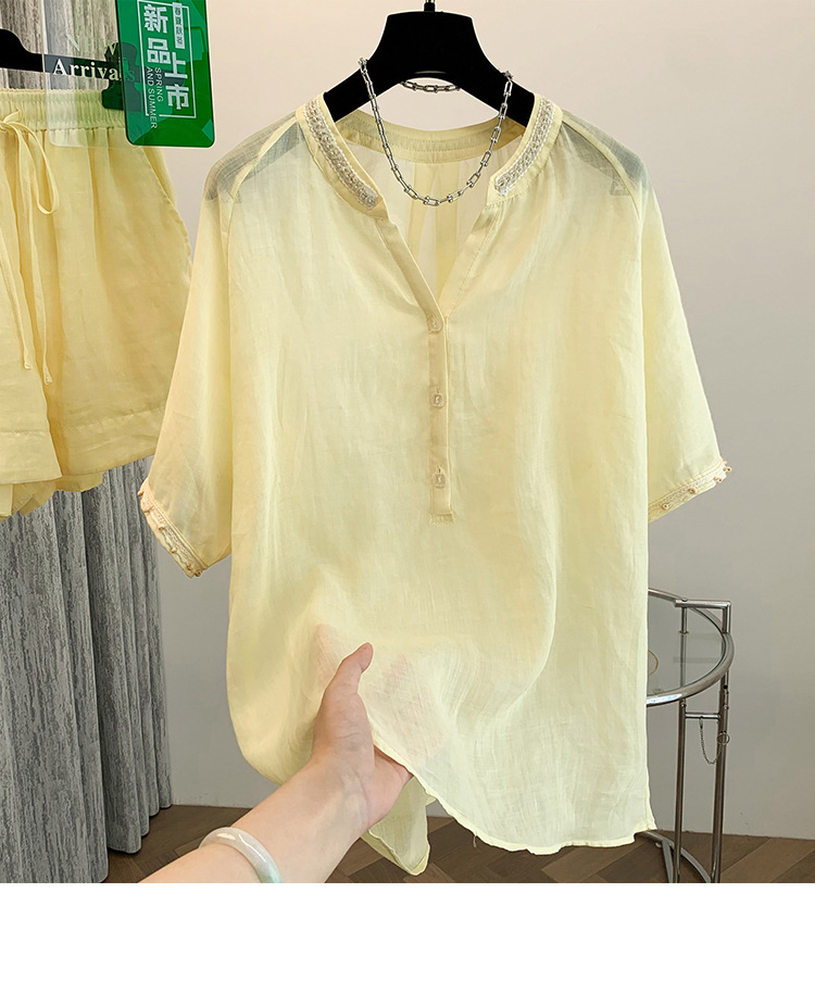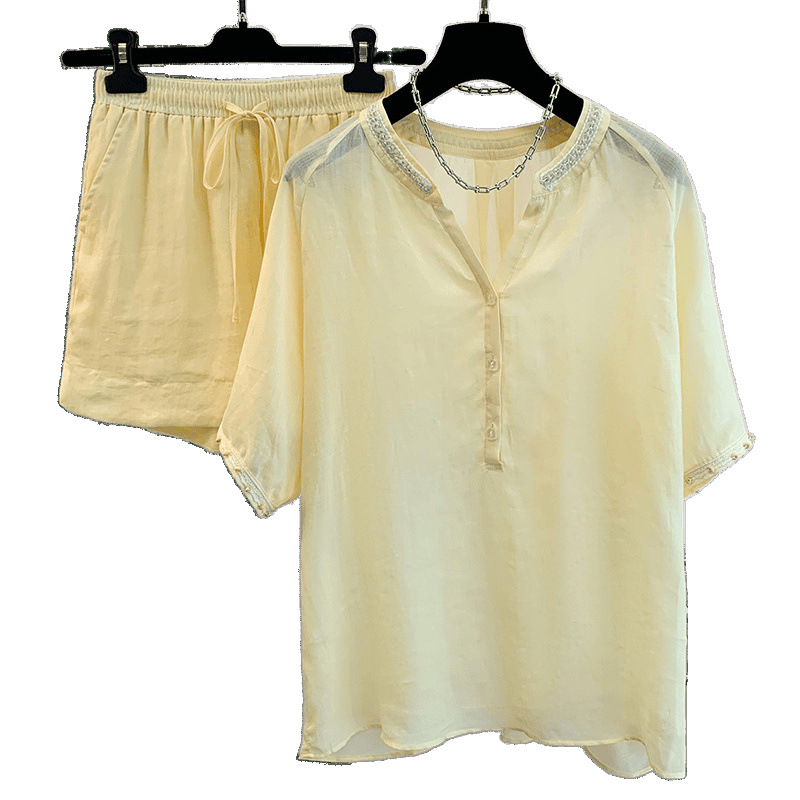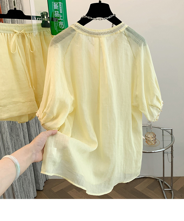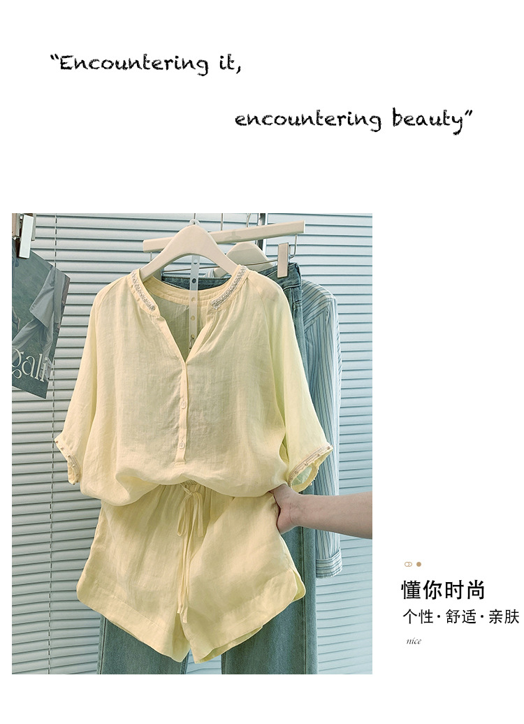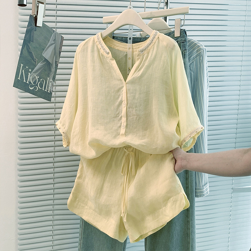 Настоящее фото нового повседневного женского костюма из чистого хлопка, рубашки с бисером, универсальных шорт с короткими рукавами и свободного топа в ленивом стиле.
