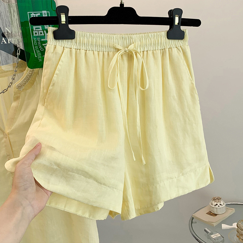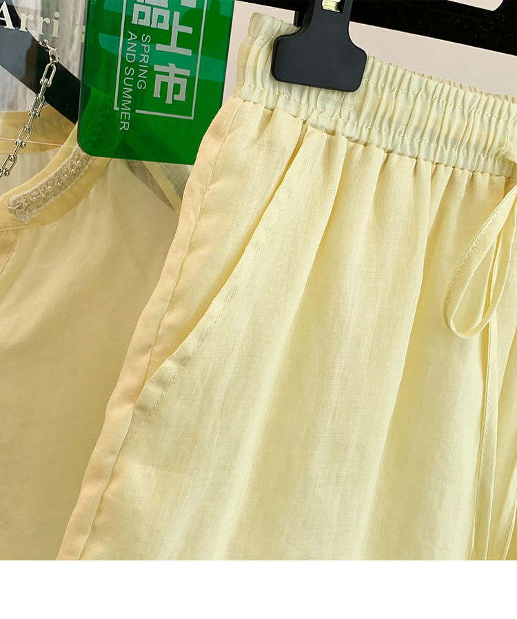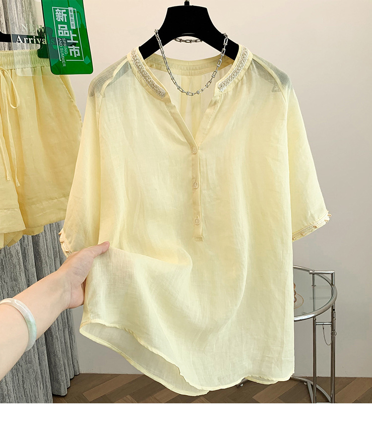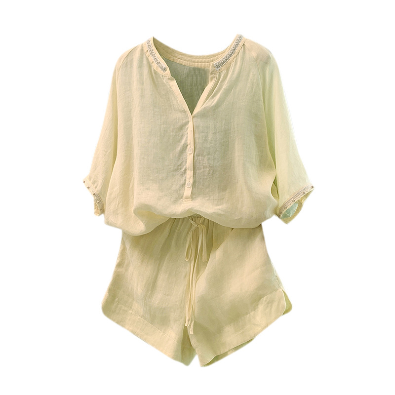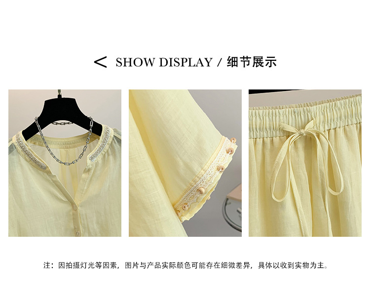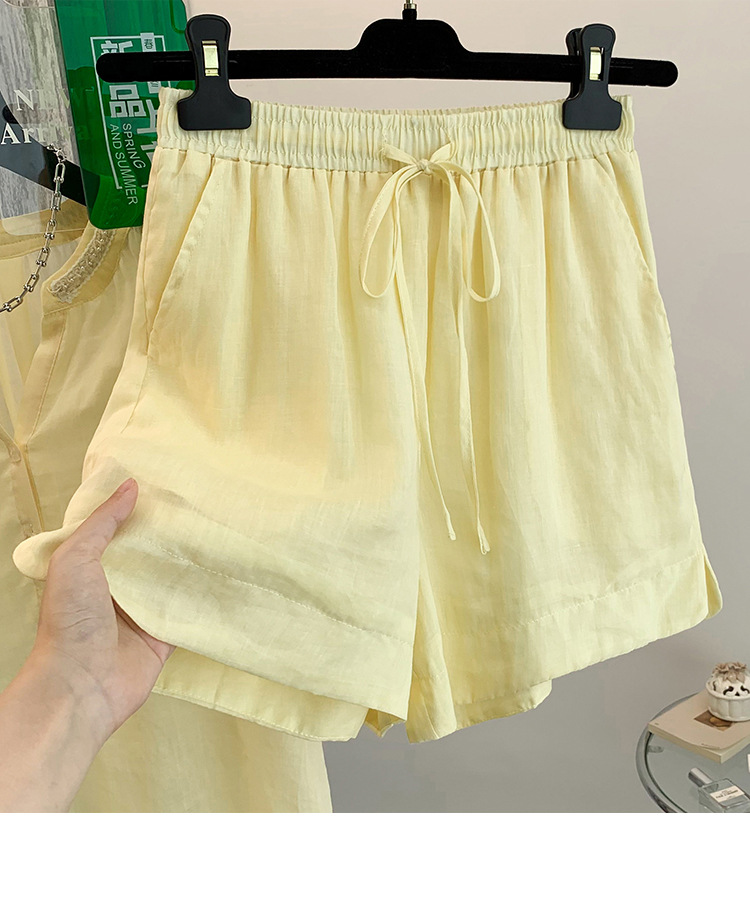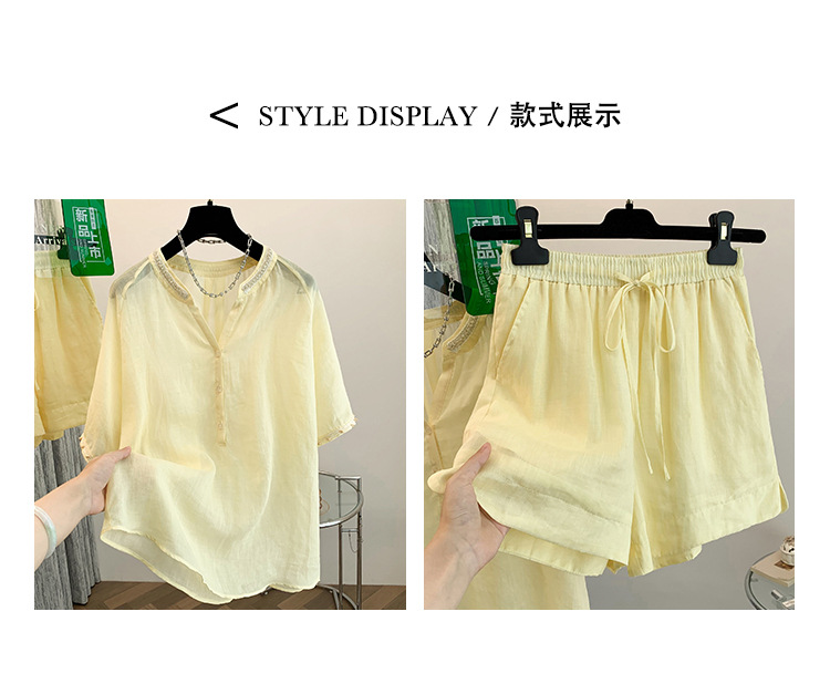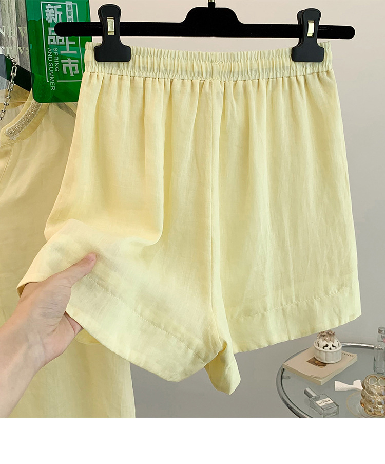 Настоящее фото нового повседневного женского костюма из чистого хлопка, рубашки с бисером, универсальных шорт с короткими рукавами и свободного топа в ленивом стиле.