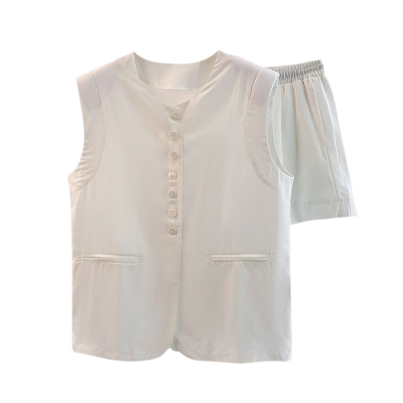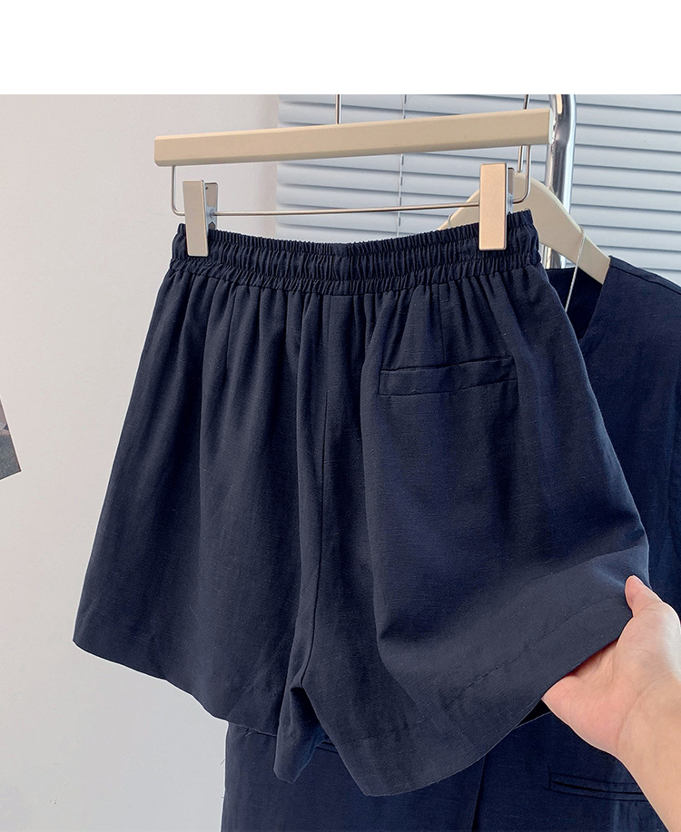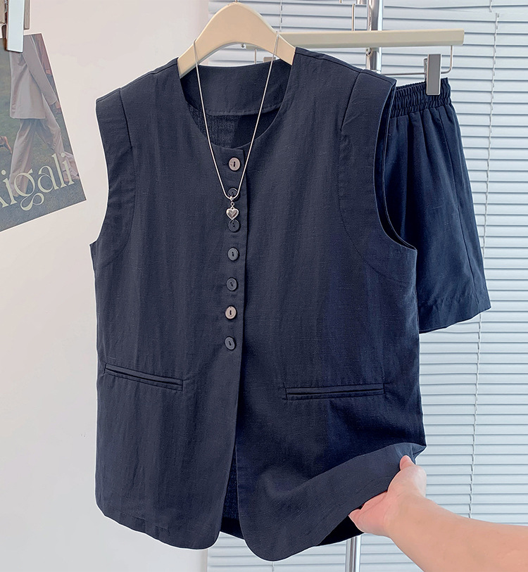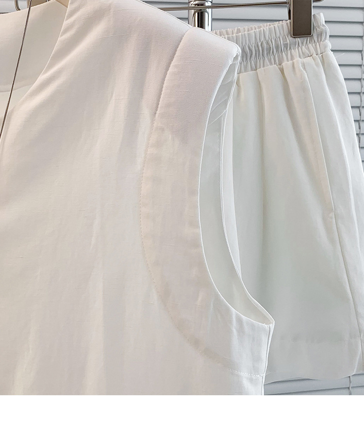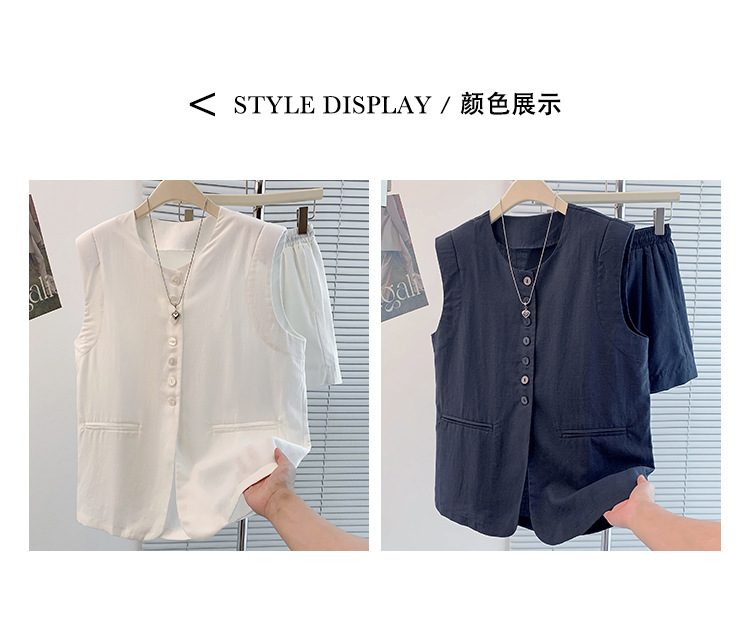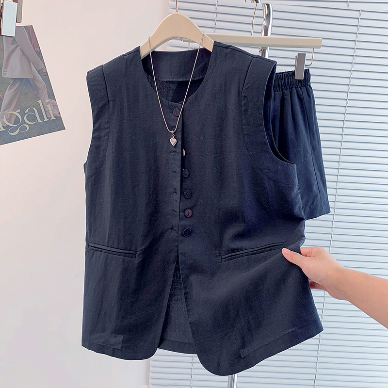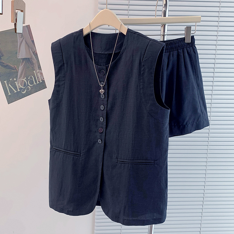 Настоящая фотография европейского льняного жилета без рукавов с эластичными шортами, модный женский костюм из двух предметов, повседневный элегантный комплект