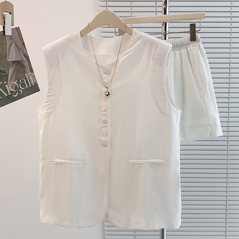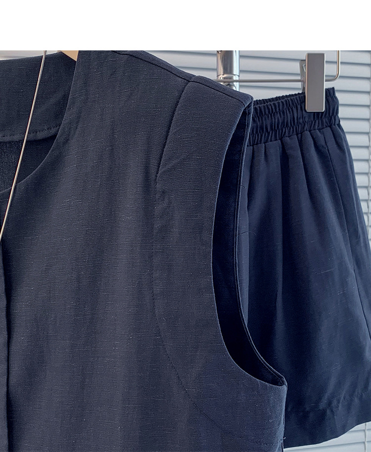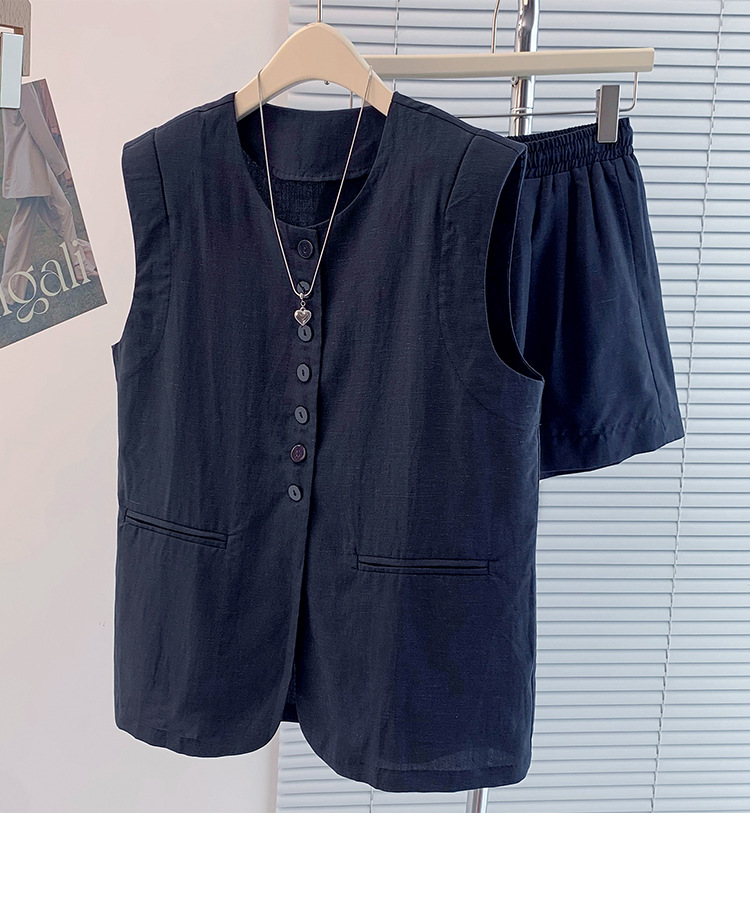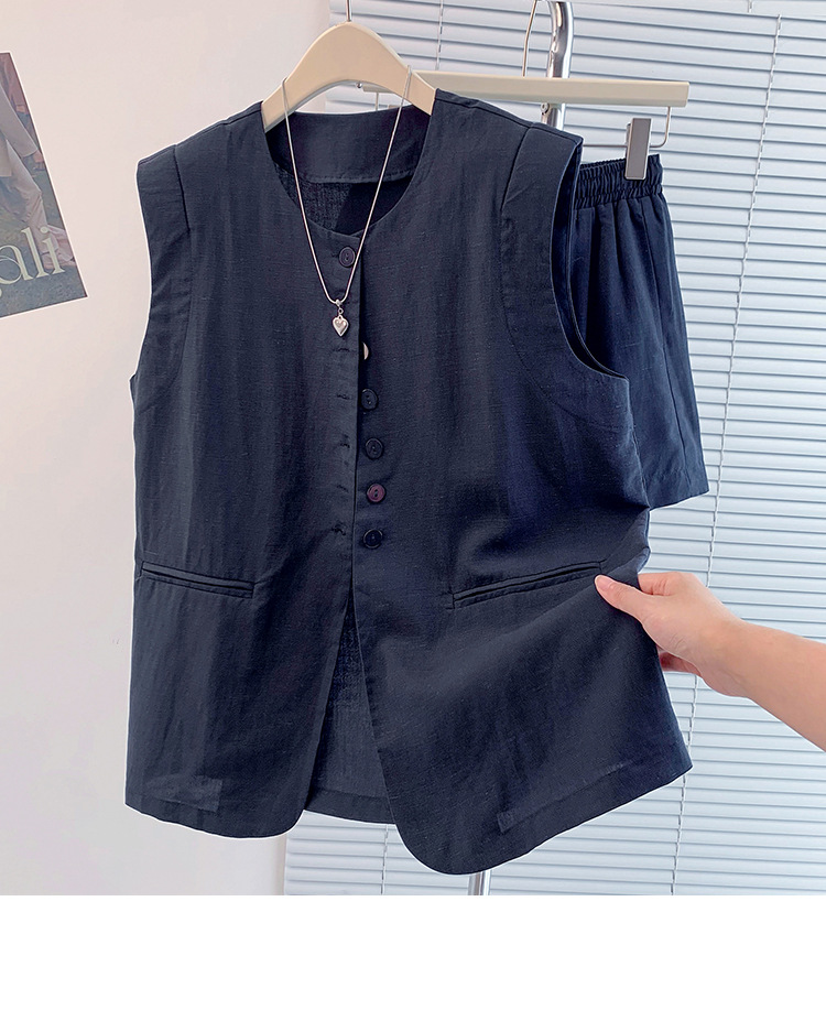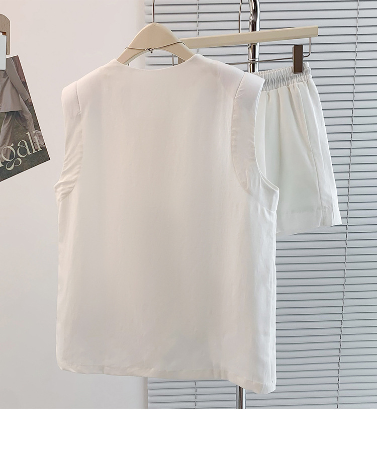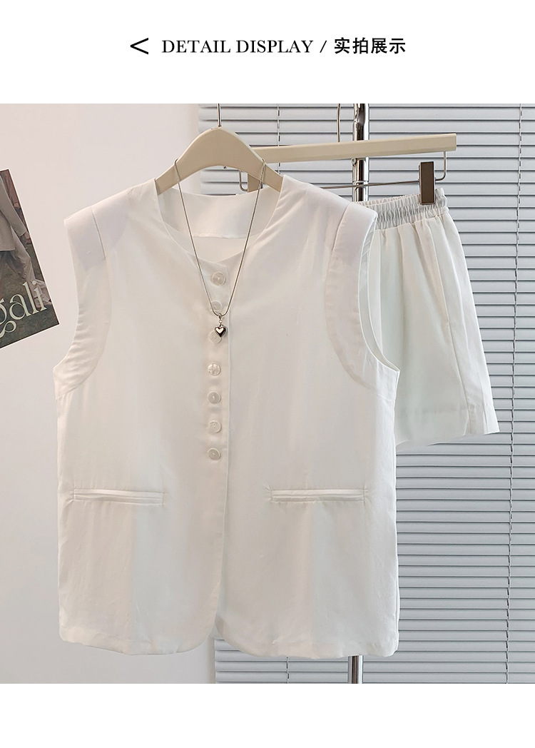 Настоящая фотография европейского льняного жилета без рукавов с эластичными шортами, модный женский костюм из двух предметов, повседневный элегантный комплект
