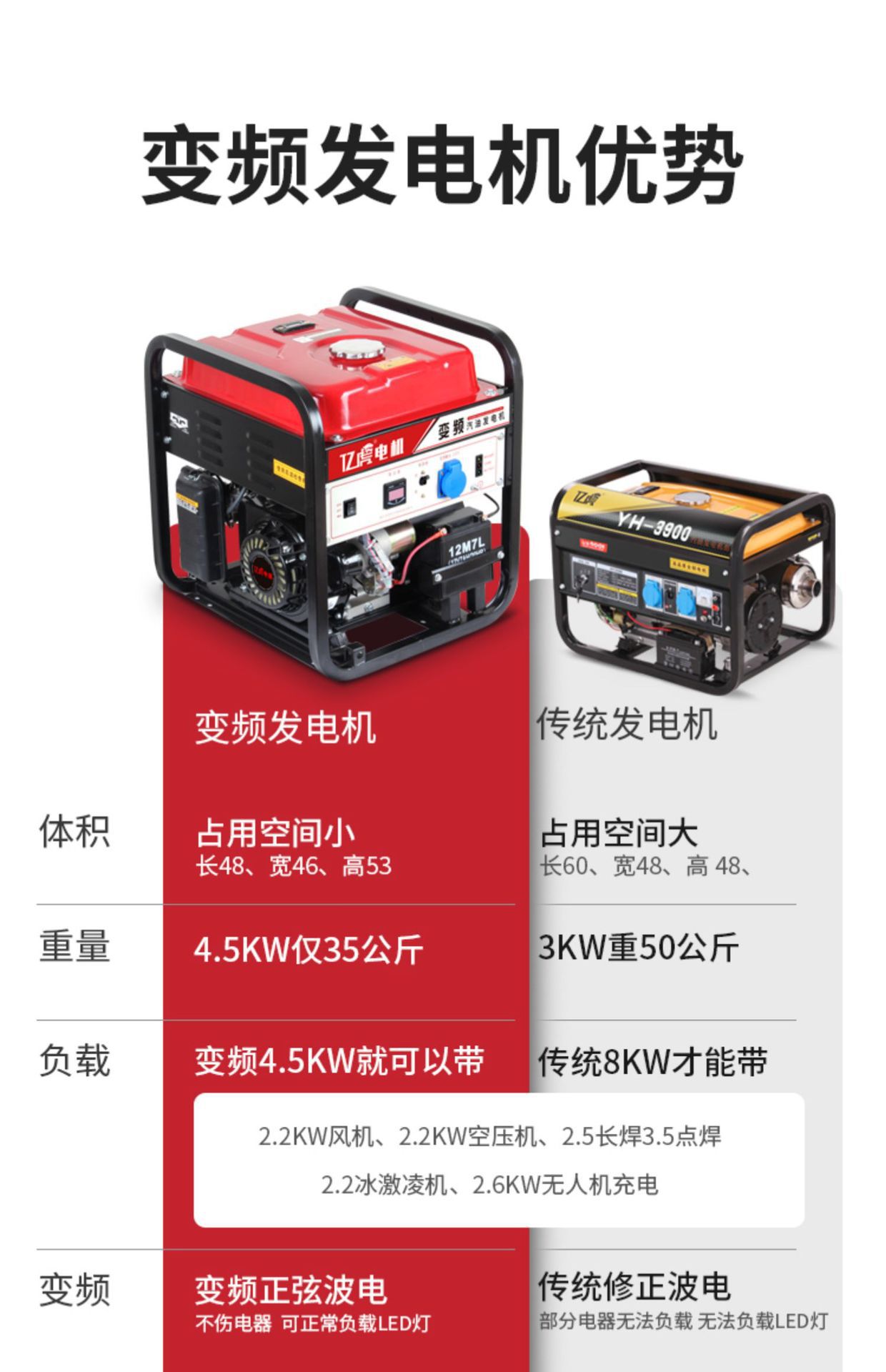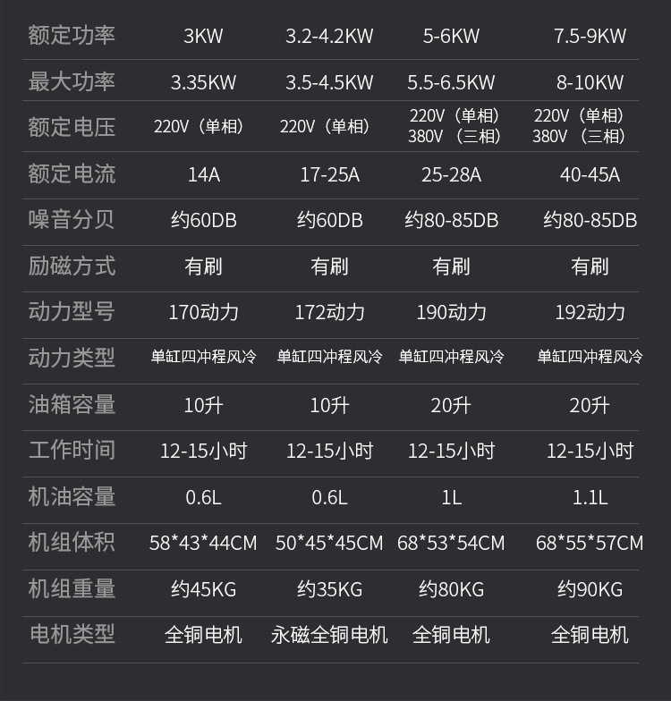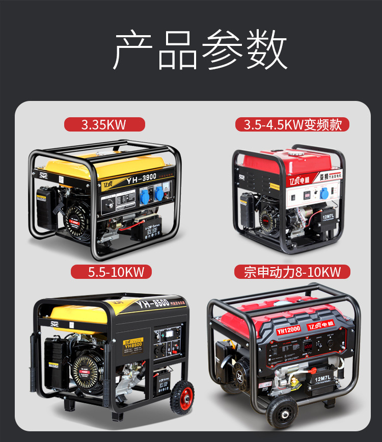 3000 Вт [ручной запуск] 220 В; 3000 Вт [Фонарик с двойным запуском] 220 В; 4000 Вт [ручной запуск] 220 В; 4000 Вт [Фонарик с двойным запуском] 220 В; 4000 Вт [ручной запуск] 220 В (с маховиком); 4000 Вт [Двойной запуск фонарика] 220 В (с маховиком); Преобразование частоты 3500 Вт [ручной запуск] 220 В; Преобразование частоты 4200 Вт [ручной запуск] 220 В; Преобразование частоты 4200 Вт [двойной запуск фонарика] 220 В; Преобразование частоты 4500 Вт [двойной запуск фонарика] 220 В; Преобразование частоты 5500 Вт [ручной запуск] 220 В; 5500 Вт [ручной запуск] 220 В; 5500 Вт [Фонарик с двойным запуском] 220 В; 6500 Вт [Фонарик с двойным запуском] 220 В; 8 кВт [ручной запуск] 220 В; 8 кВт [Двойной запуск фонарика] 220 В; 10 кВт [Двойной запуск фонарика] 220 В; Zongshen Power 8 кВт [Фонарик с двойным запуском] 220 В; Zongshen Power 10 кВт [Фонарик с двойным запуском] 220 В; 8 кВт [Фонарик с двойным запуском] Двойное напряжение 220 В/380 В; 10 кВт [Двойной запуск фонарика] Двойное напряжение 220 В/380 В; Zongshen Power 8 кВт [Электрический двойной запуск] Двойное напряжение 220 В/380 В; Zongshen Power 10 кВт [Электрический двойной запуск] Двойное напряжение 220 В/380 В