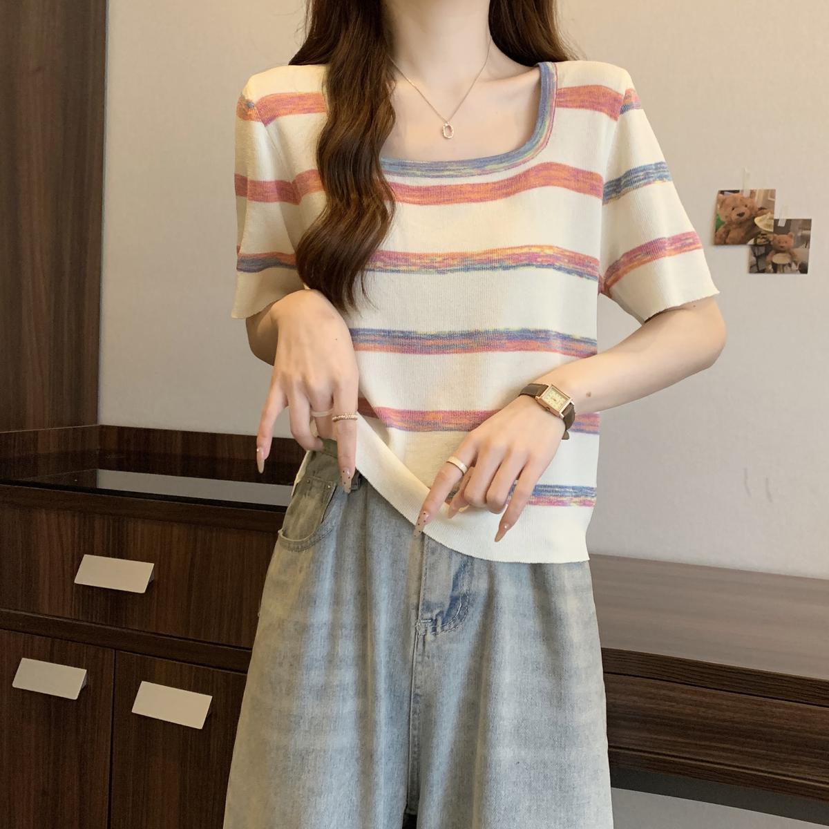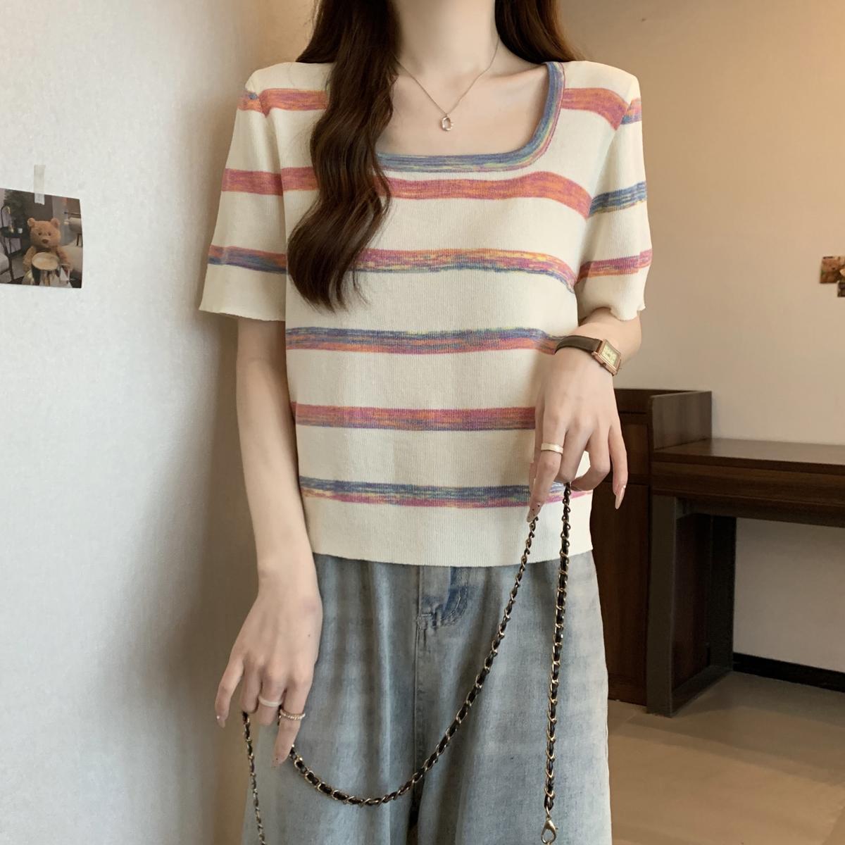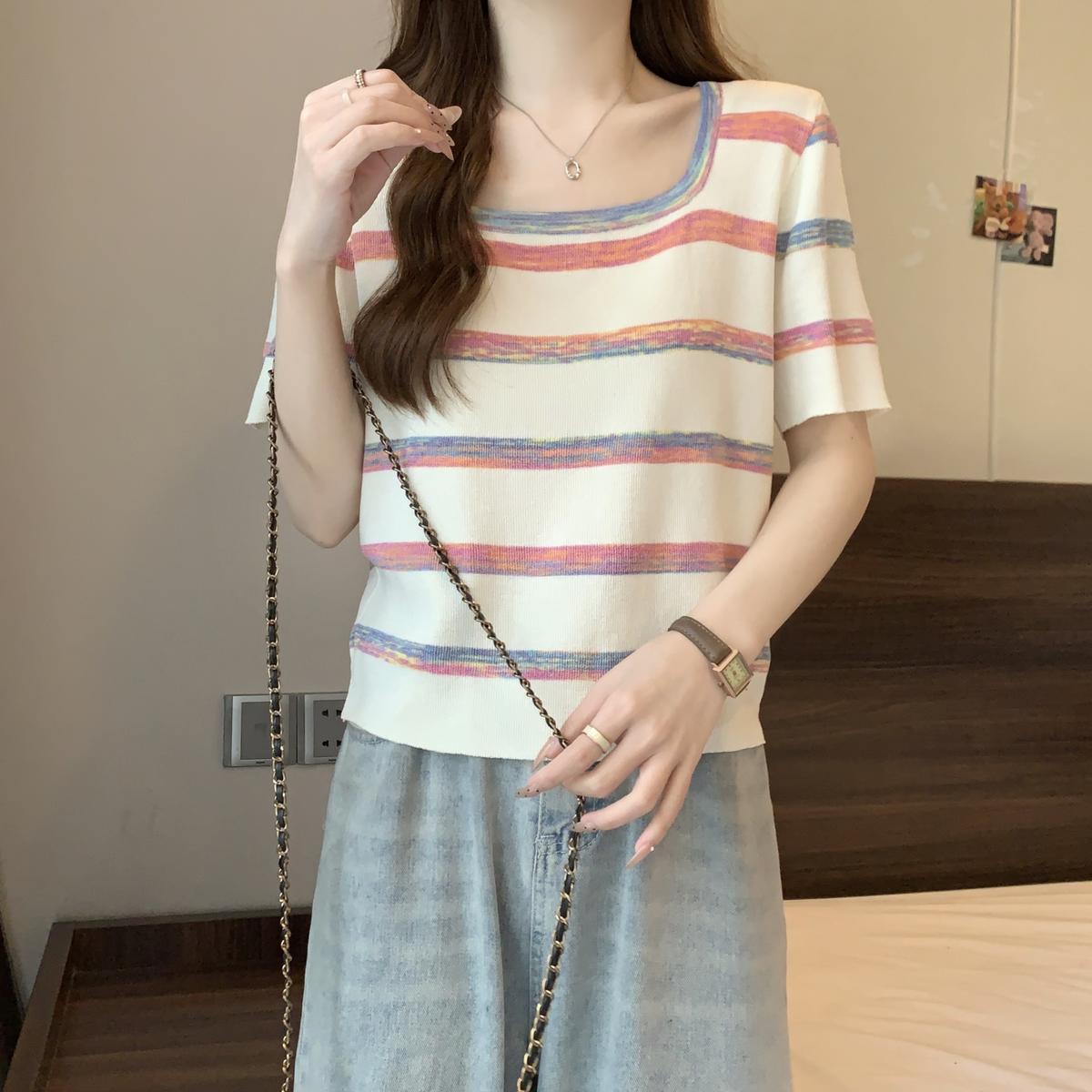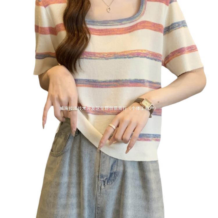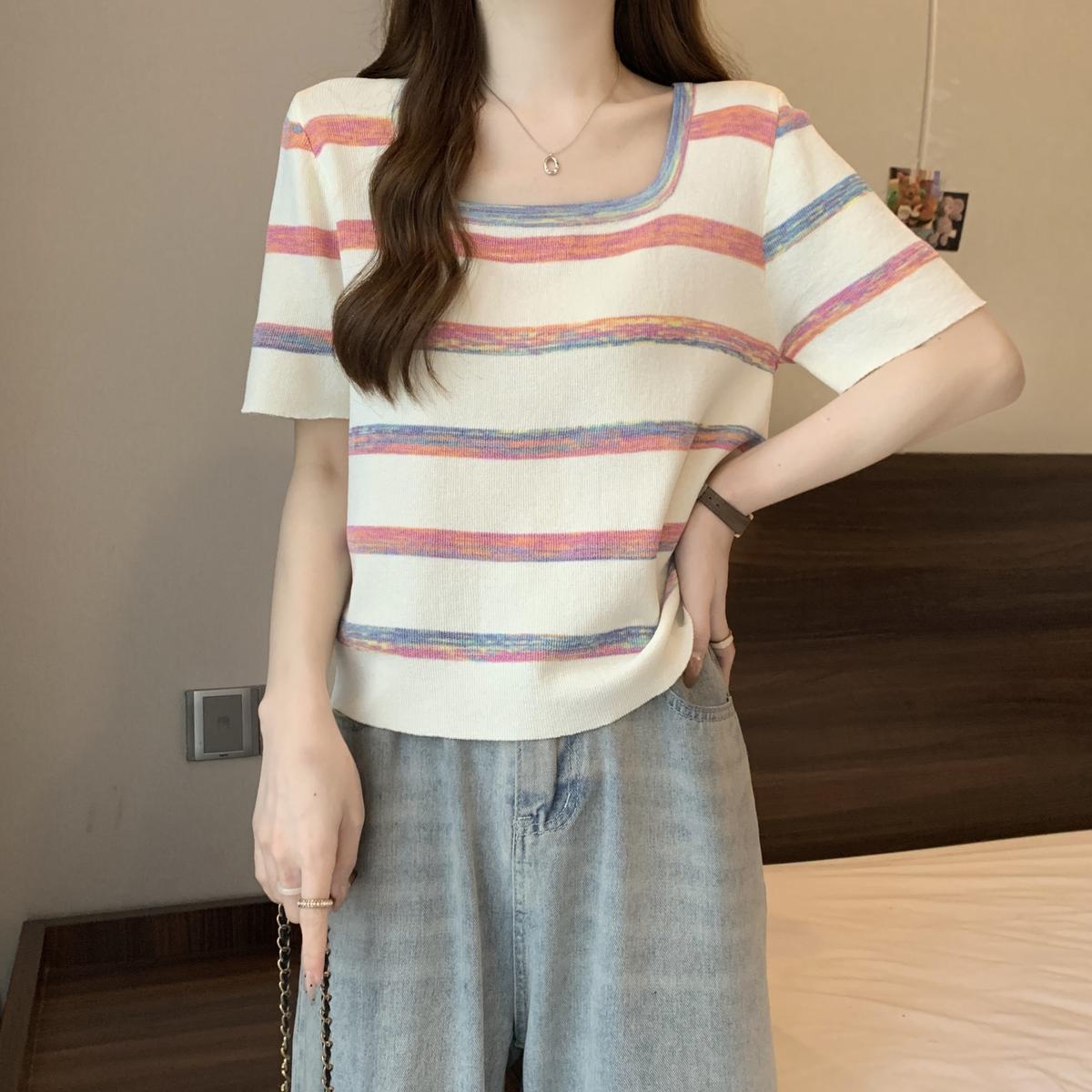 Женская футболка из ледяного шелка с короткими рукавами в радужную полоску, летняя, больших размеров, слегка полная, утягивающий топ с французским квадратным вырезом, стильная блузка.