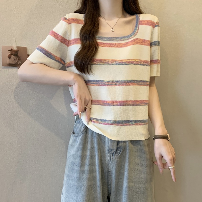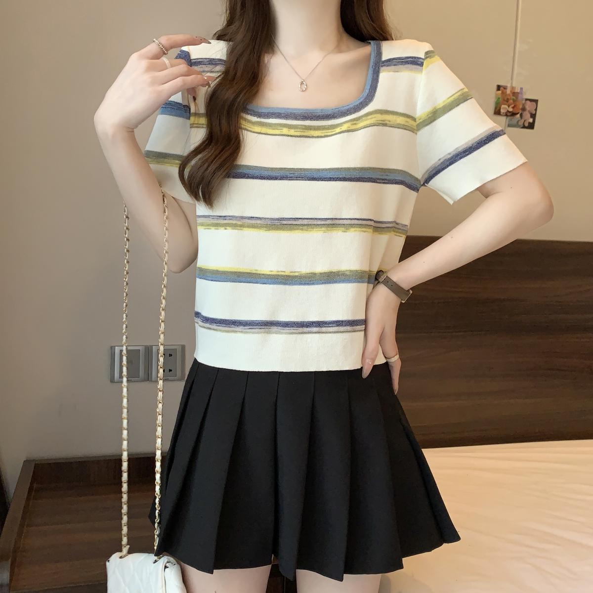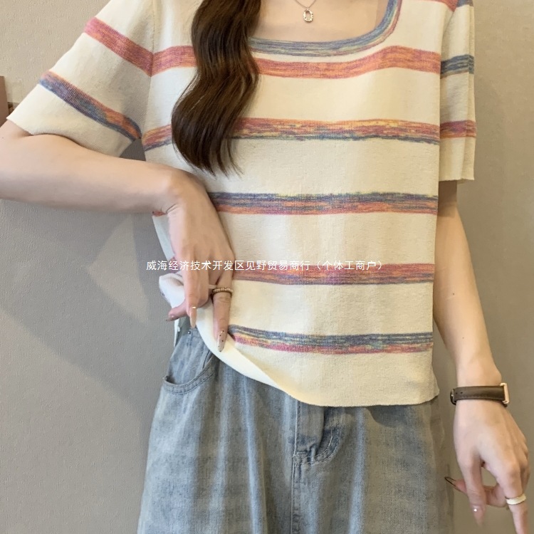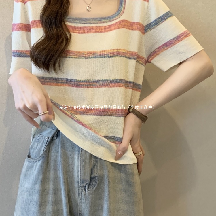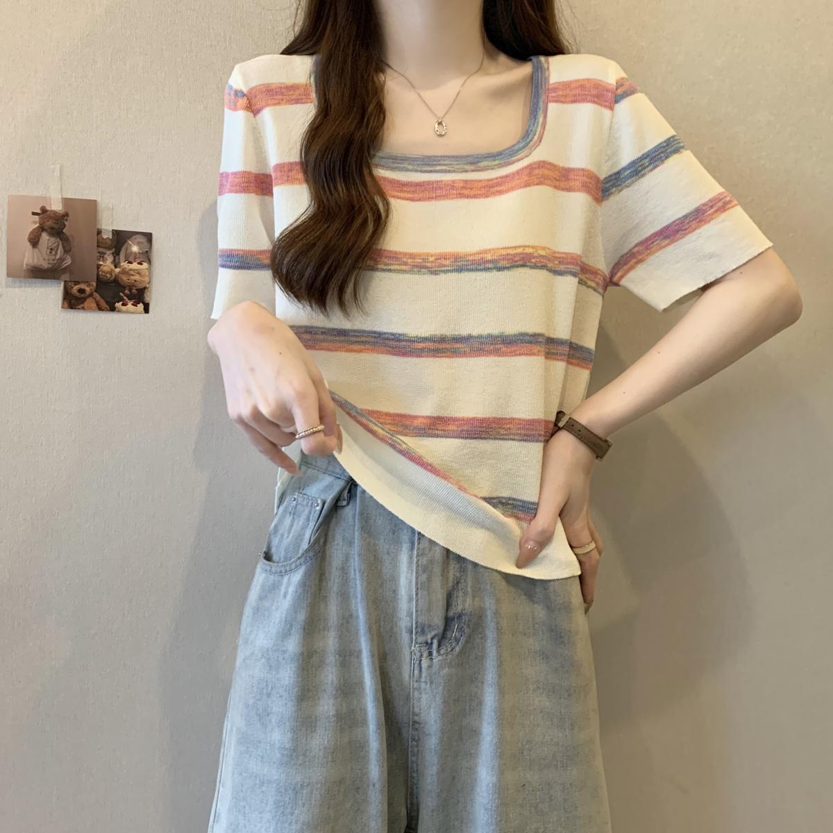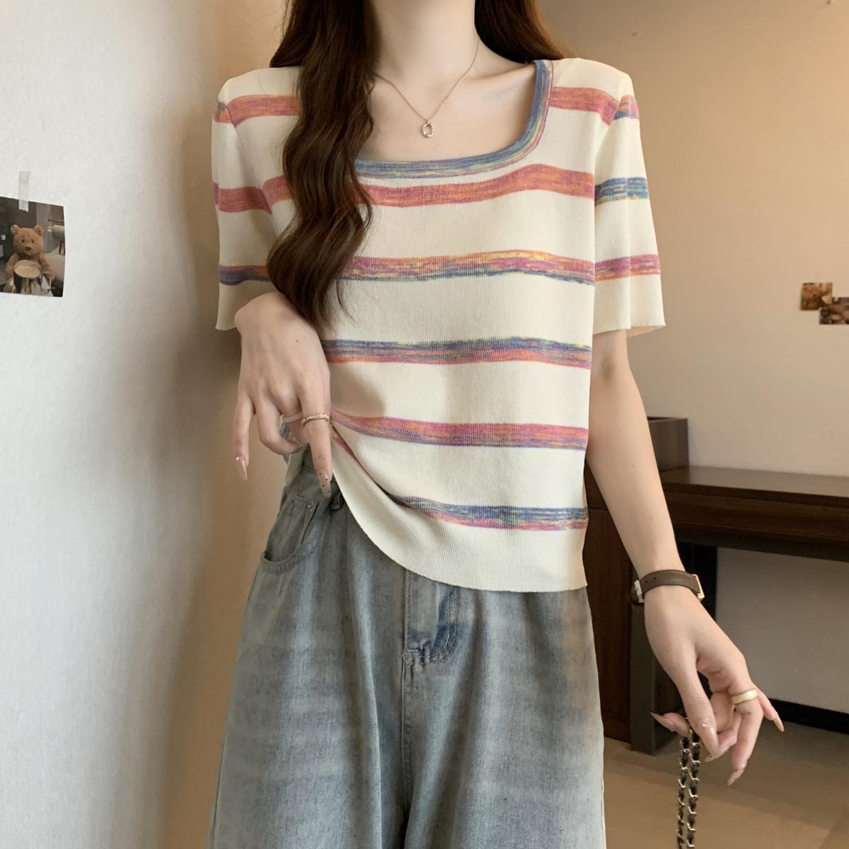 Женская футболка из ледяного шелка с короткими рукавами в радужную полоску, летняя, больших размеров, слегка полная, утягивающий топ с французским квадратным вырезом, стильная блузка.
