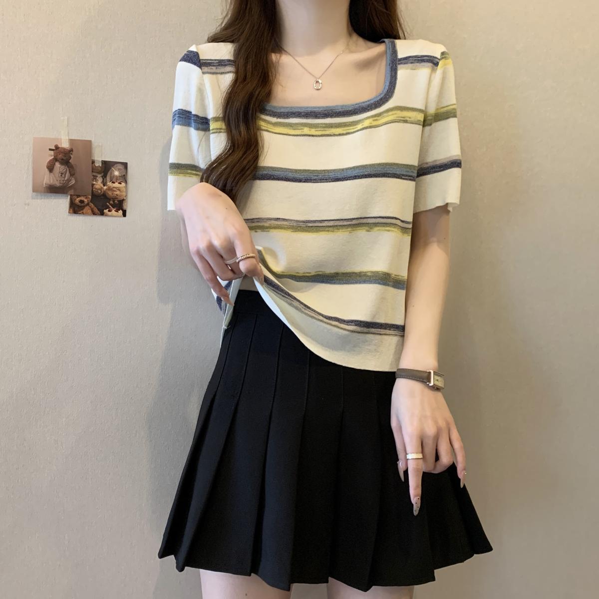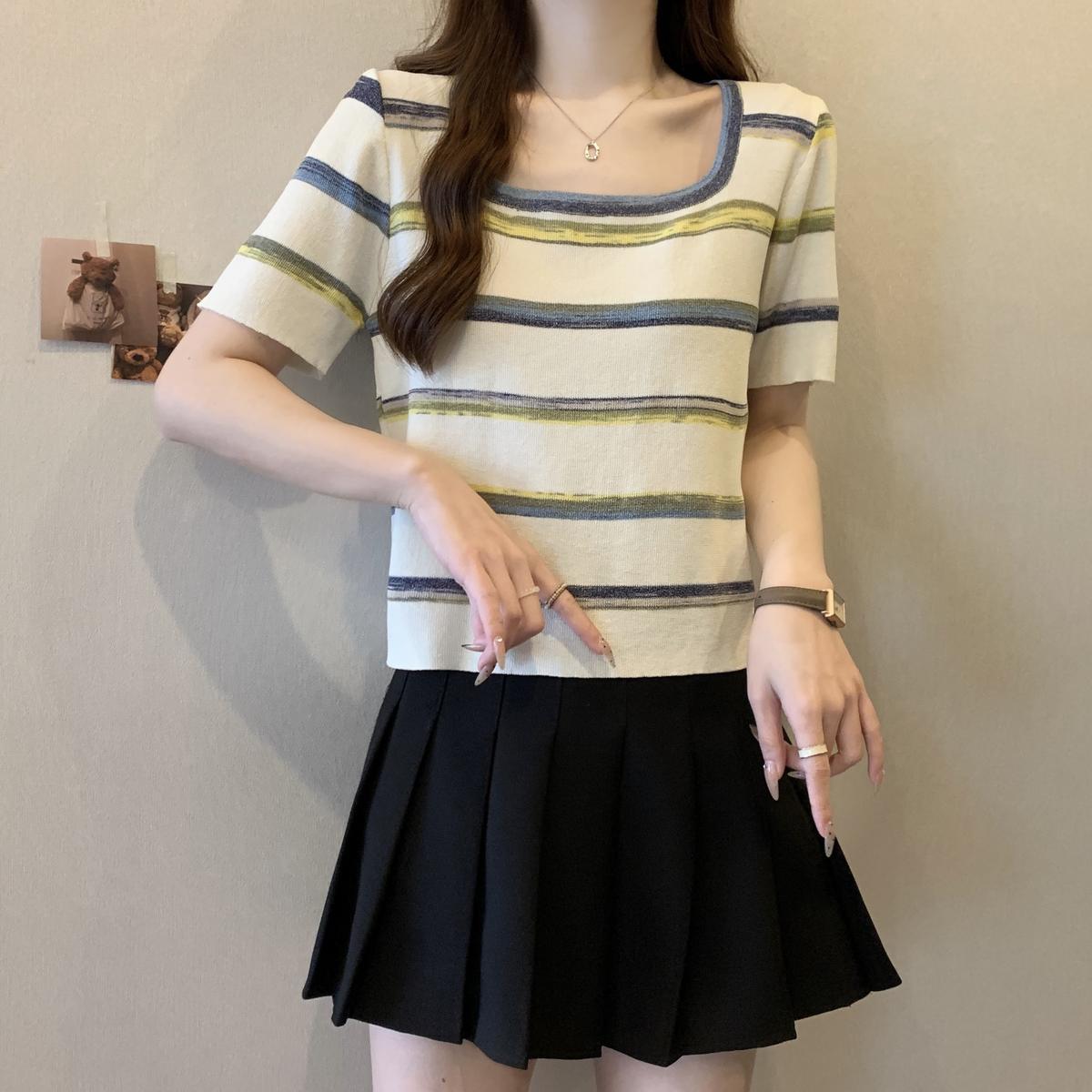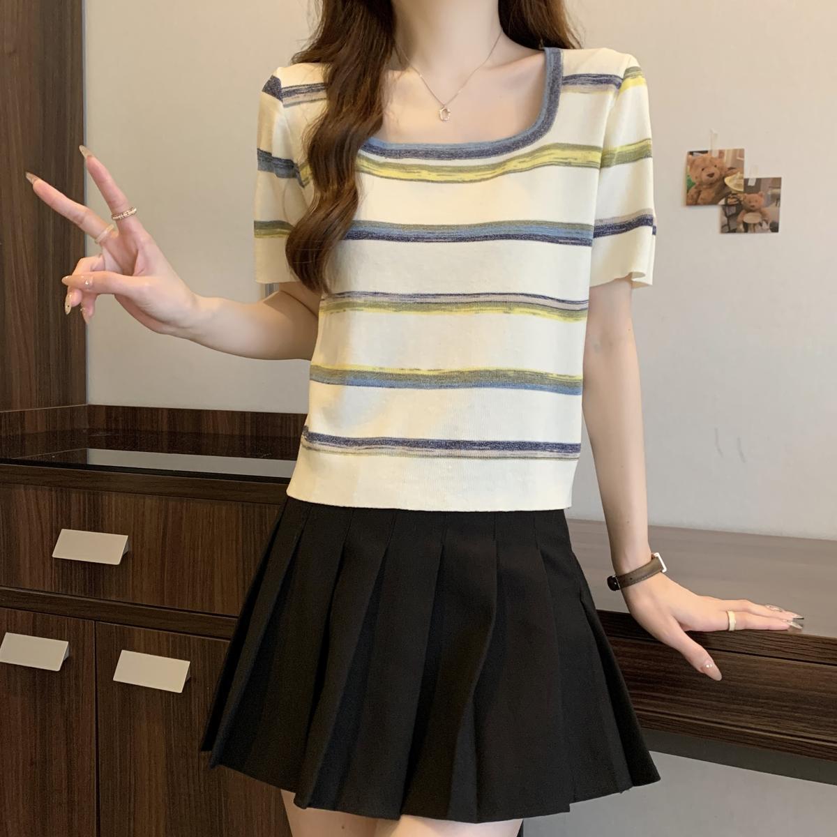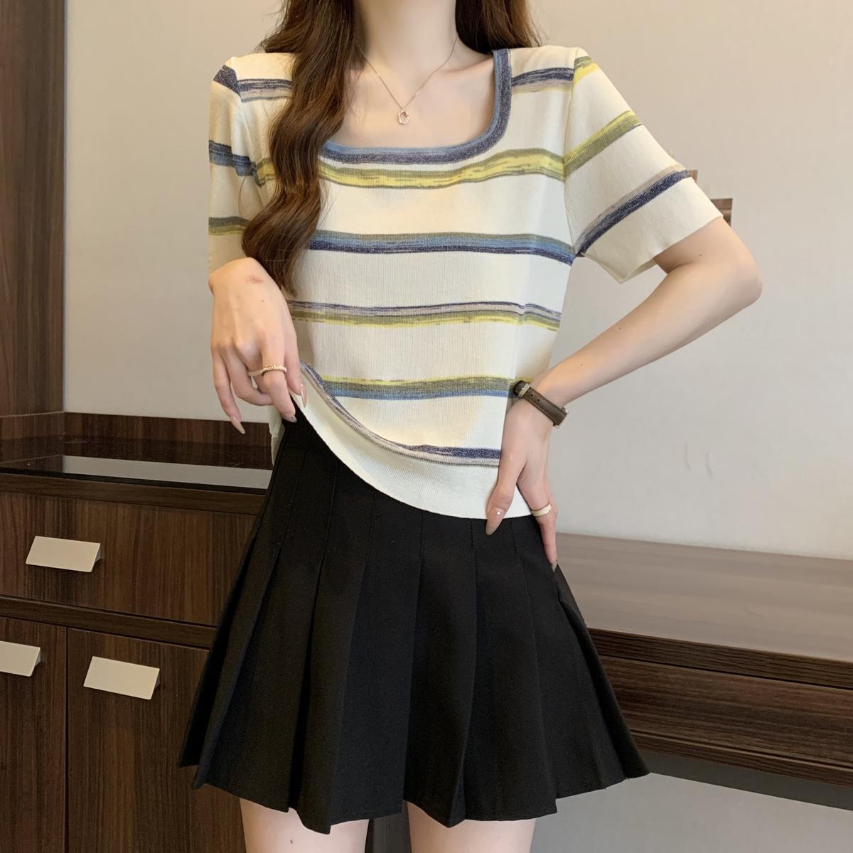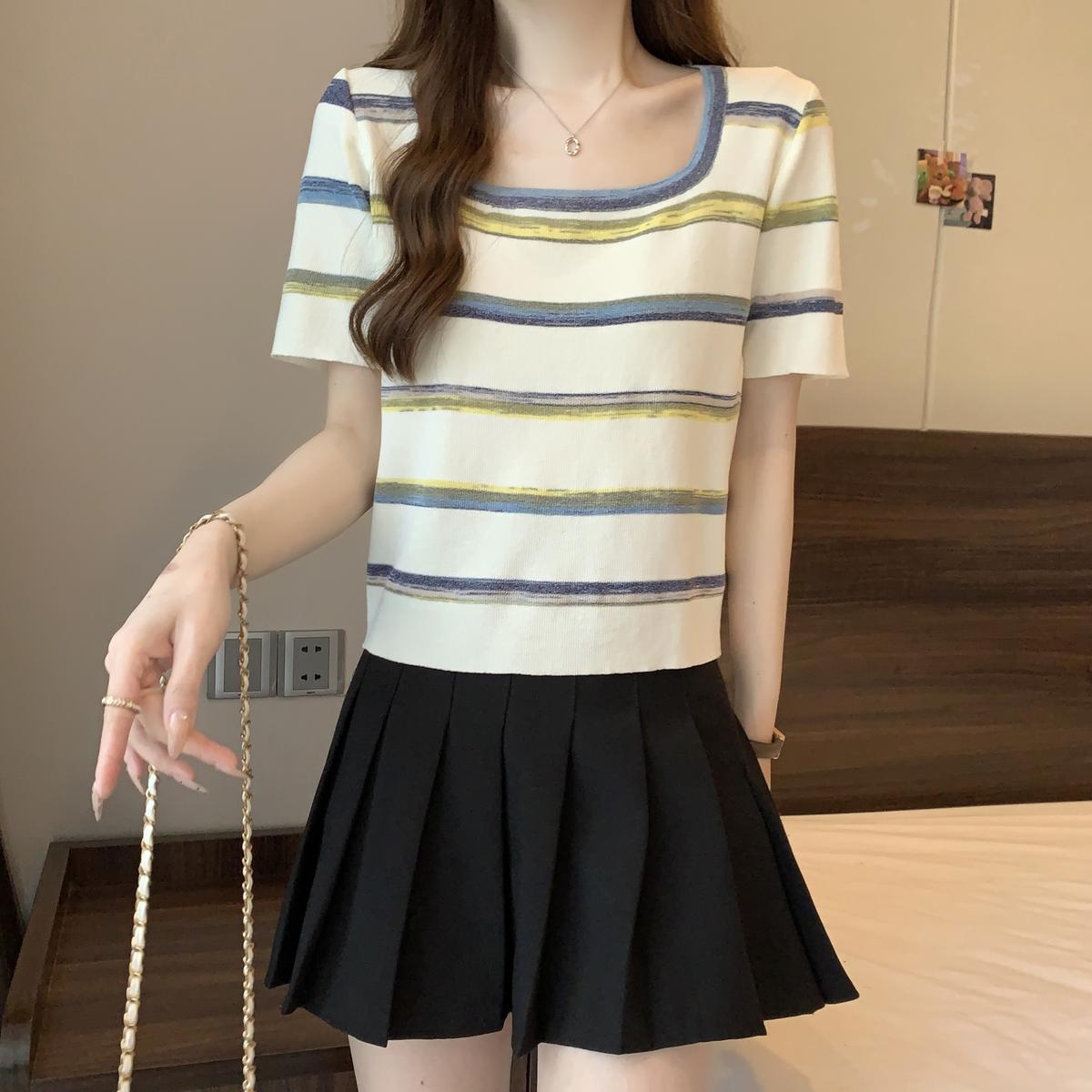 Женская футболка из ледяного шелка с короткими рукавами в радужную полоску, летняя, больших размеров, слегка полная, утягивающий топ с французским квадратным вырезом, стильная блузка.