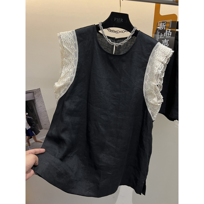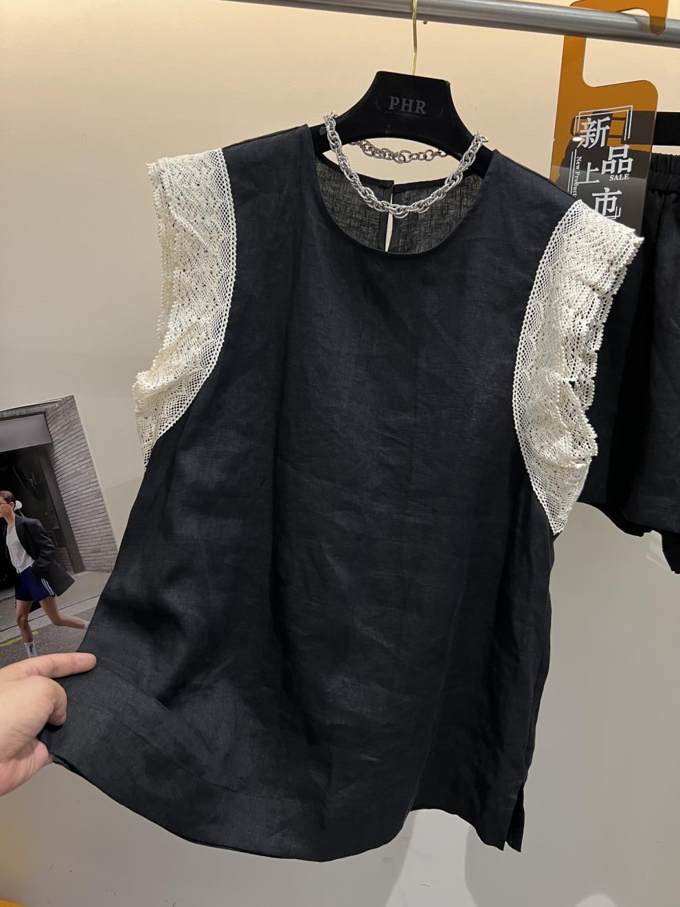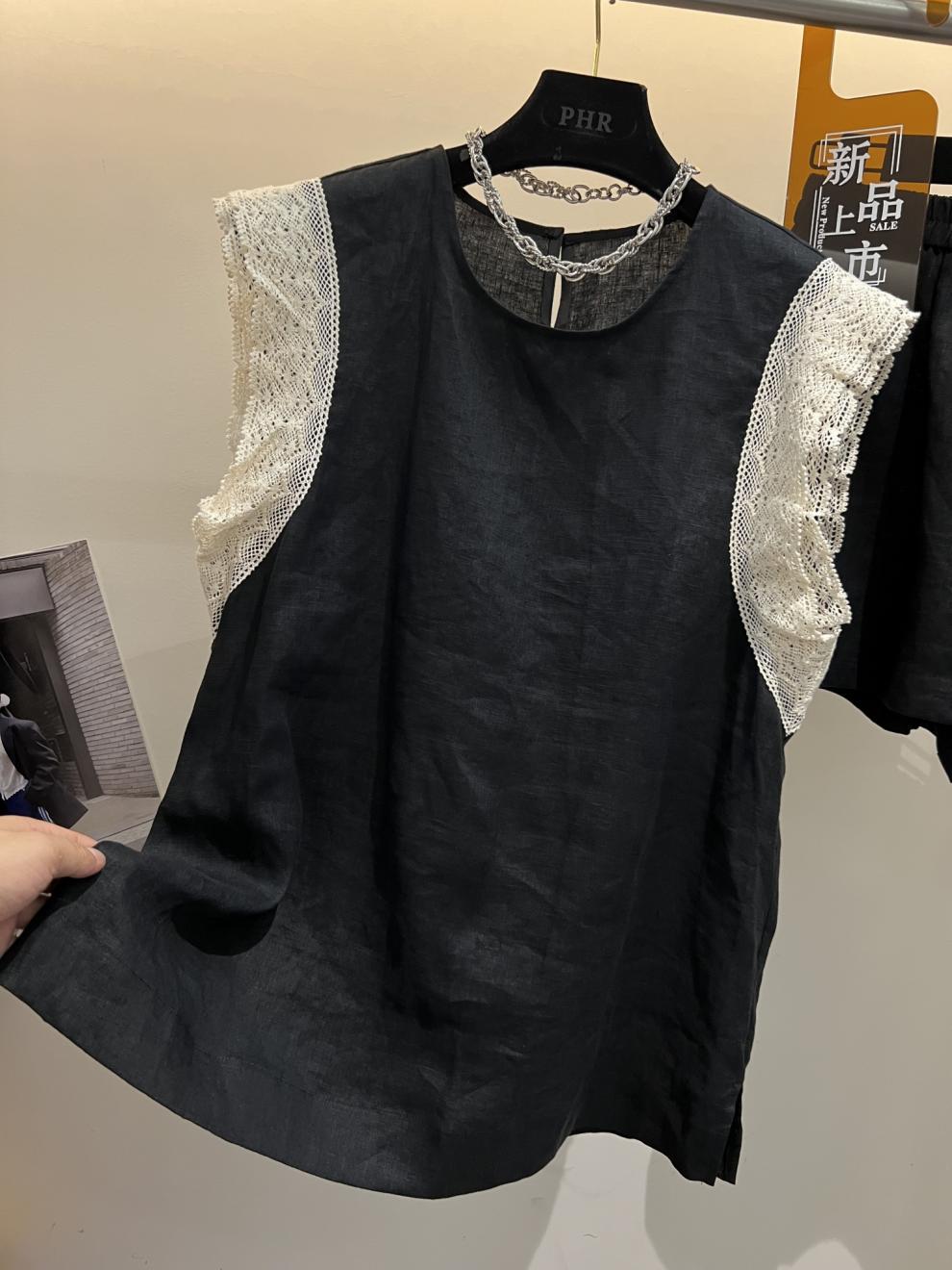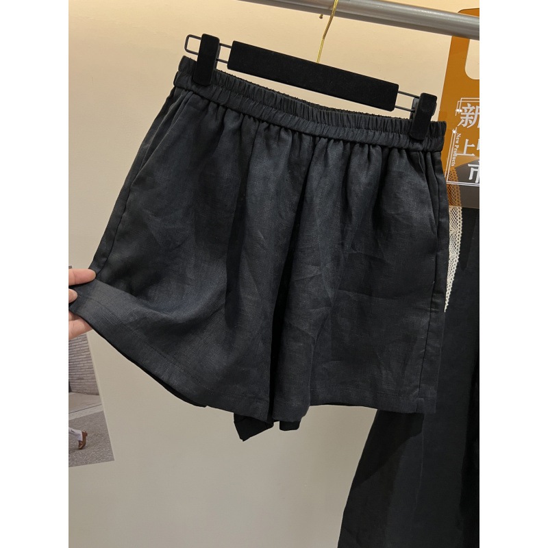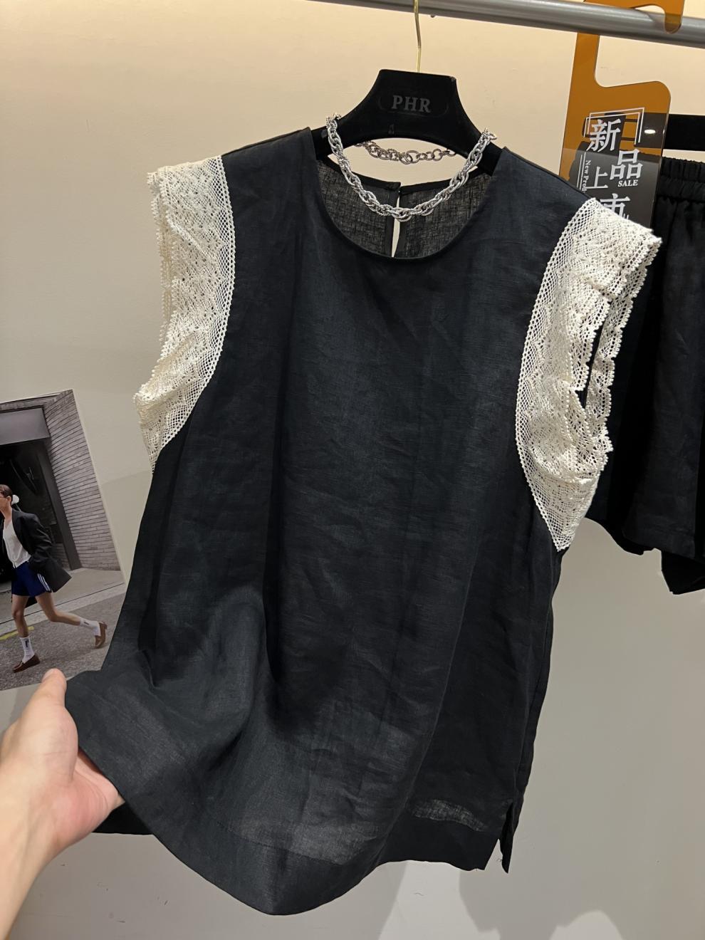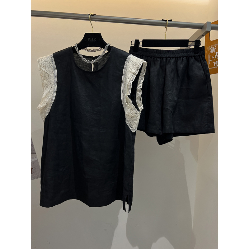 Элитный европейский товар 2025: летний новый комплект для женщин с круглым вырезом, кружевными летящими рукавами, льняной жилет и шорты, повседневный костюм.