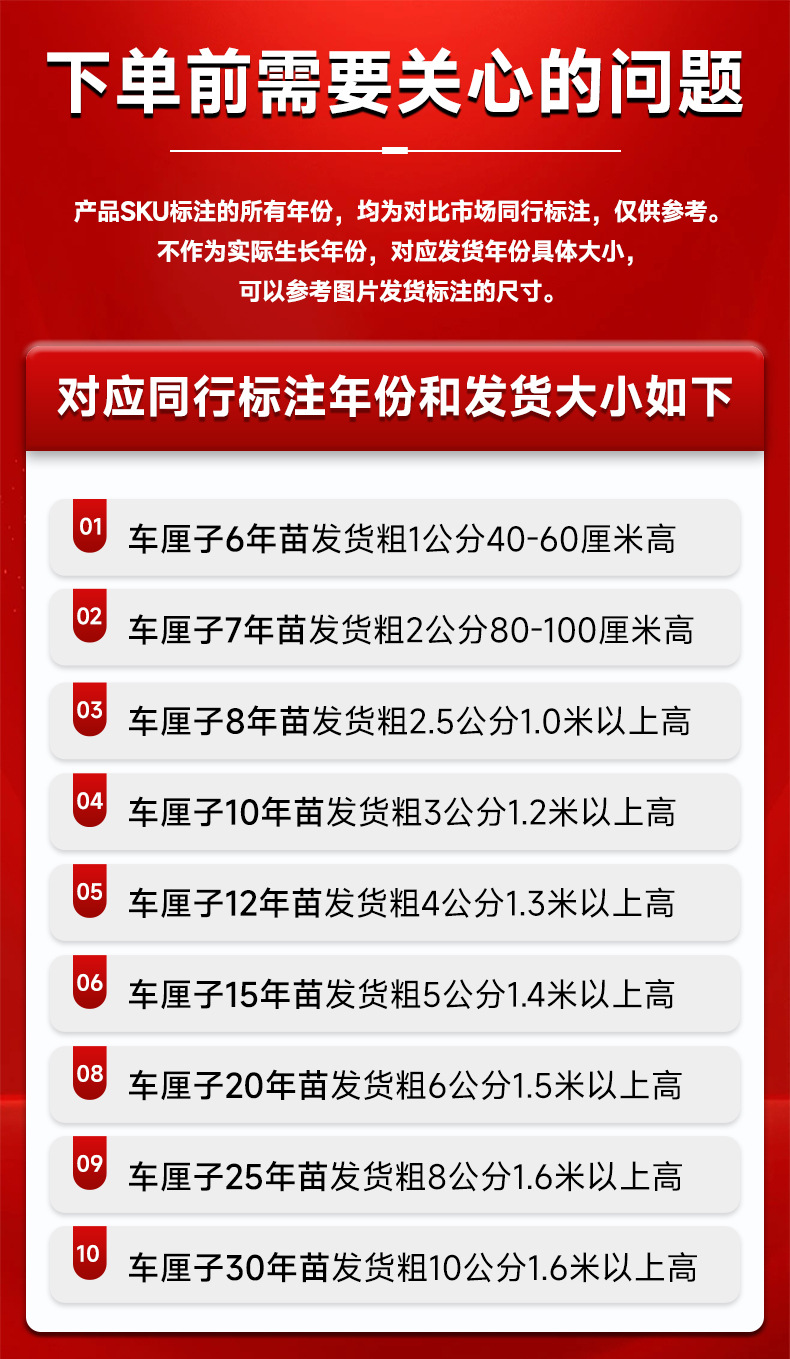 [Посадка на юге и севере] Черный жемчуг 6-летние растения высотой 40-60 см (результаты в том же году, включая мертвые растения); [Посадка на юге и севере] 8-летние рассады Black Pearl высотой более 80 см (рассада умрет, если в этом году она принесет плоды); [Посадка на юге и севере] Черный жемчуг 10-летние саженцы высотой более 100 см (результаты погибнут в том же году); [Посадка на юге и севере] Черный жемчуг 12-летние растения высотой более 130 см (фрукты умрут в том же году); [Посадка на юге и севере] Черный жемчуг 15-летние саженцы высотой более 140 см (фруктовый сад взорвется в том же году); [Посадка на юге и севере] Черный жемчуг 20-летние саженцы высотой более 150 см (фруктовая эссенция взорвется в том же году); [Посадка на юге и севере] Черный жемчуг 25-летняя рассада высотой более 160 см (фрукты лопнут в том же году); [Подходит для посадки на юге] Чилийские 6-летние рассады 40-60см (результат в том же году, мертвые рассады будут заменены); [Подходит для посадки на юге] Чилийские 8-летние рассады высотой более 80 см (результатом года будут мертвые растения); [Подходит для посадки на юге] 10-летние чилийские рассады высотой более 100 см (рассада умрет, если в этом году она принесет плоды); [Подходит для посадки на юге] Чилийские 12-летние рассады высотой более 130 см (рассада погибнет, если плоды будут собраны в том же году); [Подходит для посадки на юге] Чилийские 15-летние рассады высотой более 140 см (год взрыва плодов в саду); [Подходит для посадки на юге] Чилийские 20-летние саженцы высотой более 150 см (высококачественный плодонос в том же году); [Подходит для посадки на юге] Чилийские 25-летние саженцы высотой более 160 см (в том же году взорвался фруктовый сад); [Подходит для посадки на севере] Русская №8 6-летняя рассада 40-60см (результаты погибнут в тот же год); [Подходит для посадки на севере] Русская №8 8-летняя рассада около 80см (результат в том же году); [Подходит для посадки на севере] Русская №8 10-летняя рассада высотой более 100см (дает плоды в том же году); [Подходит для посадки на севере] Русская №8 12-летняя рассада высотой более 130см (взорвалась в том же году); [Подходит для посадки на севере] Русская №8 15-летняя рассада высотой более 140см (взорвалась в том же году); [Подходит для посадки на севере] Русская №8 20-летняя рассада высотой более 150см (взорвалась в том же году); [Подходит для посадки на севере] Русская №8 25-летняя рассада высотой более 160см (взорвалась в том же году); [Подходит для посадки на юге] Саженцы Мейзао 6 лет 40-60см (результат в том же году, мертвые саженцы будут заменены); [Подходит для посадки на юге] Саженцы Meizao 8 лет высотой более 80 см (мертвые саженцы будут упакованы с результатами того же года); [Подходит для посадки на юге] 10-летние рассады Meizao высотой более 100 см (рассада умрет, если в этом году она принесет плоды); [Подходит для посадки на юге] 12-летние рассады Meizao высотой более 130 см (рассада погибнет, если плоды будут собраны в том году); [Подходит для посадки на юге] Мейзак 15-летние саженцы высотой более 140 см (годовой взрыв плодов в саду); [Подходит для посадки на юге] 20-летние рассады Meizao высотой более 150 см (высококачественный взрыв плодов в том же году); [Подходит для посадки на юге] Саженцы Мейзао 25 лет, высотой более 160 см (в том же году взорвался фруктовый сад)