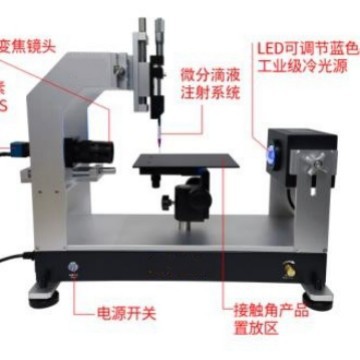 如上图、接触角测量仪主要由主机、光源、注射滴液系统、样品台、成像采集系统、分析软件六大部分组成,设备采用光学成像的原理。