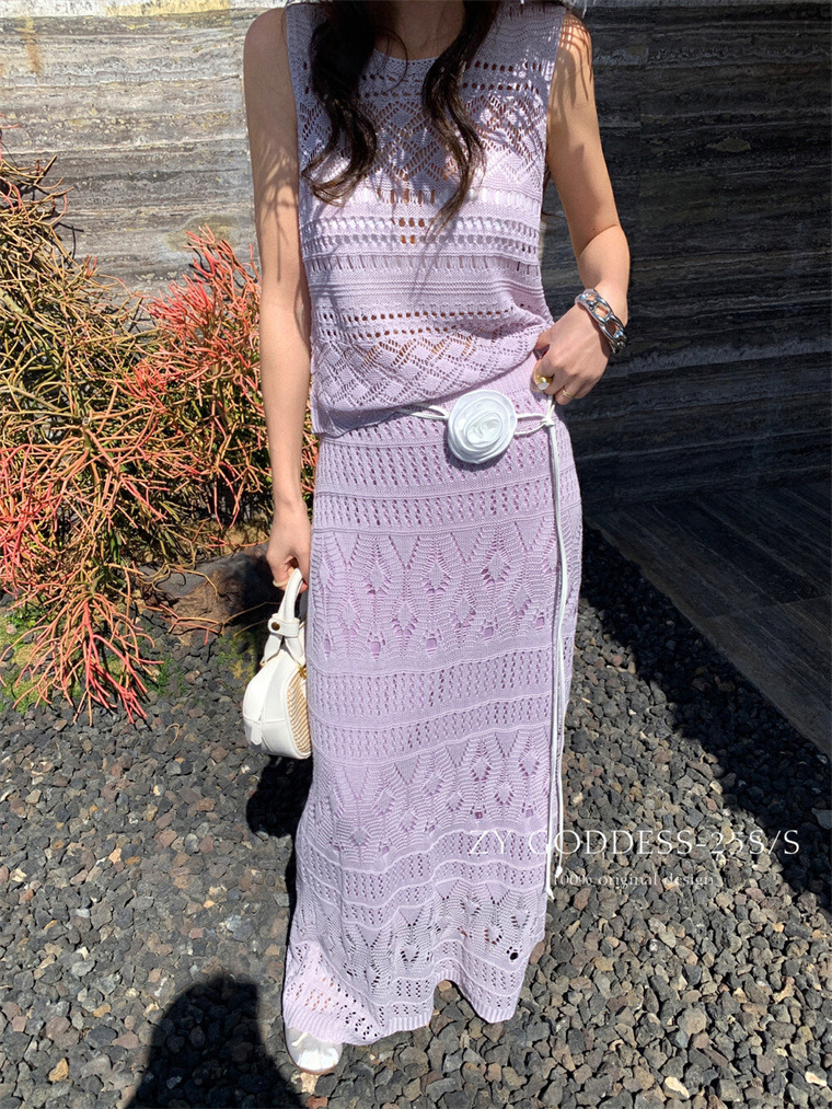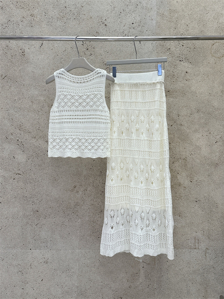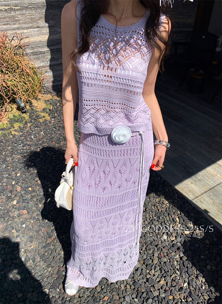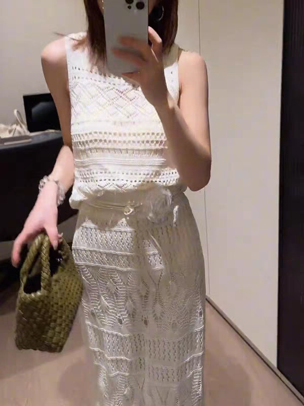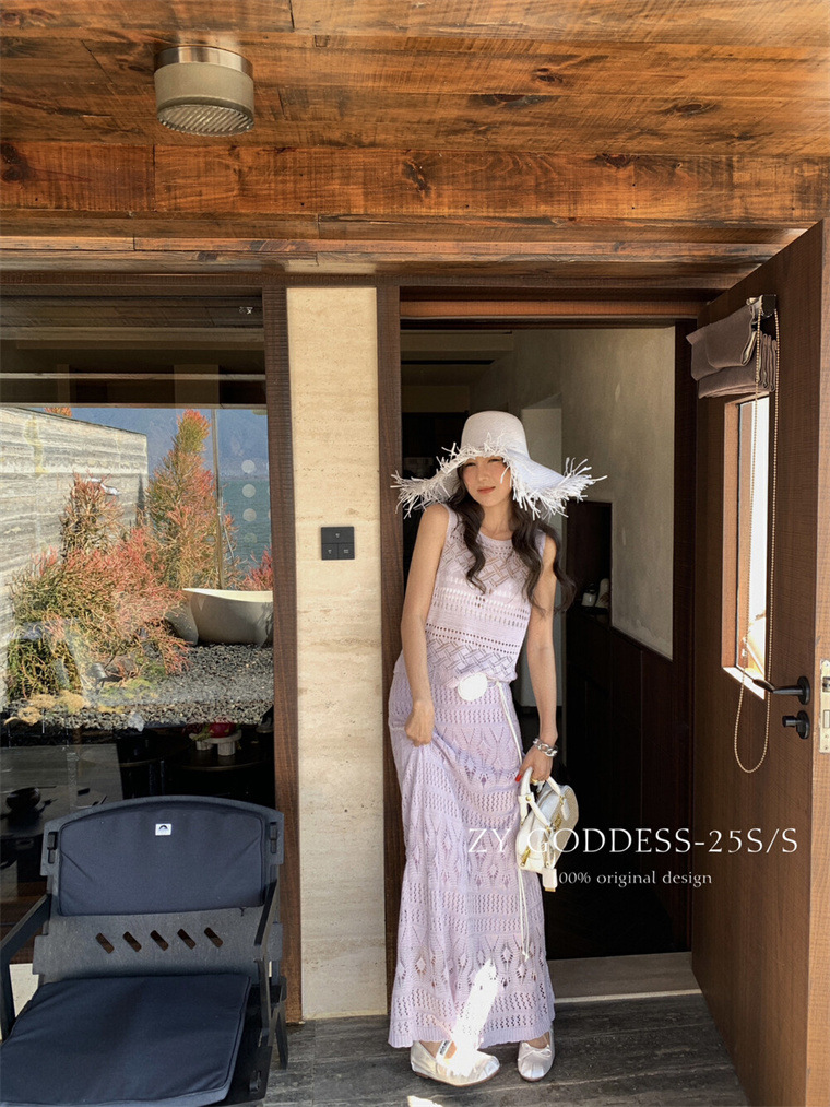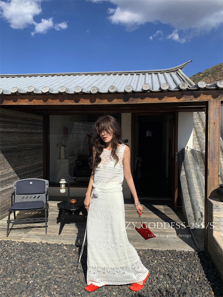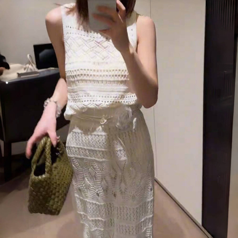 Летний костюм 2025 года в корейском стиле: вязаный жилет с вырезами и длинная юбка, комплект из двух предметов, нишевый дизайн, чистый стиль.