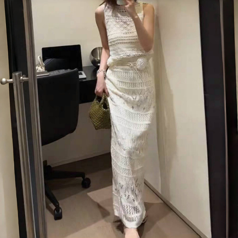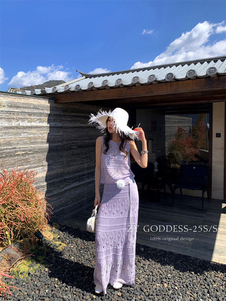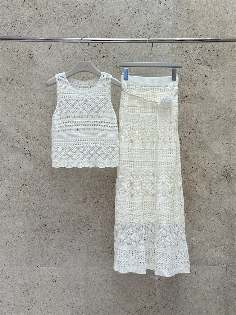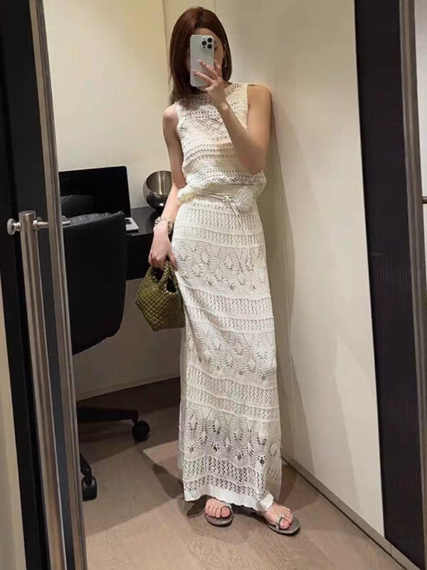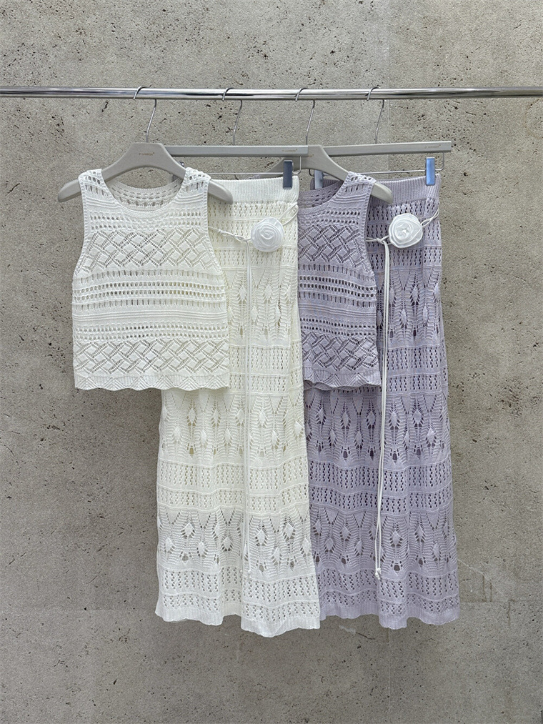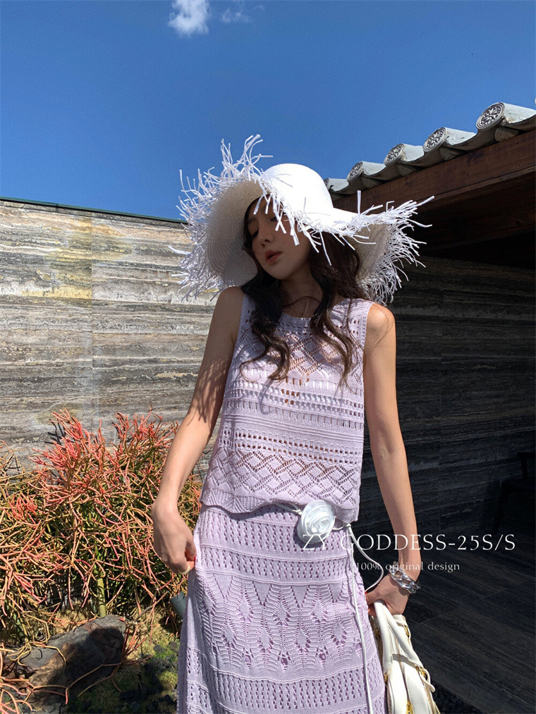 Летний костюм 2025 года в корейском стиле: вязаный жилет с вырезами и длинная юбка, комплект из двух предметов, нишевый дизайн, чистый стиль.