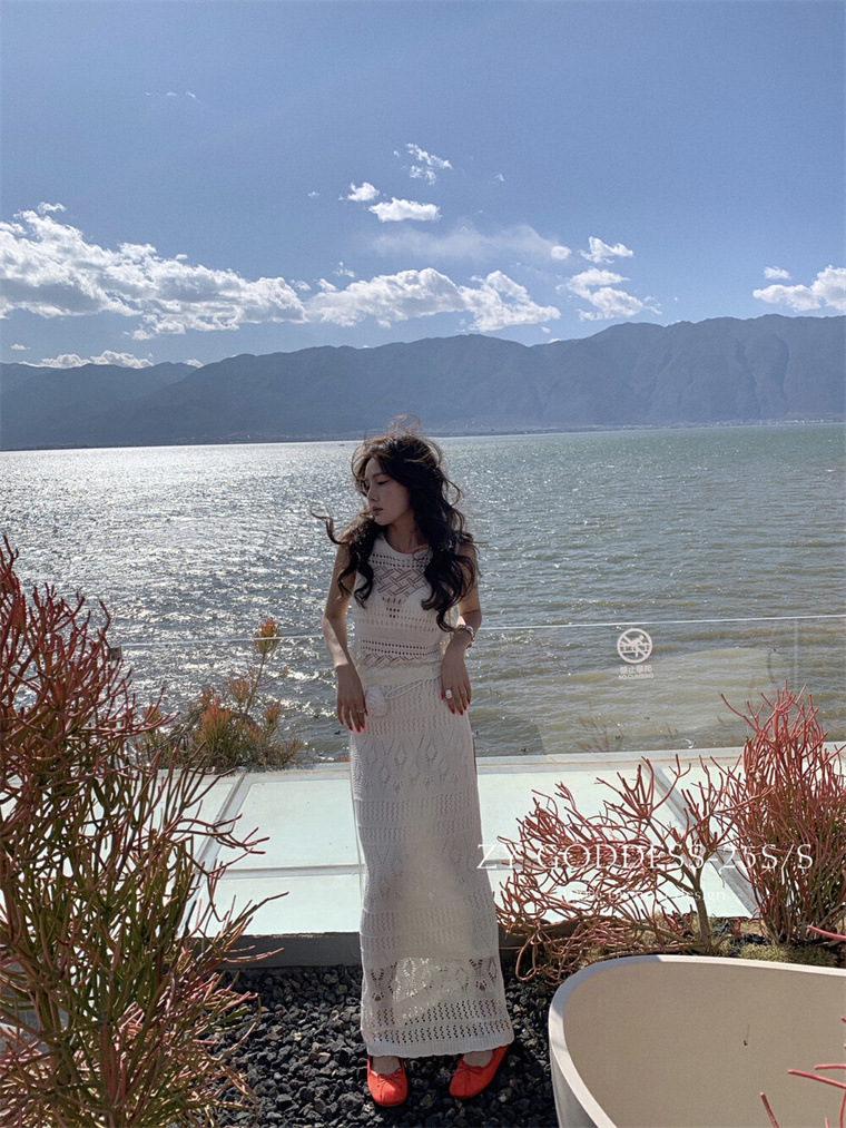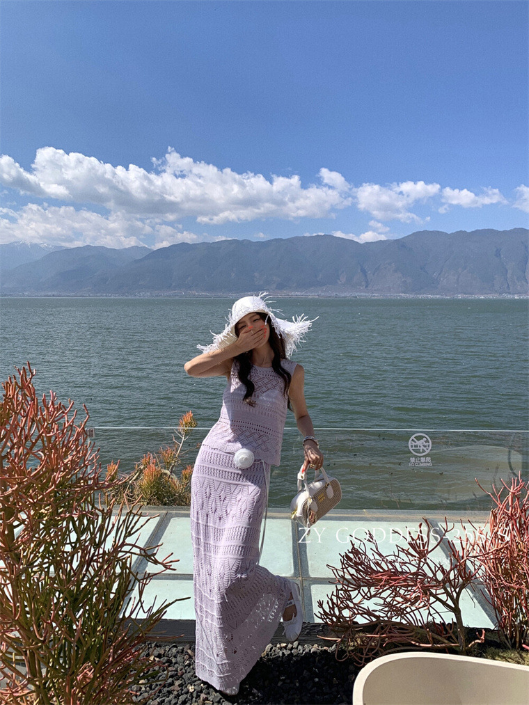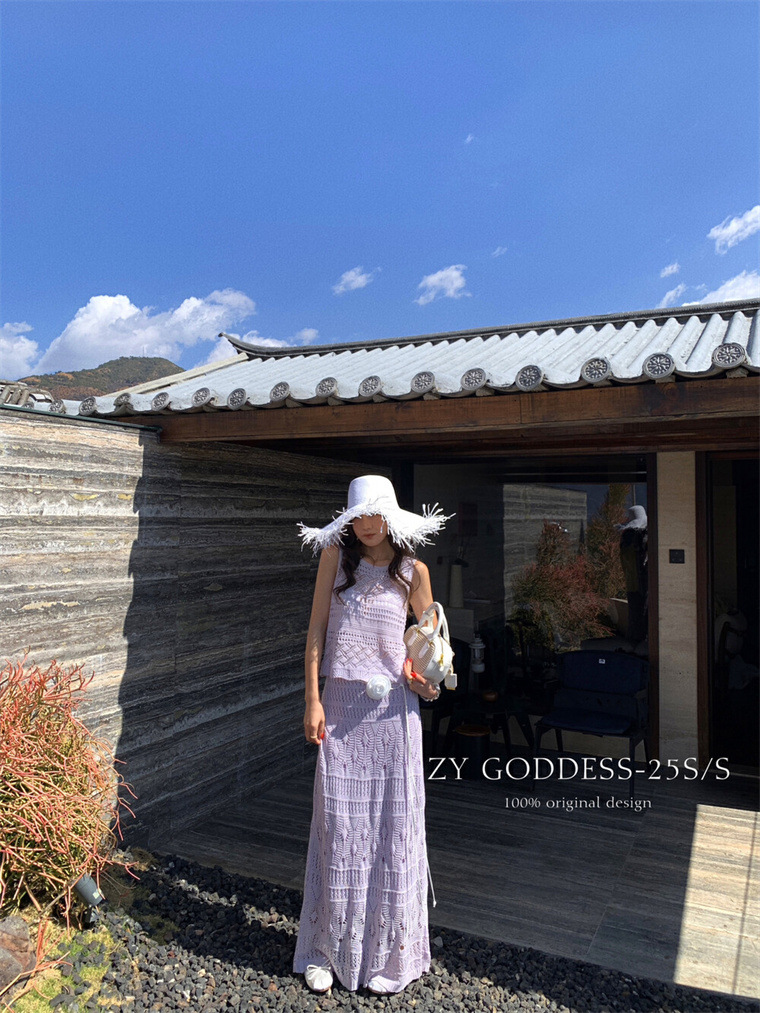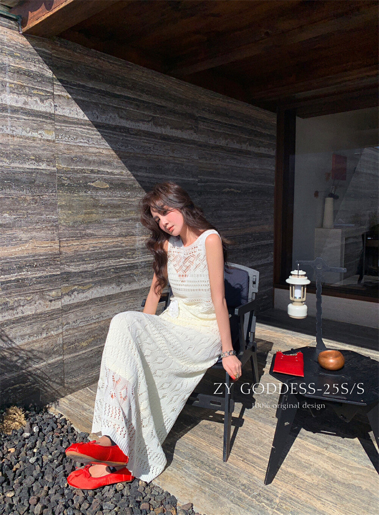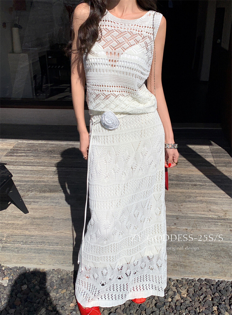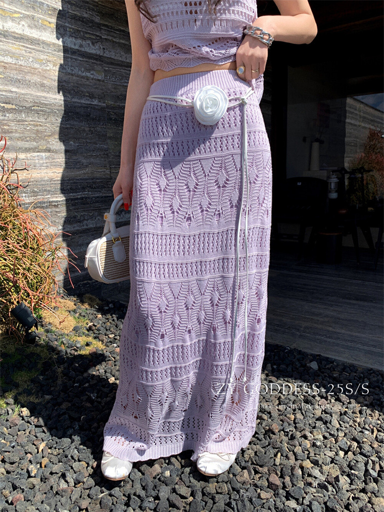 Летний костюм 2025 года в корейском стиле: вязаный жилет с вырезами и длинная юбка, комплект из двух предметов, нишевый дизайн, чистый стиль.