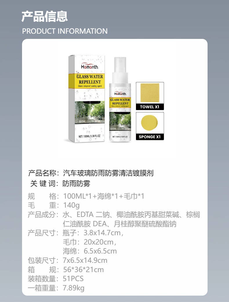 Средство для очистки стекол автомобиля Homonth, водоотталкивающее и противотуманное покрытие, спрей для очистки лобового стекла, водоотталкивающий и противотуманный спрей