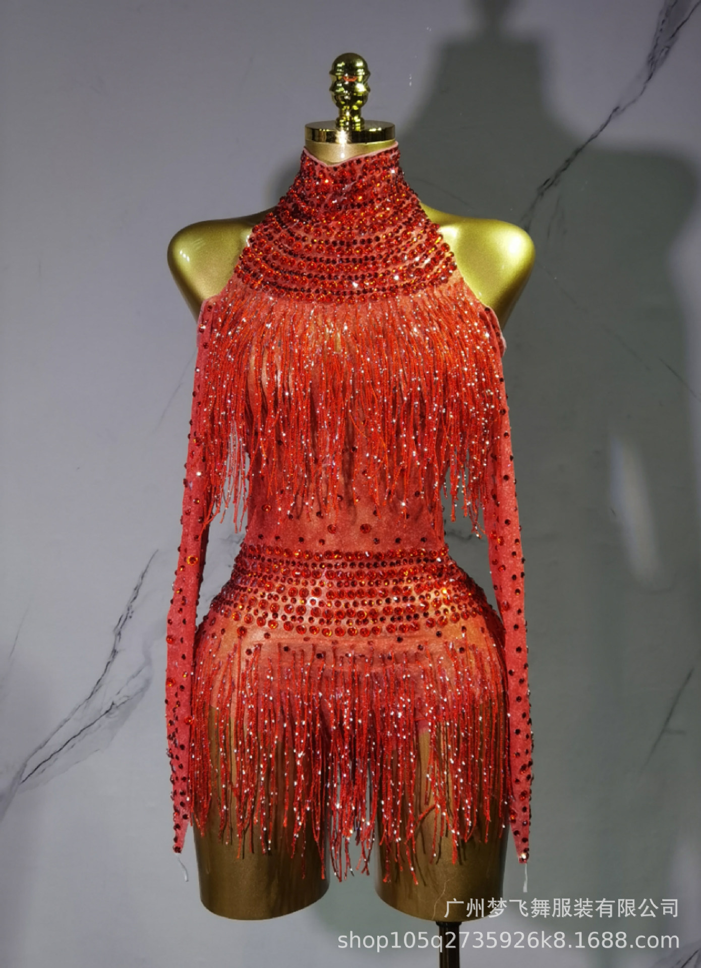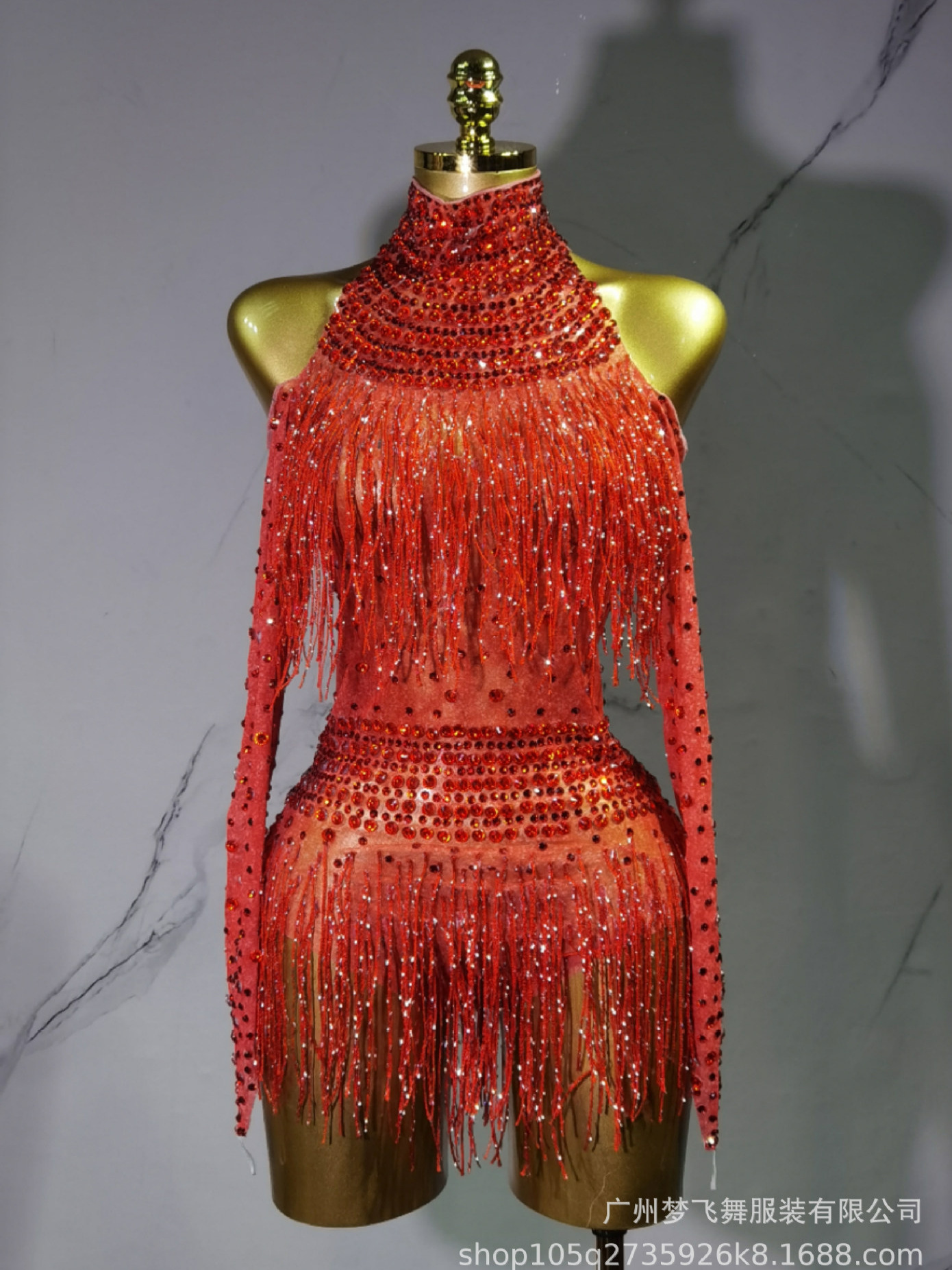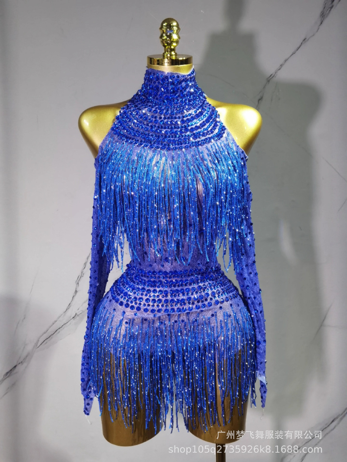 Европейский и американский хит продаж: сетчатый комбинезон с лямками через шею, длинными рукавами, стразами и бахромой для выступлений на сцене в ночном клубе, для женщин-певиц.