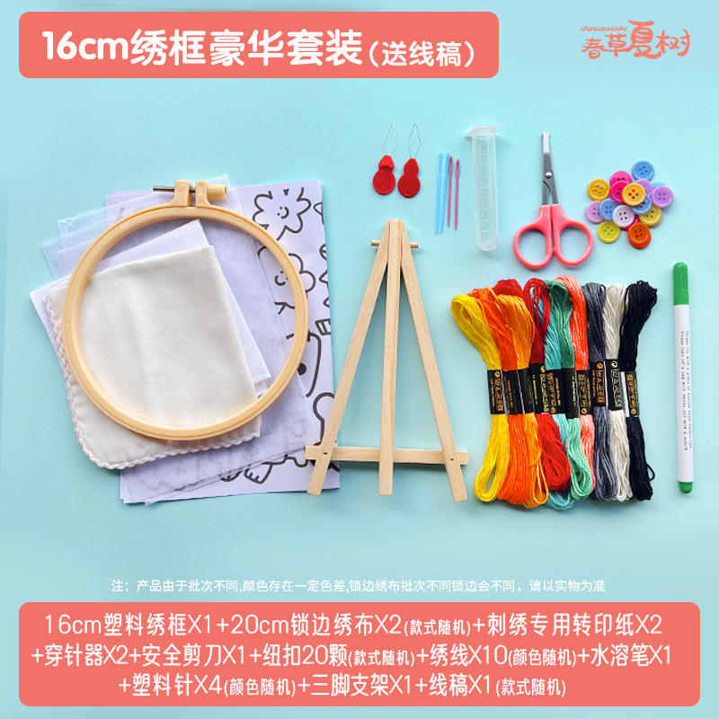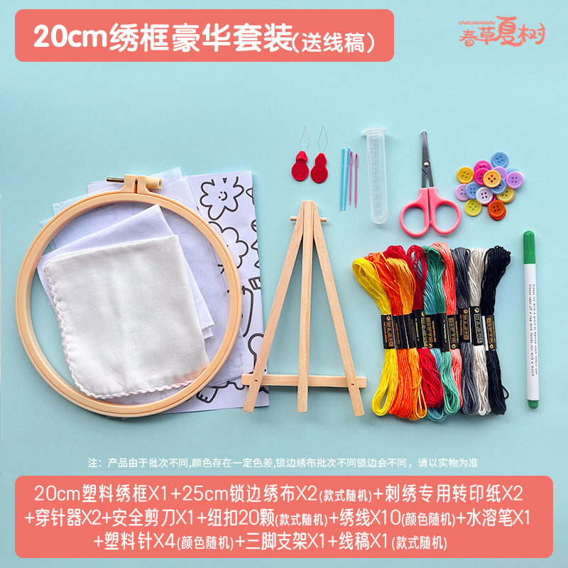 [Тренировочный набор для входа в малый класс 16 см]; [Стандартный набор каркасов для вышивания 16 см]; [Стандартный набор каркаса для вышивания 20 см]; [Роскошный набор для вышивания 16 см] бесплатный черновик; [Роскошный набор для вышивания 20 см] бесплатный черновик; 2 водорастворимых ручки; Пластиковые иглы*10 (5 больших и 5 маленьких) + нитевдеватель*2; 5 вышивальных рамок диаметром 16 см.; 5 вышивальных рамок диаметром 20 см.; 10 кусков ткани с вышивкой оверлоком шириной 20 см.; 10 кусков ткани с вышивкой оверлоком шириной 25 см.; 50 цветных кнопок (случайные цвета); 1 комплект 10-цветных ниток для вышивания [случайный цвет]; 5 листов специальной переносной бумаги формата А4 для вышивания.; Треугольный кронштейн [1 шт.]