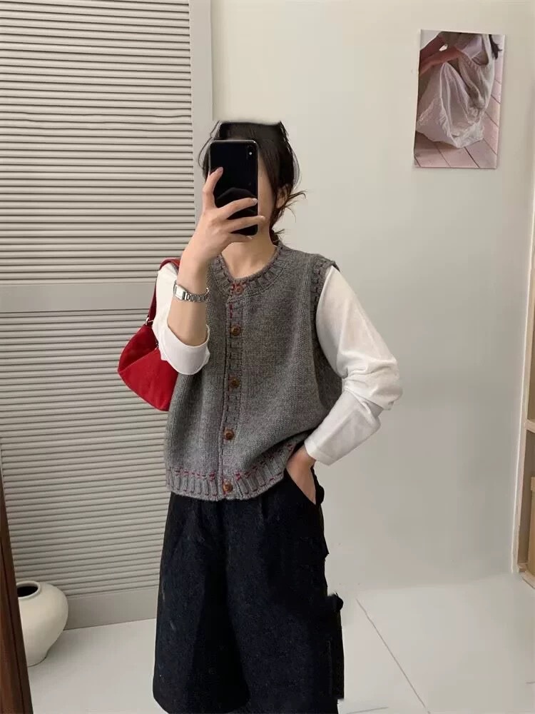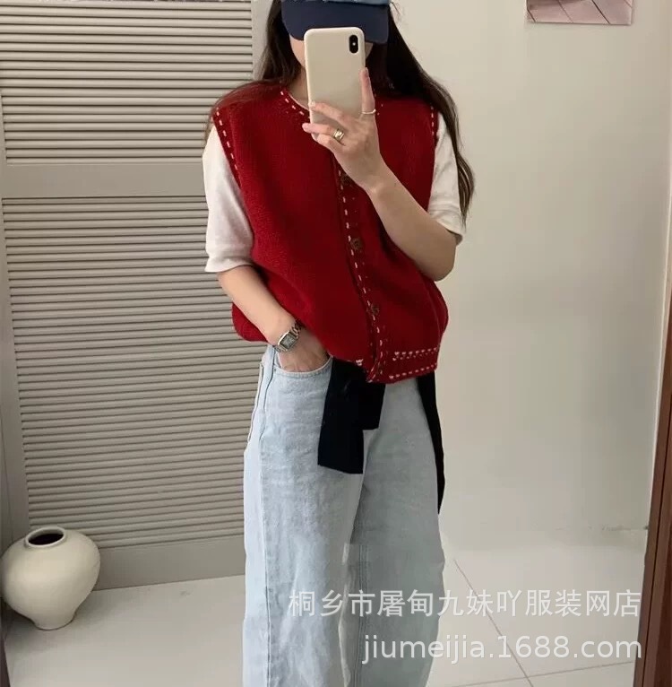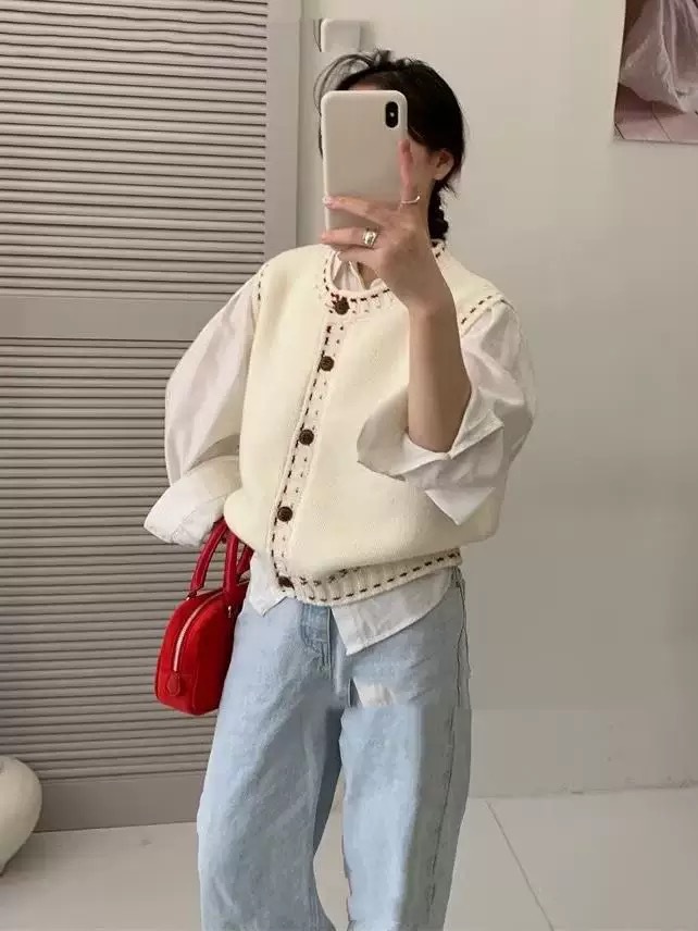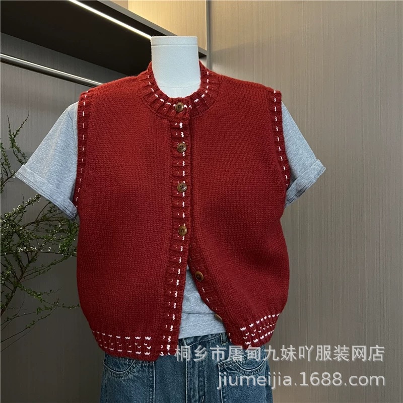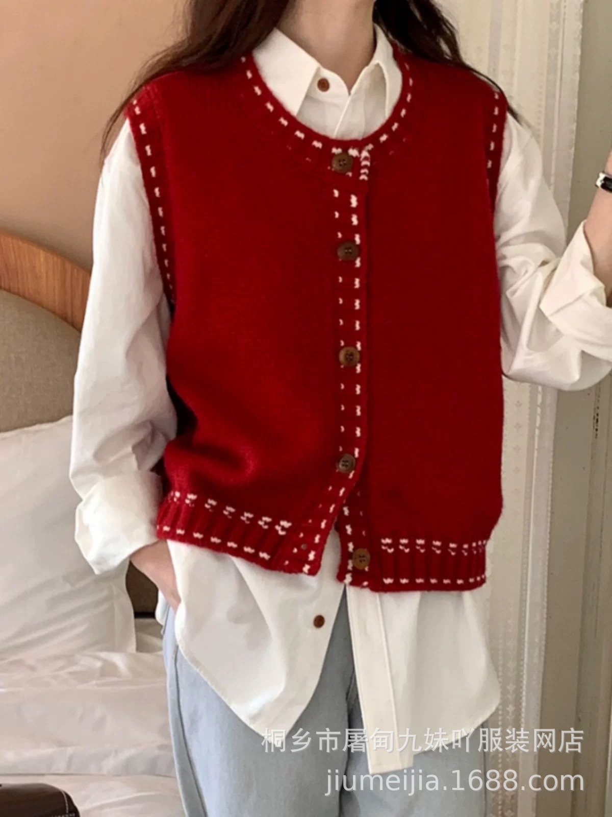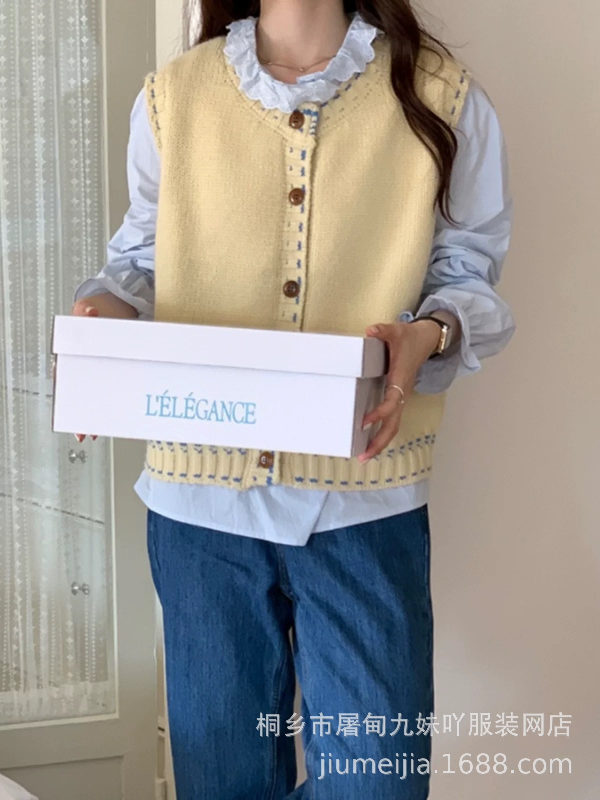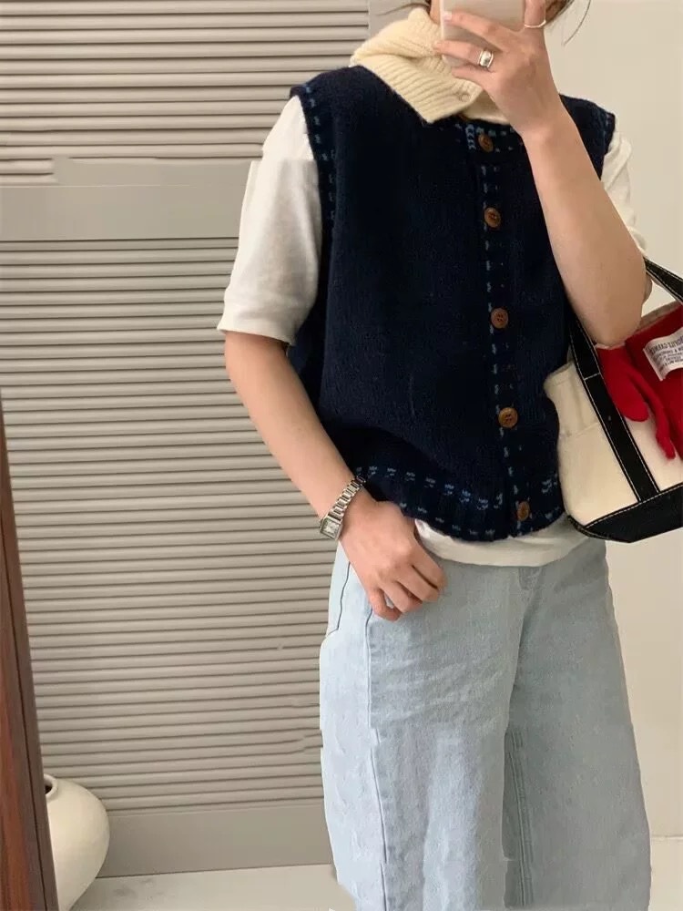 Женский кардиган-жилет в корейском стиле, премиум-класса, с контрастной расцветкой, круглым вырезом, повседневный, новый стиль 2025 года, трикотажный.