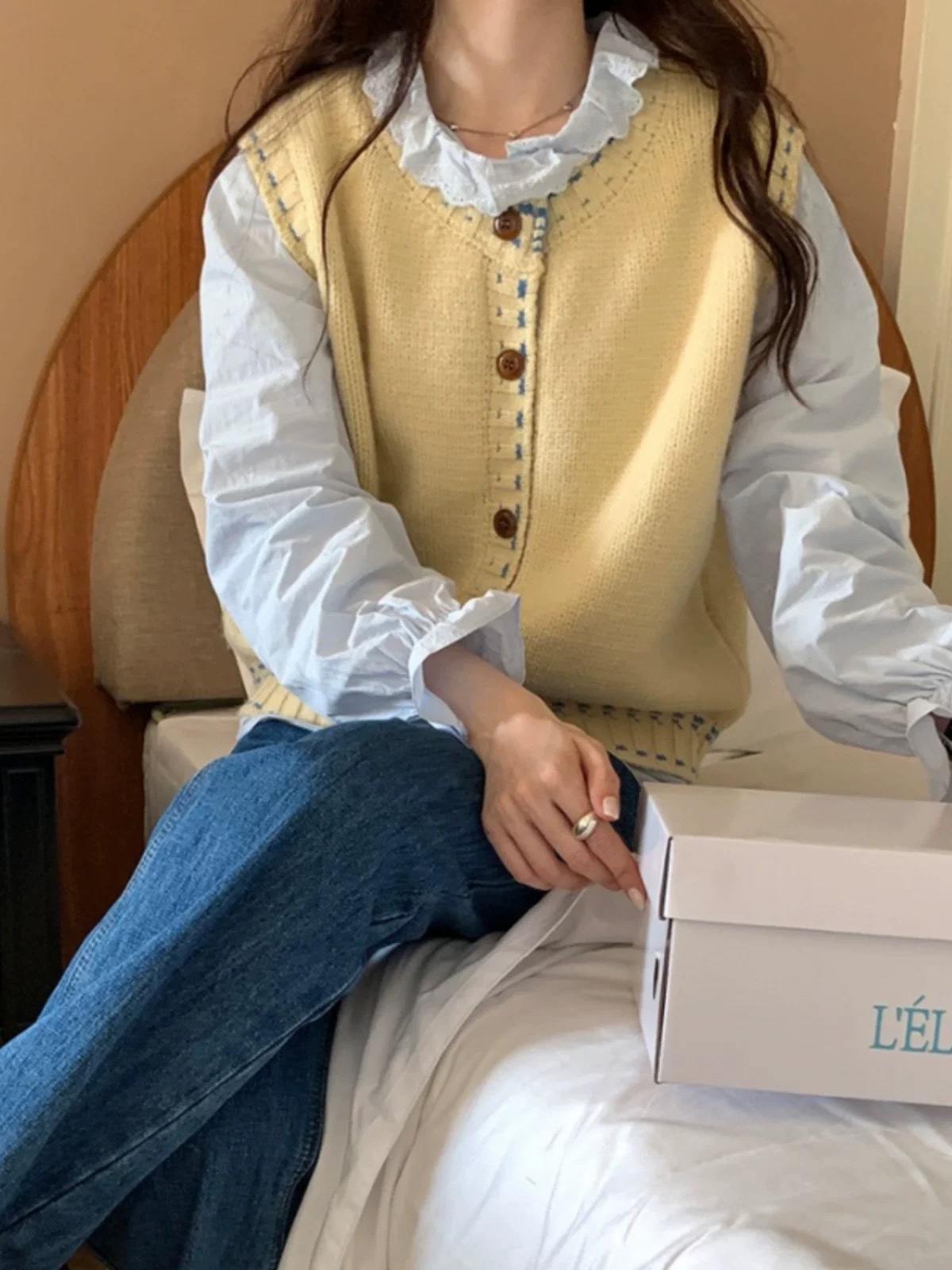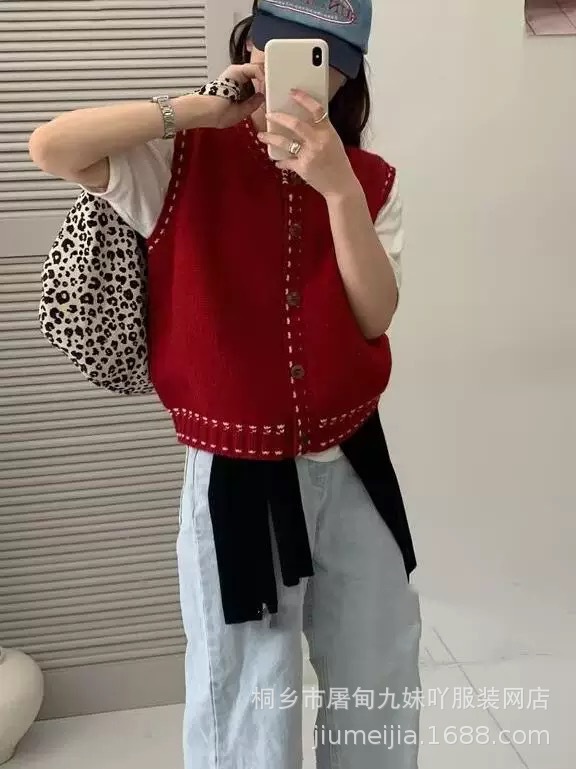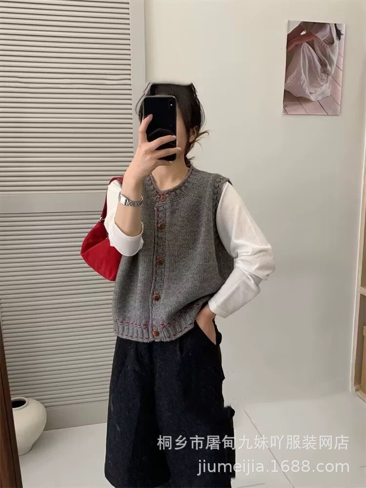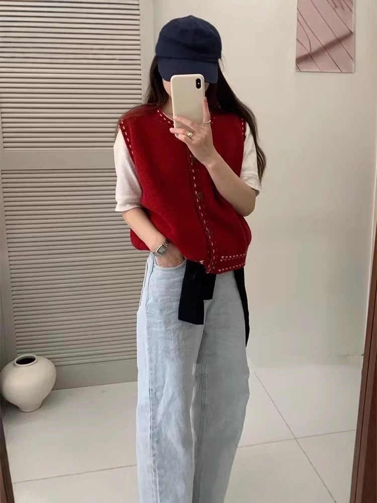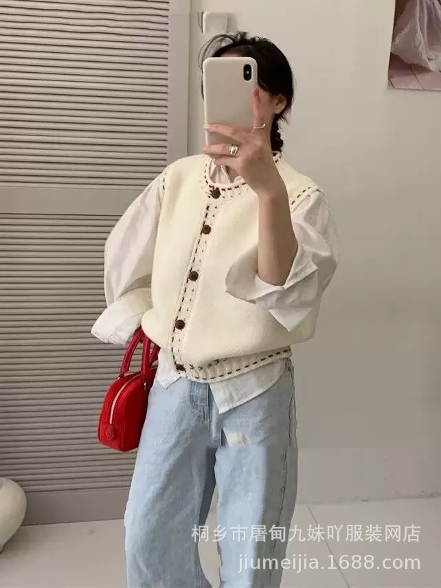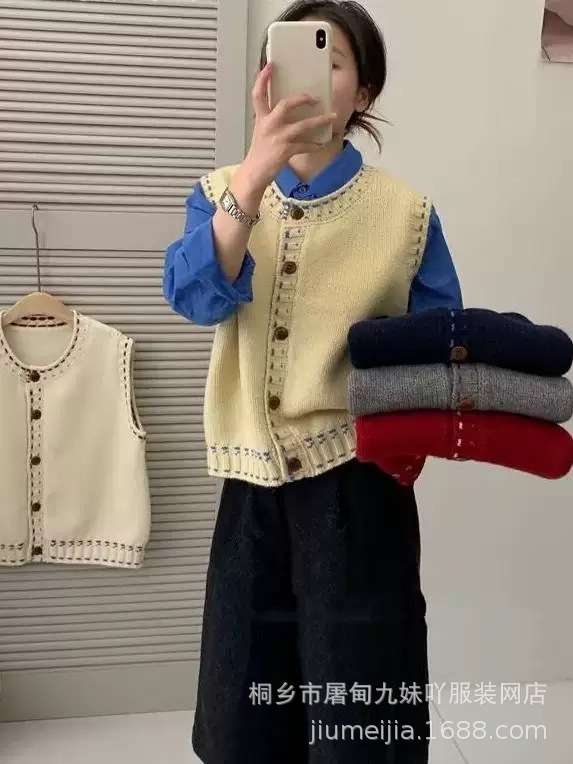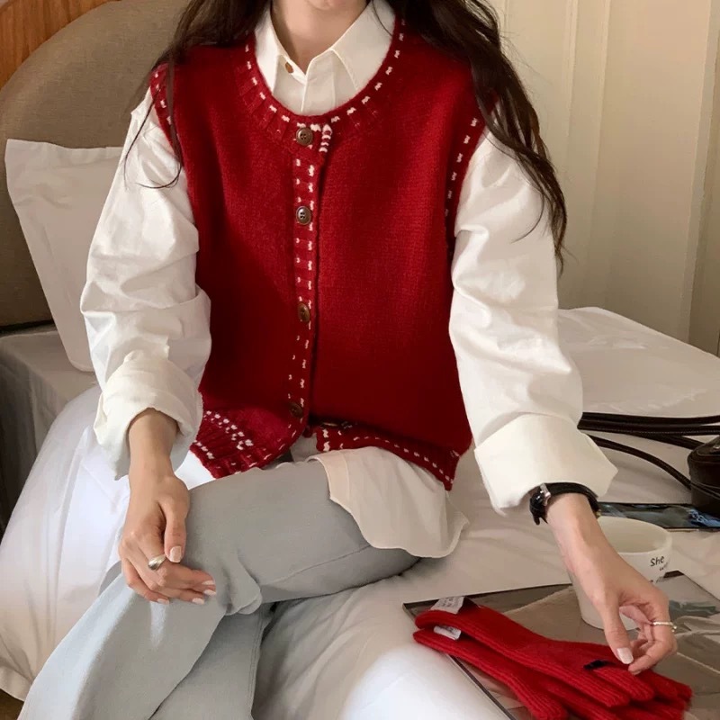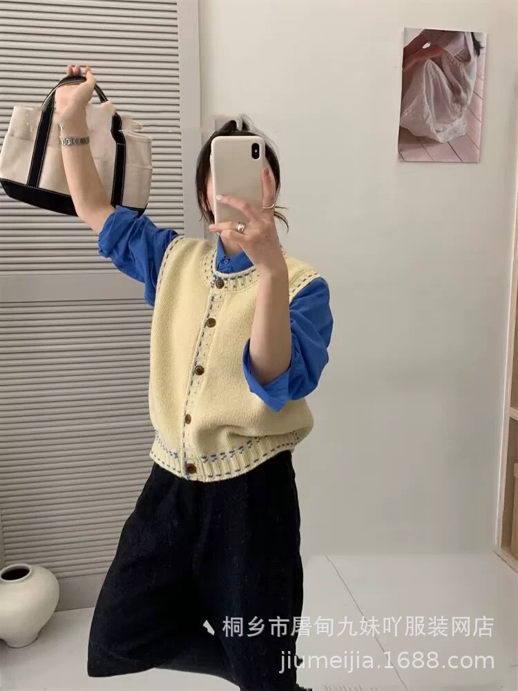 Женский кардиган-жилет в корейском стиле, премиум-класса, с контрастной расцветкой, круглым вырезом, повседневный, новый стиль 2025 года, трикотажный.