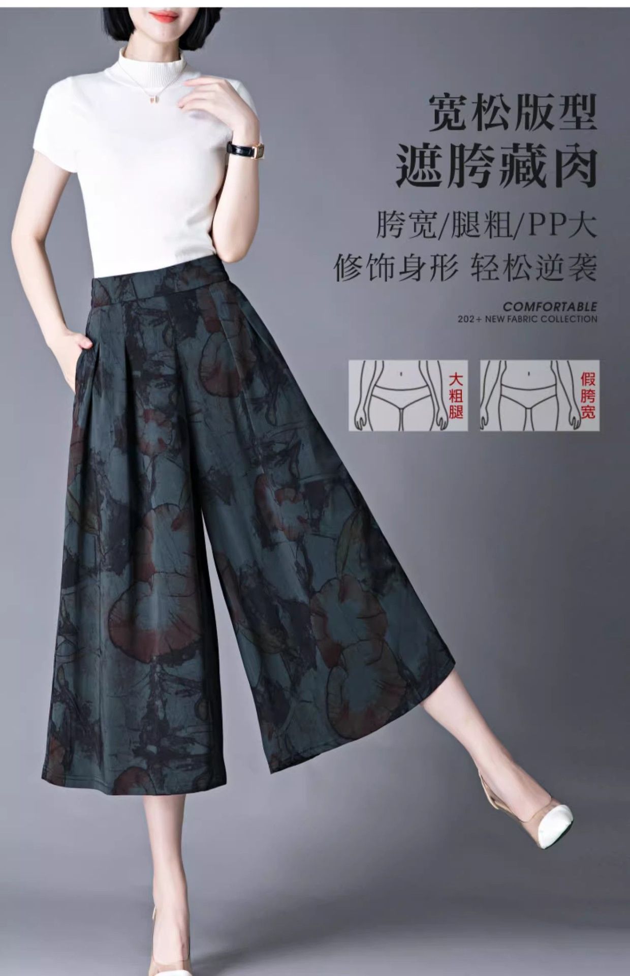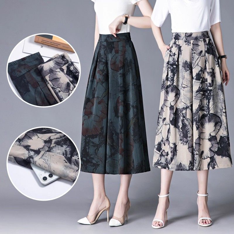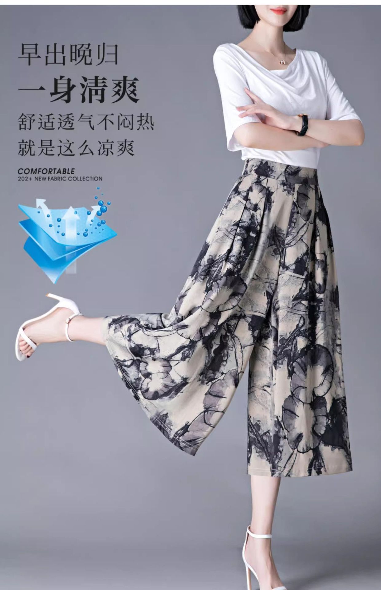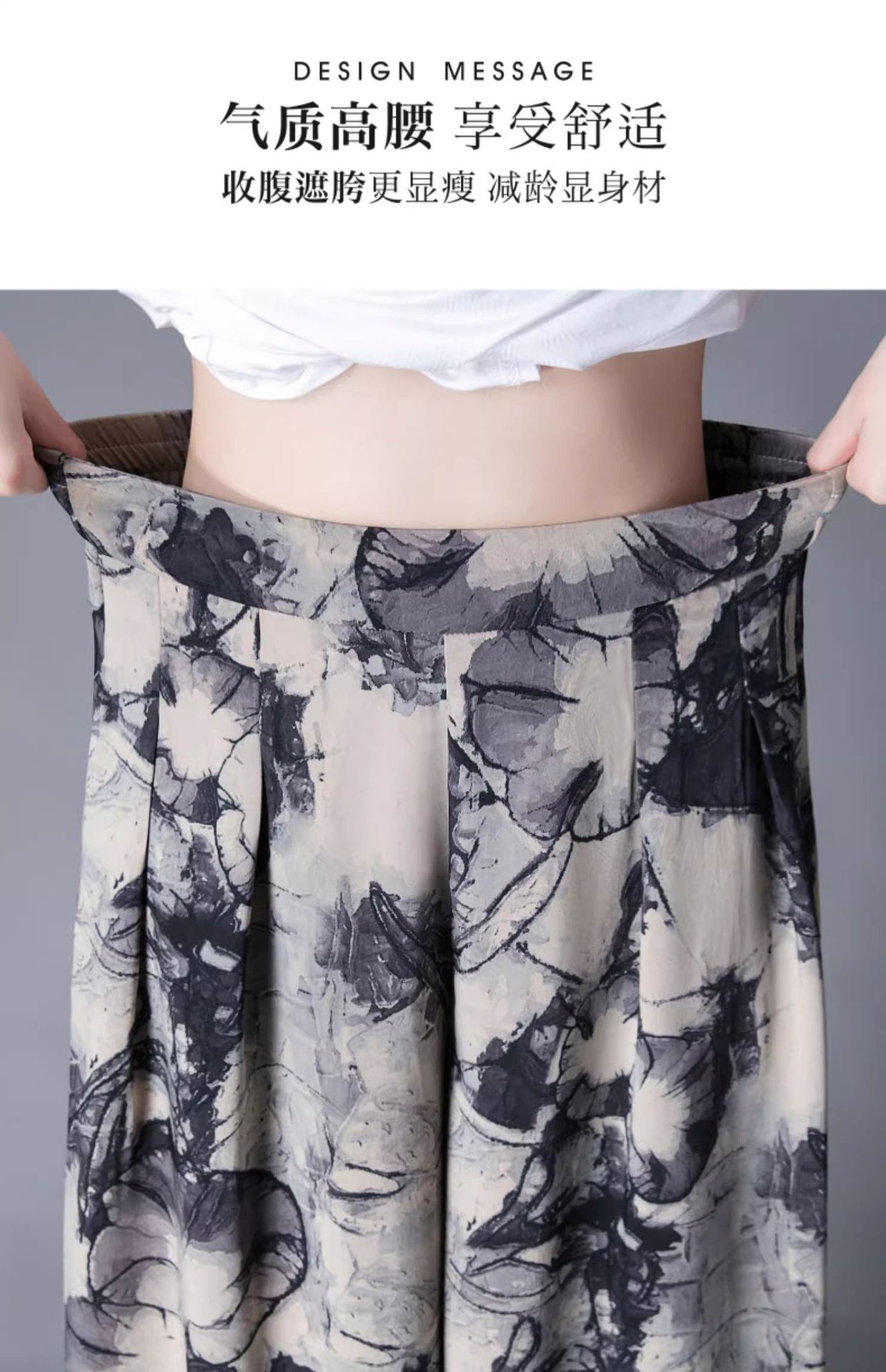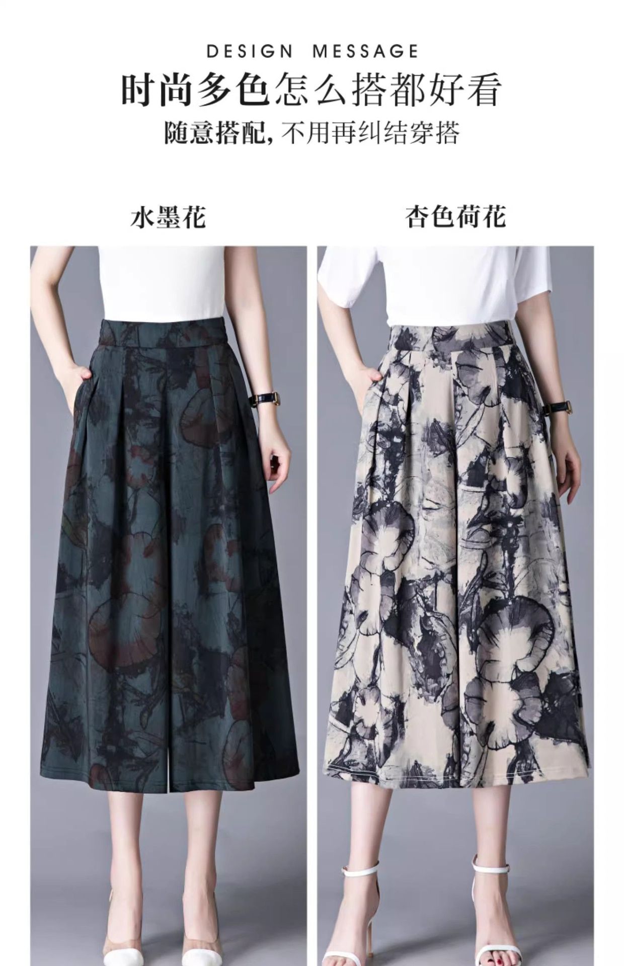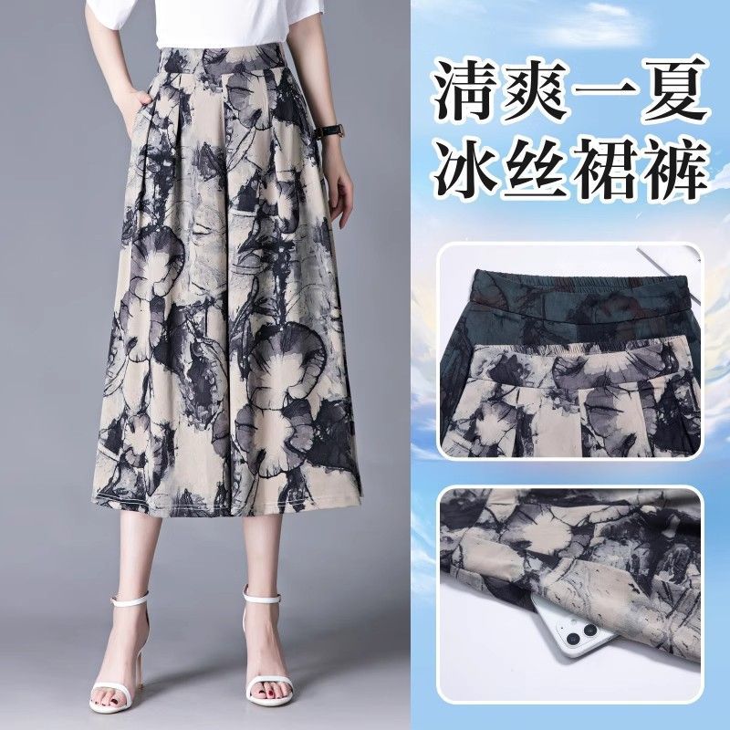 Летние брюки-кюлоты из ледяного шелка в китайском стиле, тонкие, свободные, с драпировкой, высокая талия, широкие штанины, для женщин среднего возраста, 2025 г.