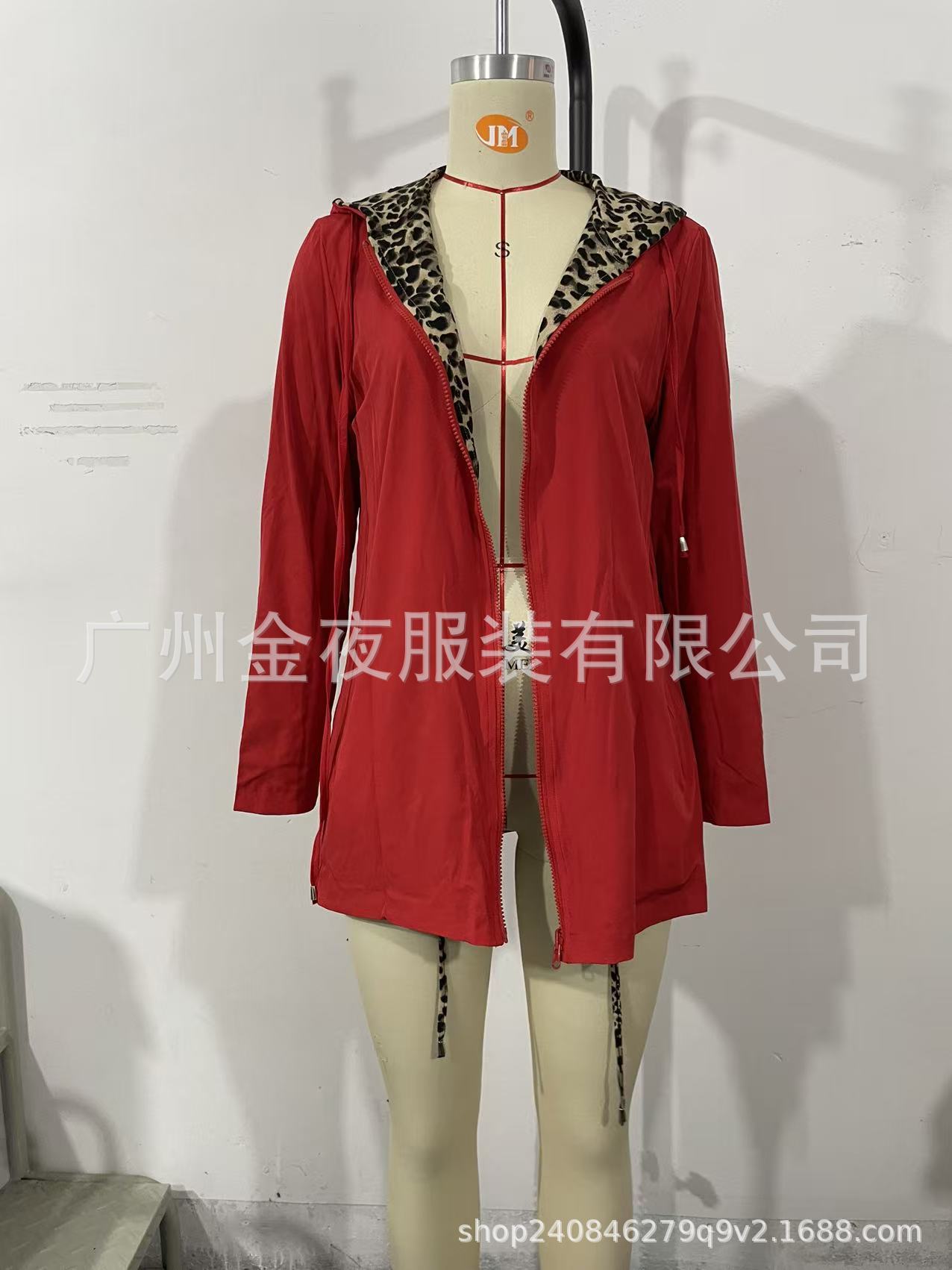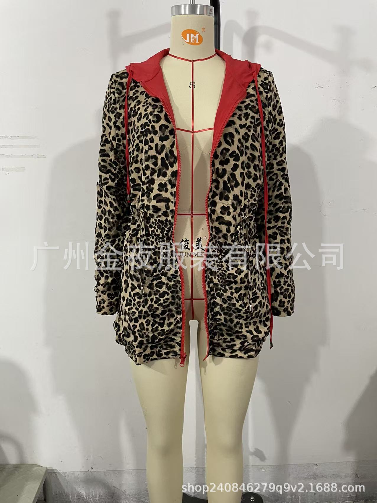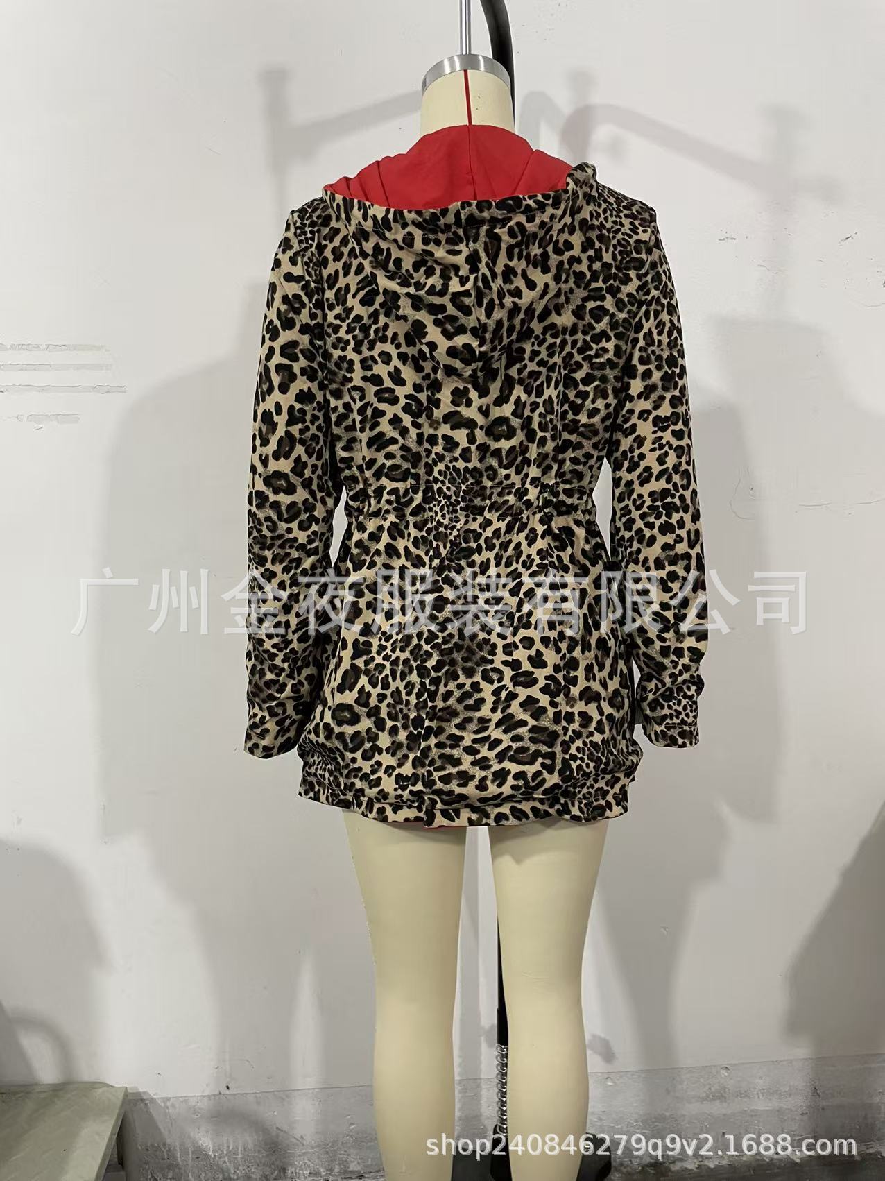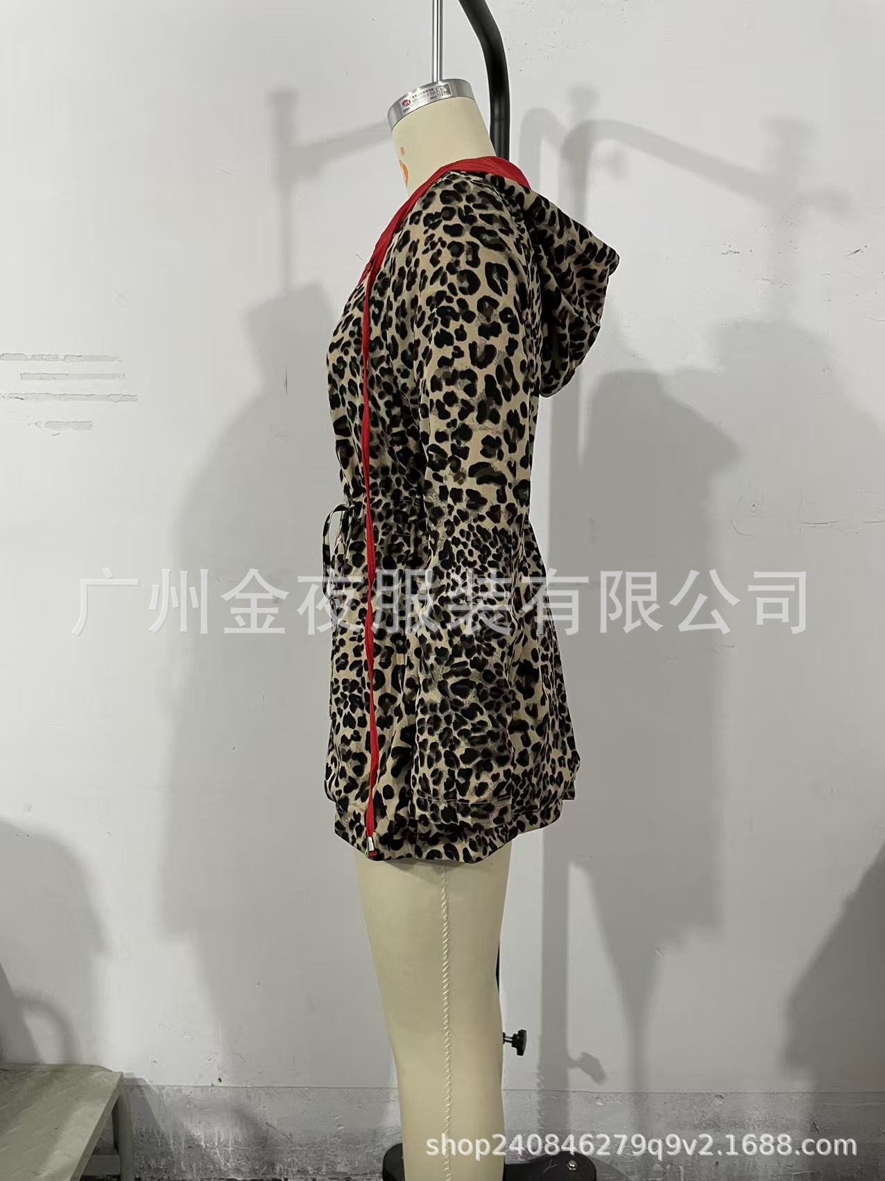 Европейский и американский трансграничный экспорт, женская двусторонняя куртка на молнии с капюшоном, повседневная длинная верхняя одежда с леопардовым принтом, пояс, толстовка с длинными рукавами