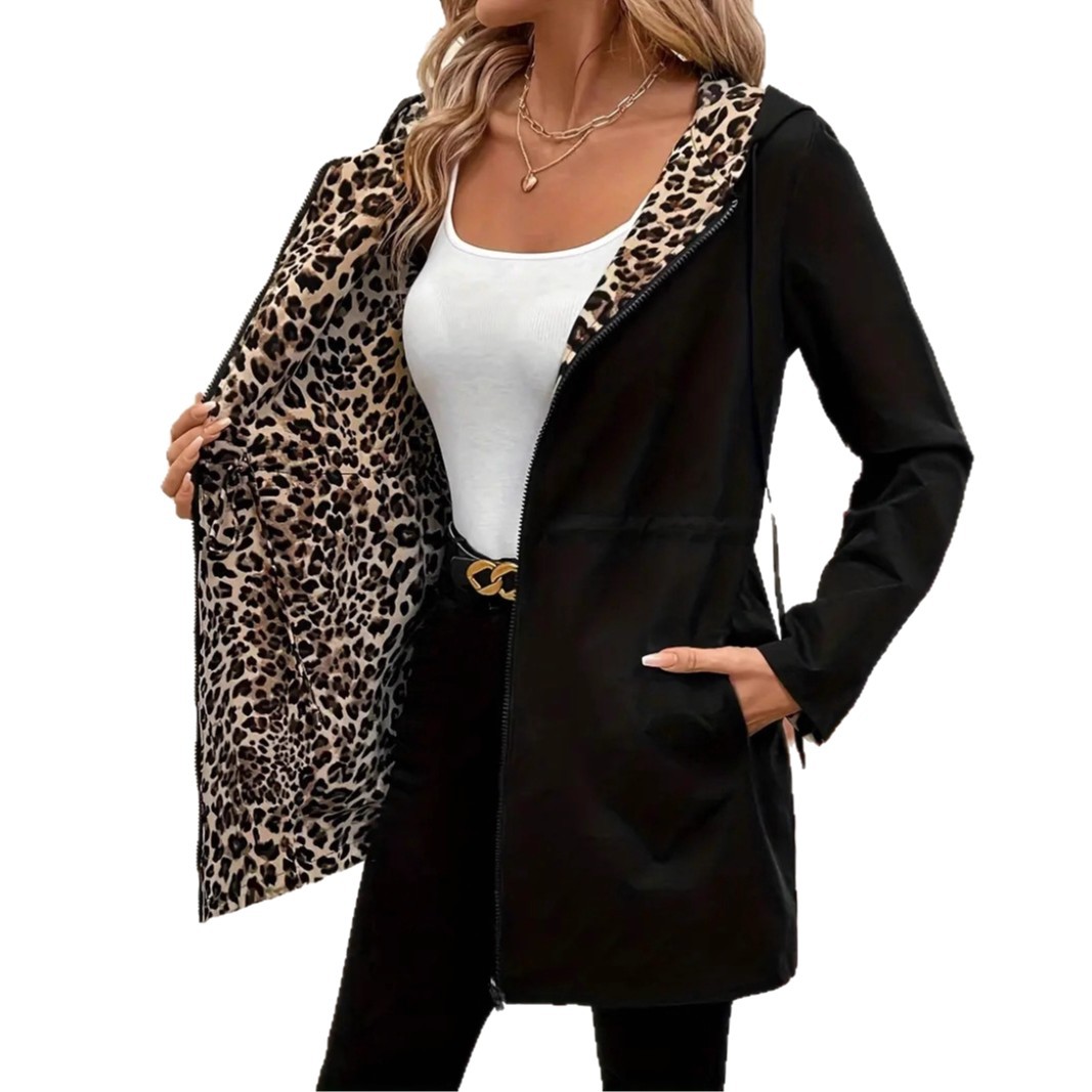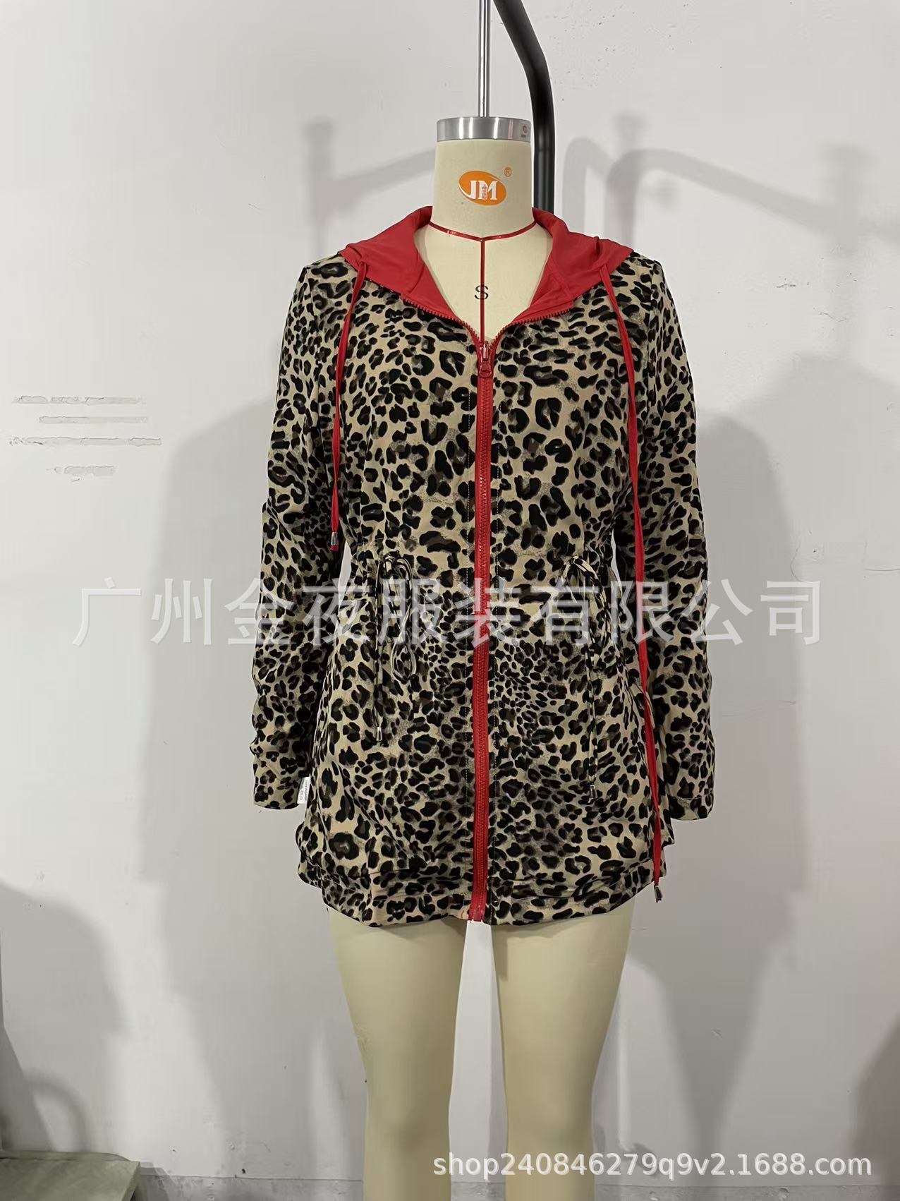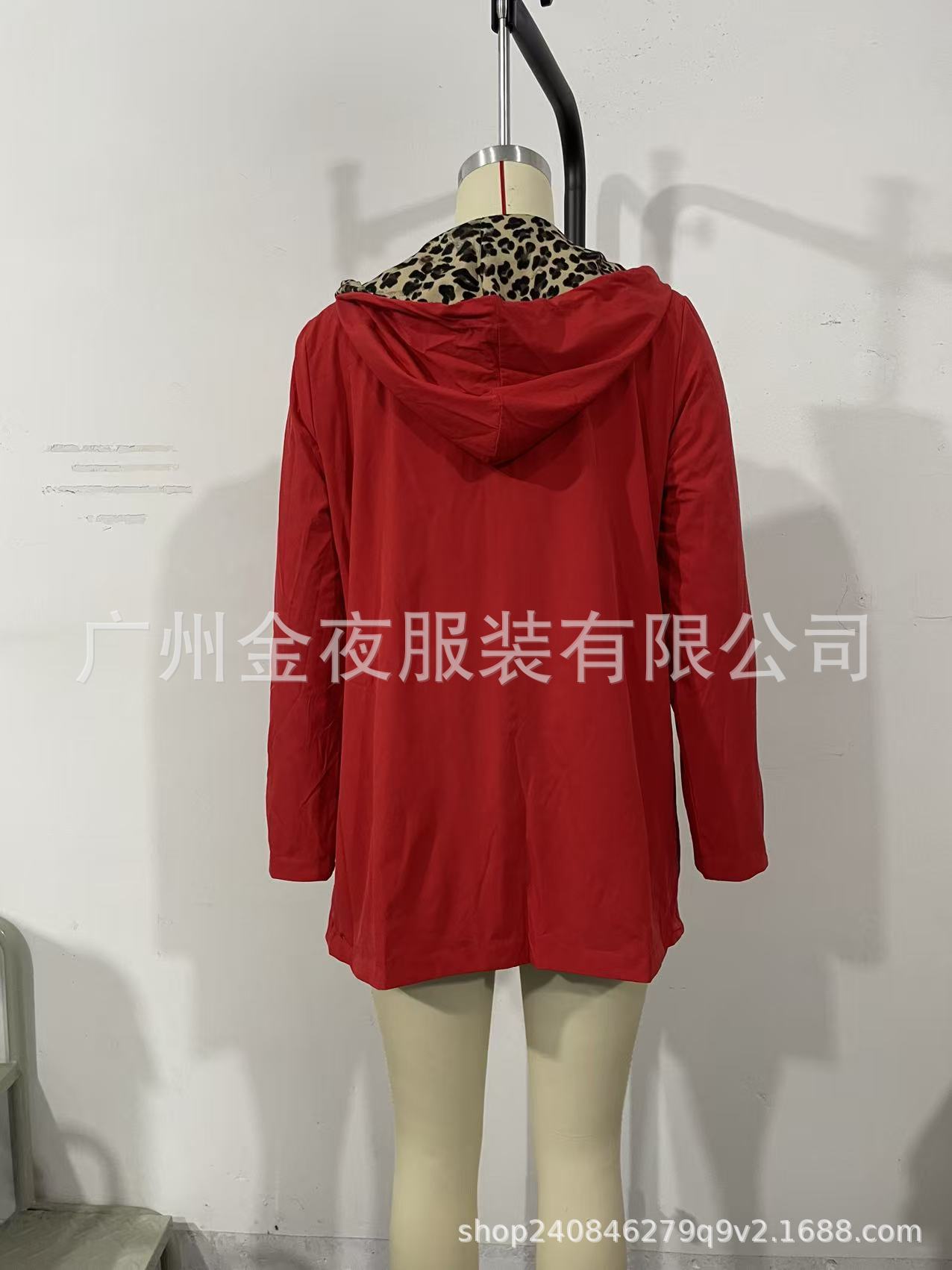 Европейский и американский трансграничный экспорт, женская двусторонняя куртка на молнии с капюшоном, повседневная длинная верхняя одежда с леопардовым принтом, пояс, толстовка с длинными рукавами