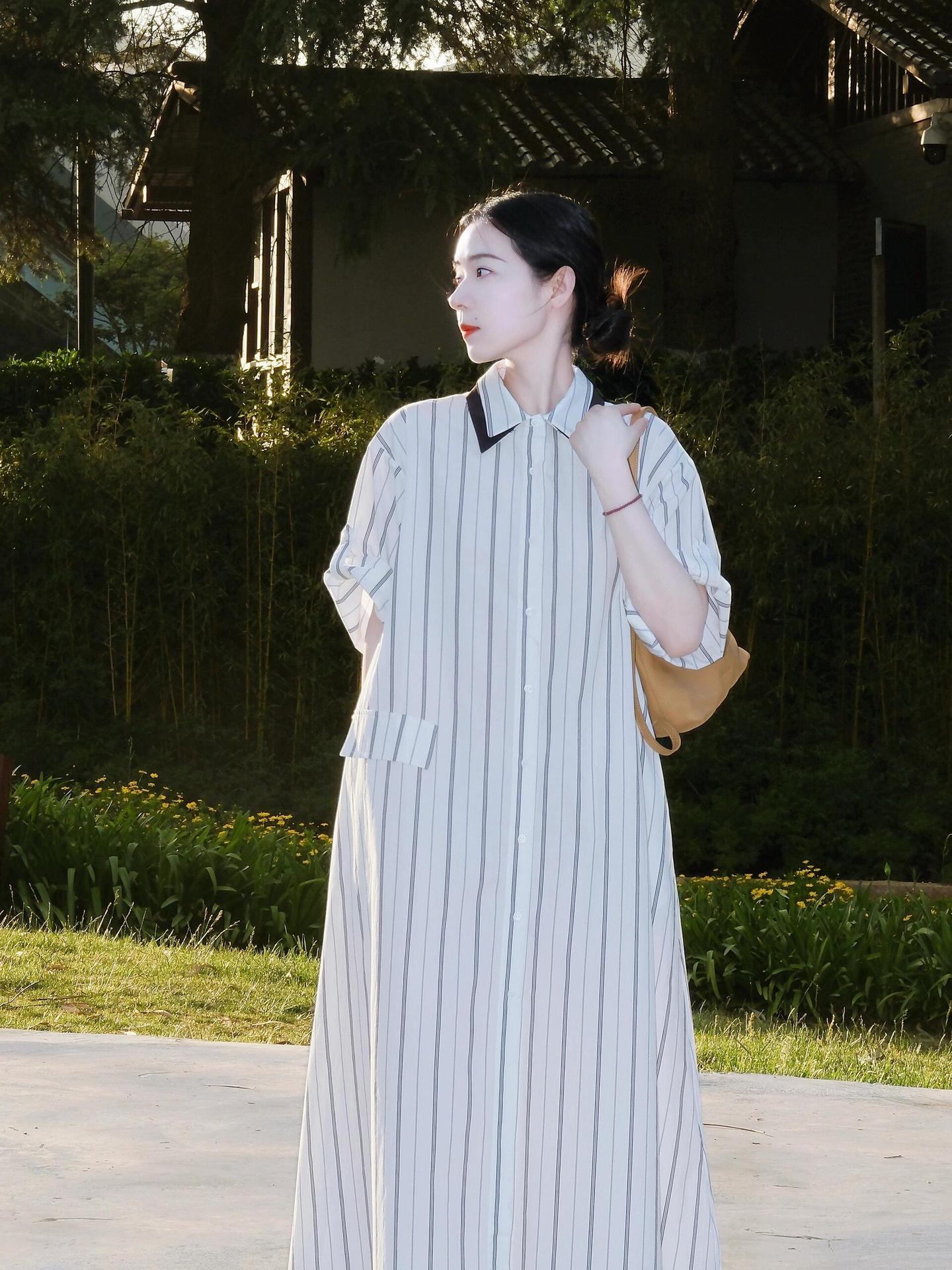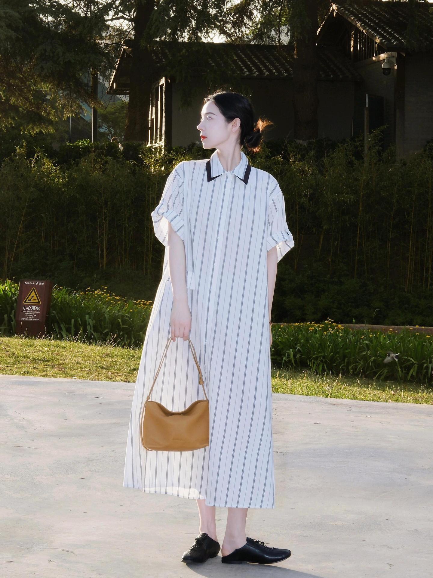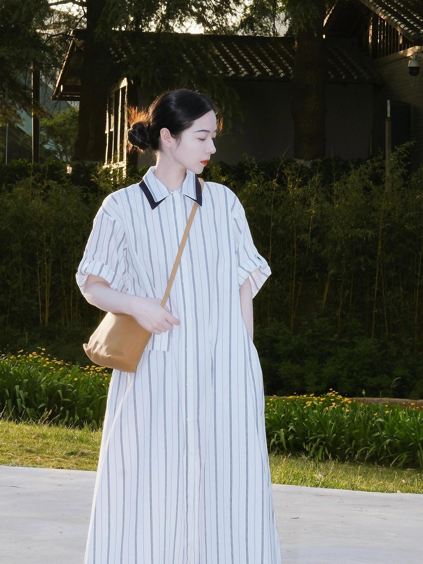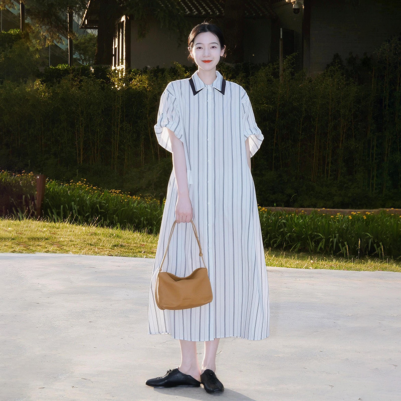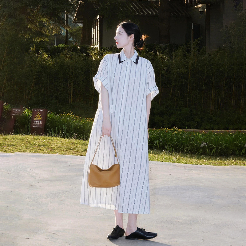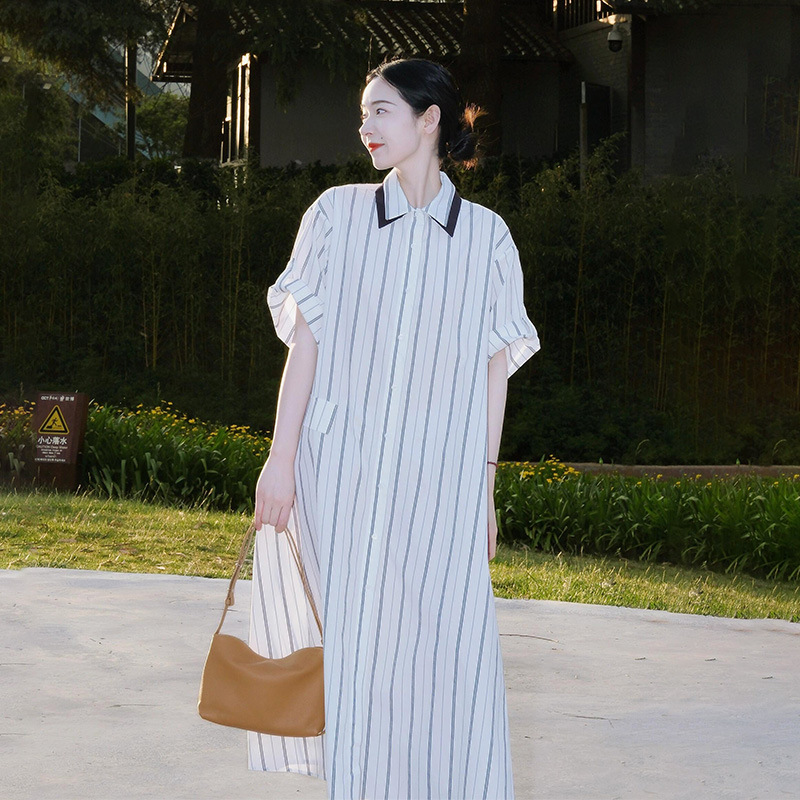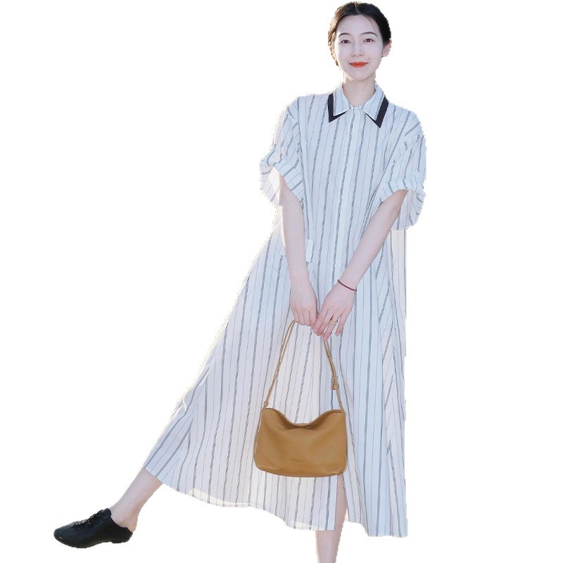 Платье с воротником ПОЛО, повседневная длинная юбка для рабочей одежды, простая и элегантная летняя одежда, свободная юбка-рубашка в полоску.