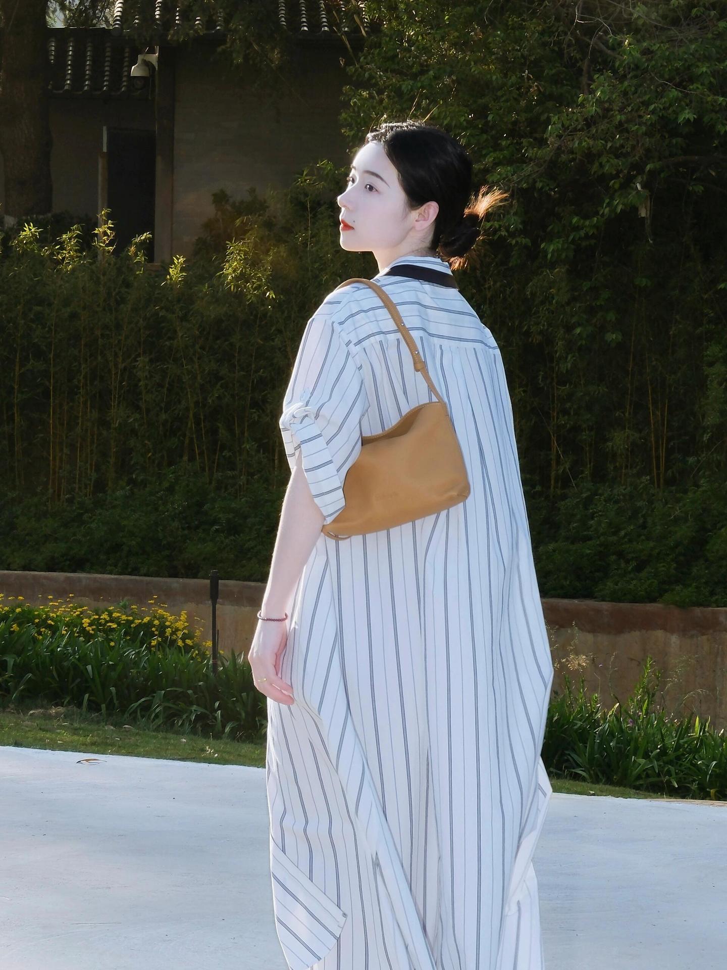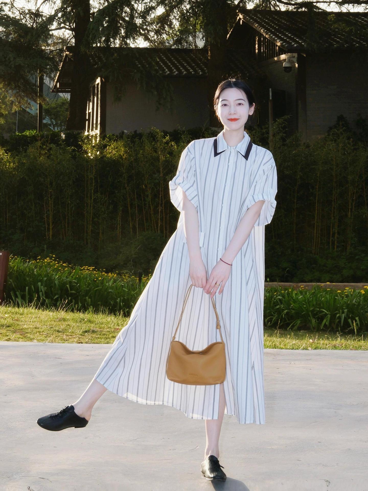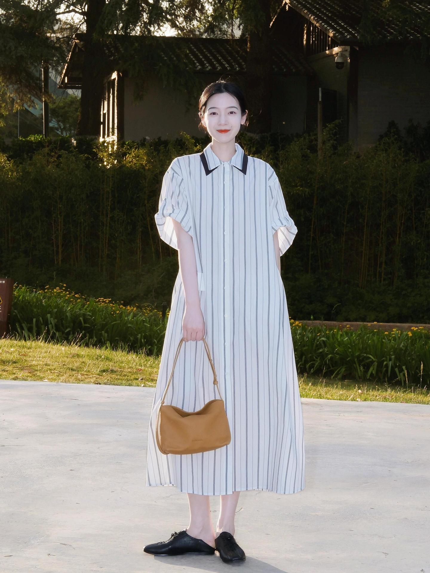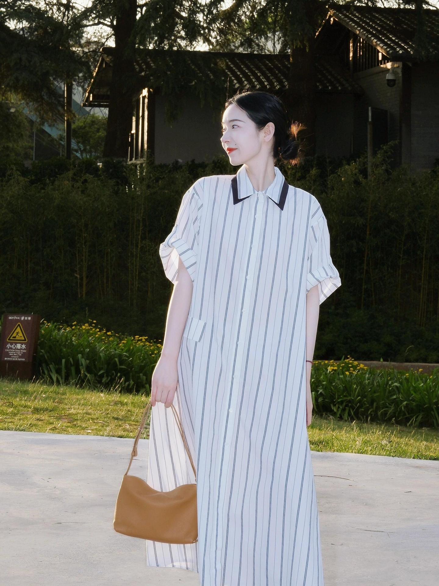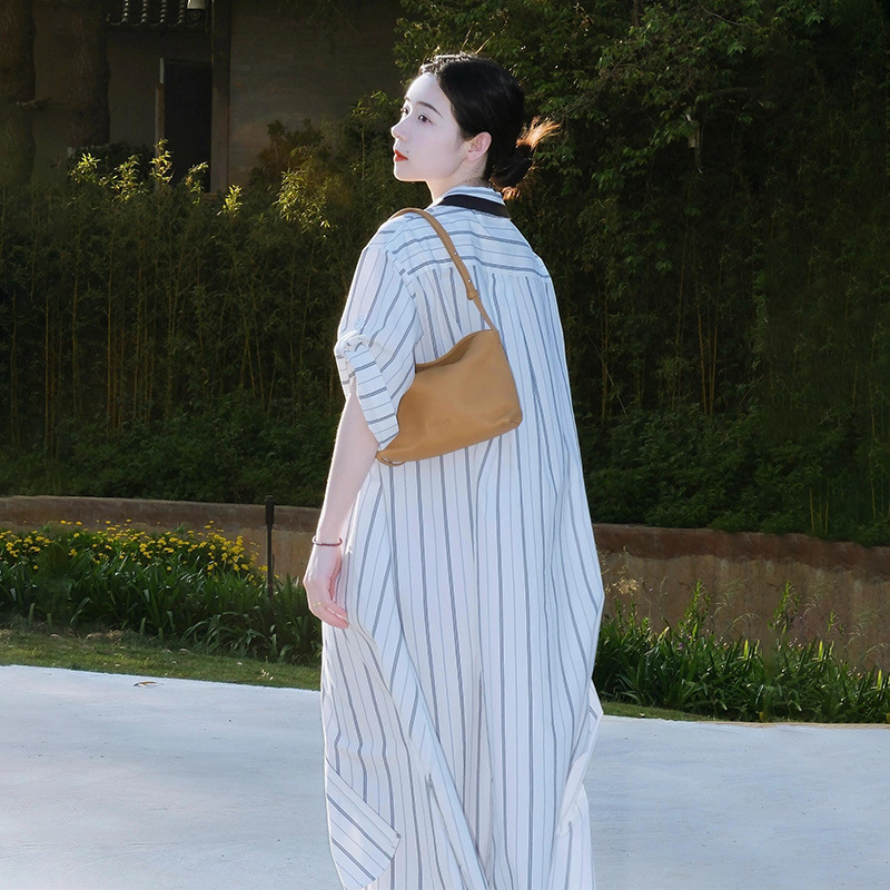 Платье с воротником ПОЛО, повседневная длинная юбка для рабочей одежды, простая и элегантная летняя одежда, свободная юбка-рубашка в полоску.