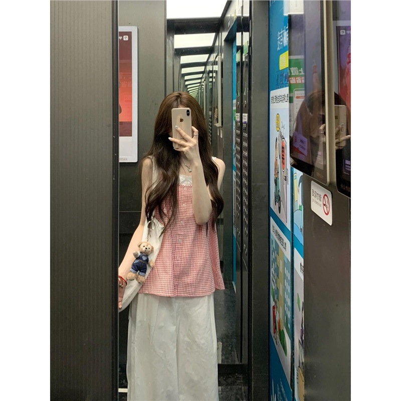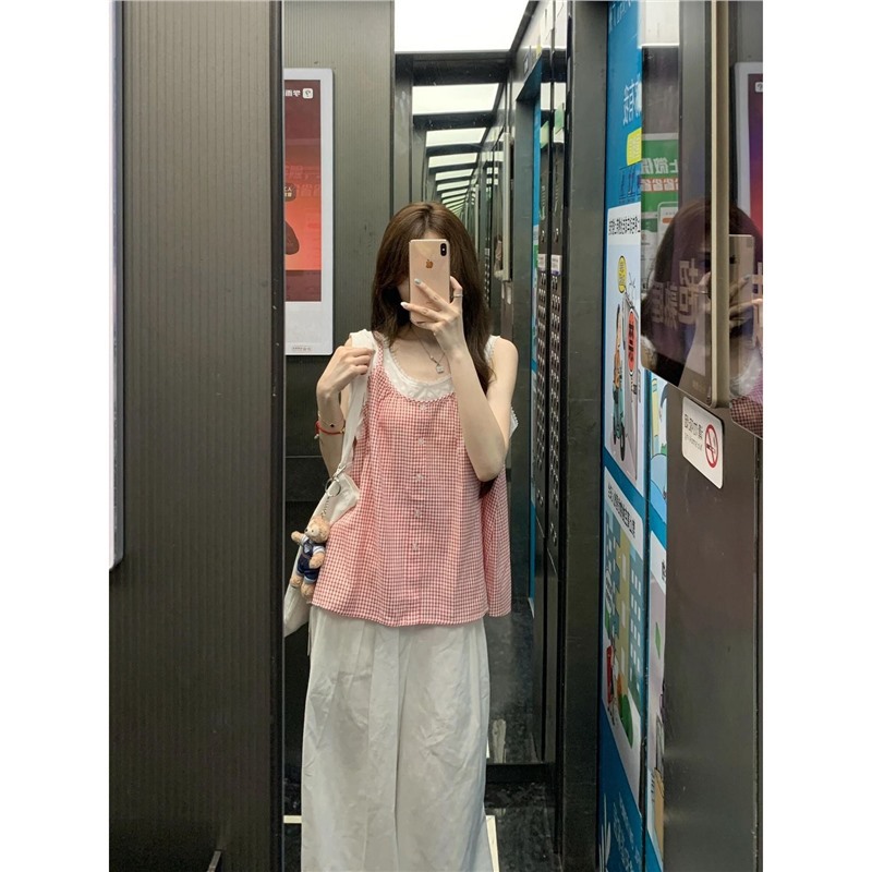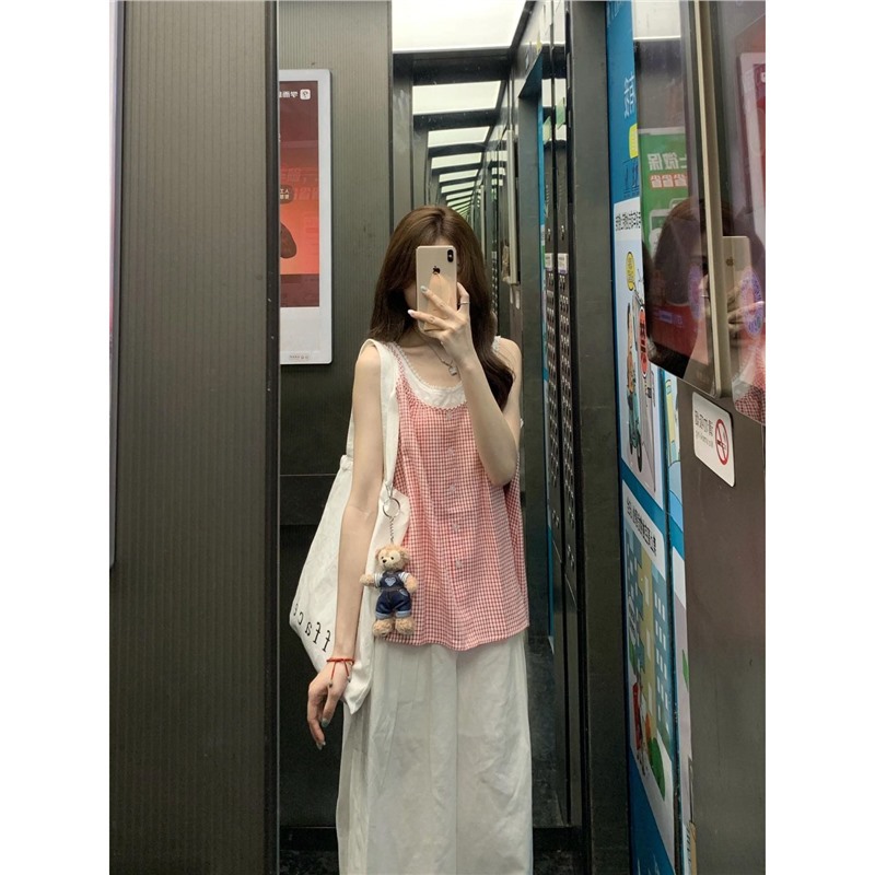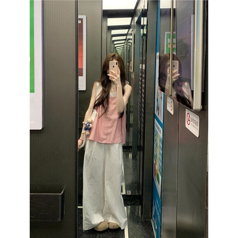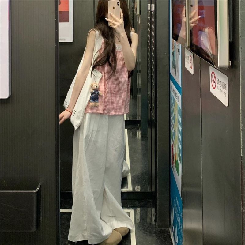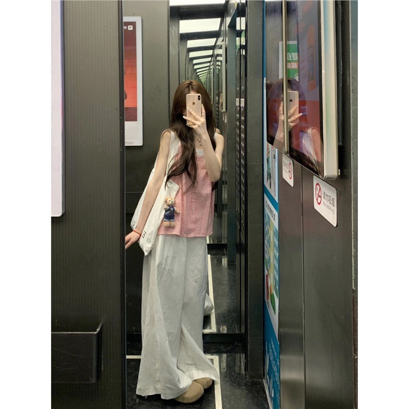 Корейский сладкий повседневный спортивный костюм для женщин, летний клетчатый топ без рукавов, широкие брюки, миниатюрный комплект из двух предметов