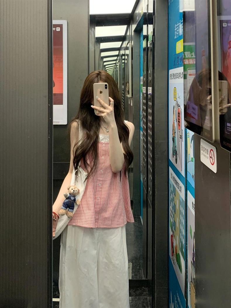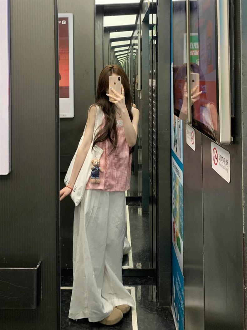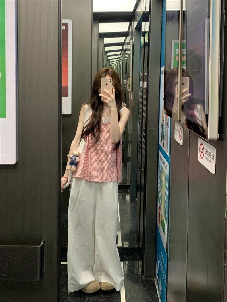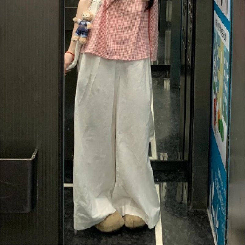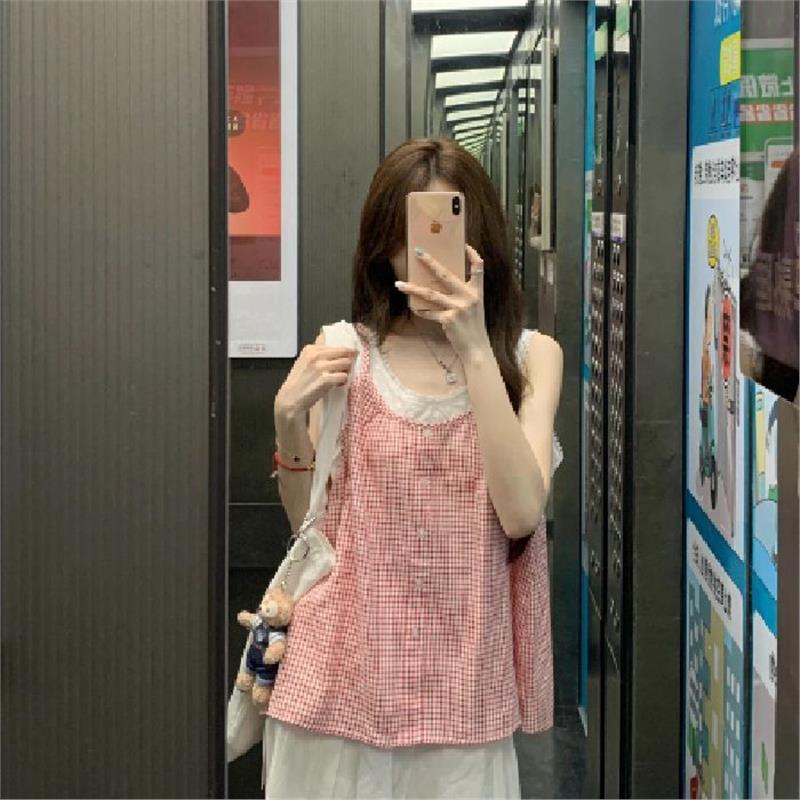 Корейский сладкий повседневный спортивный костюм для женщин, летний клетчатый топ без рукавов, широкие брюки, миниатюрный комплект из двух предметов