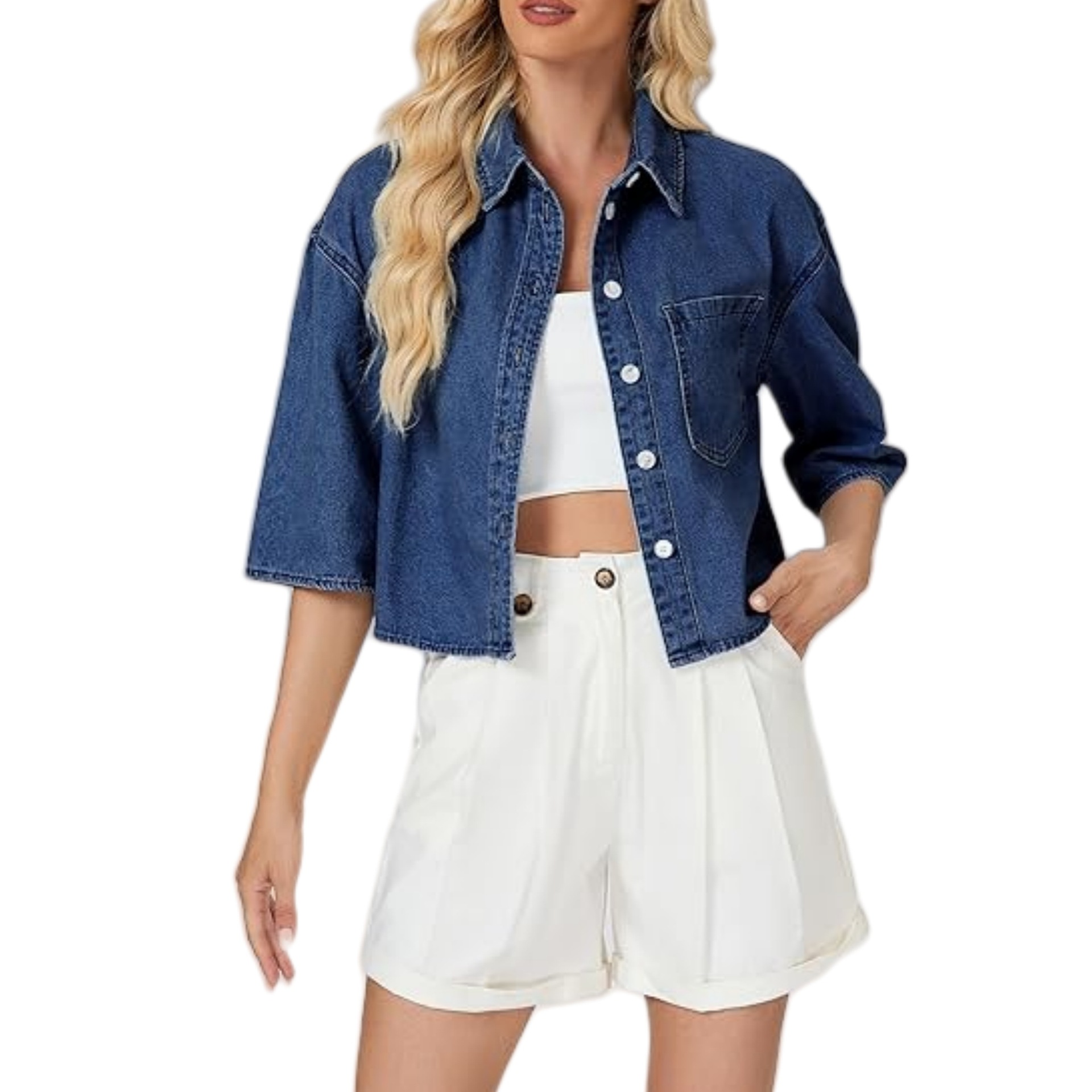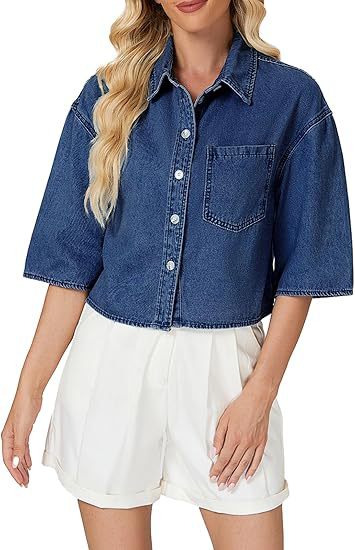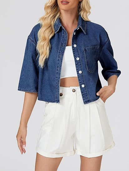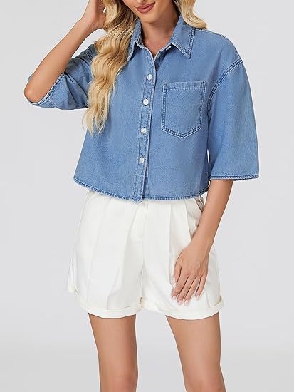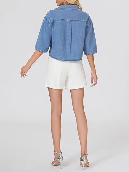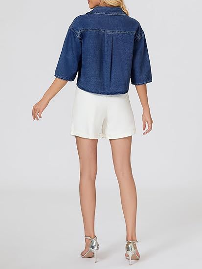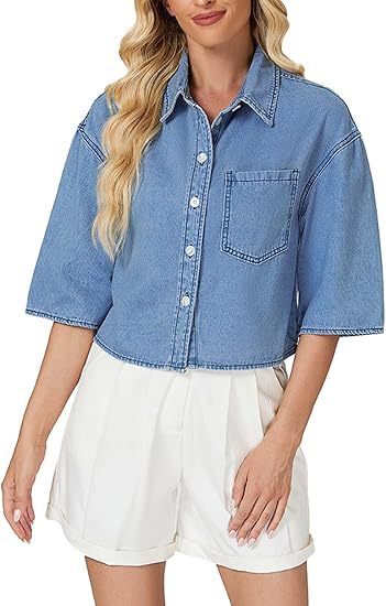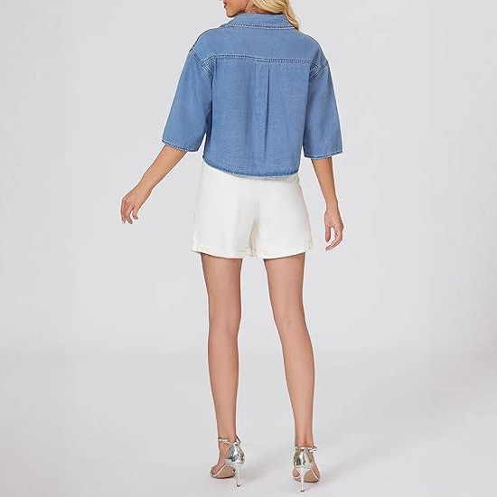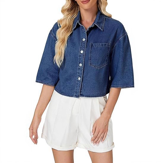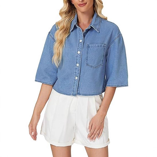 2025 трансграничная европейская и американская женская модная джинсовая короткая рубашка с короткими рукавами и пуговицами, джинсовый топ с карманами на клапане