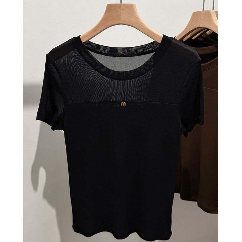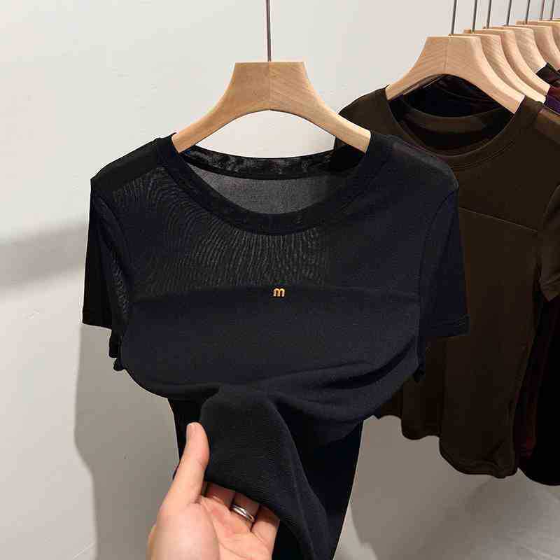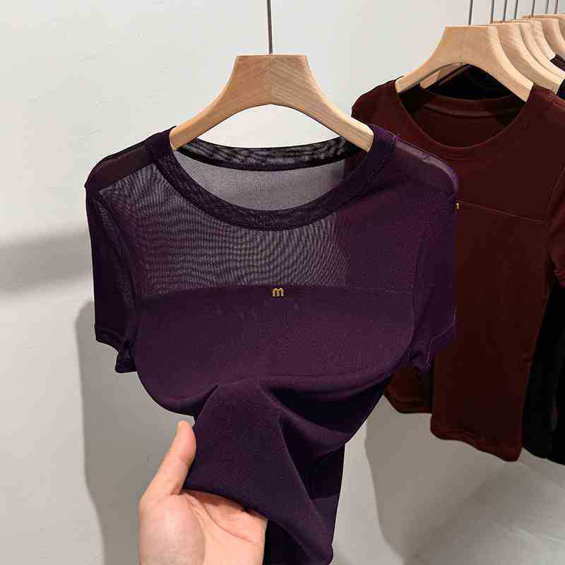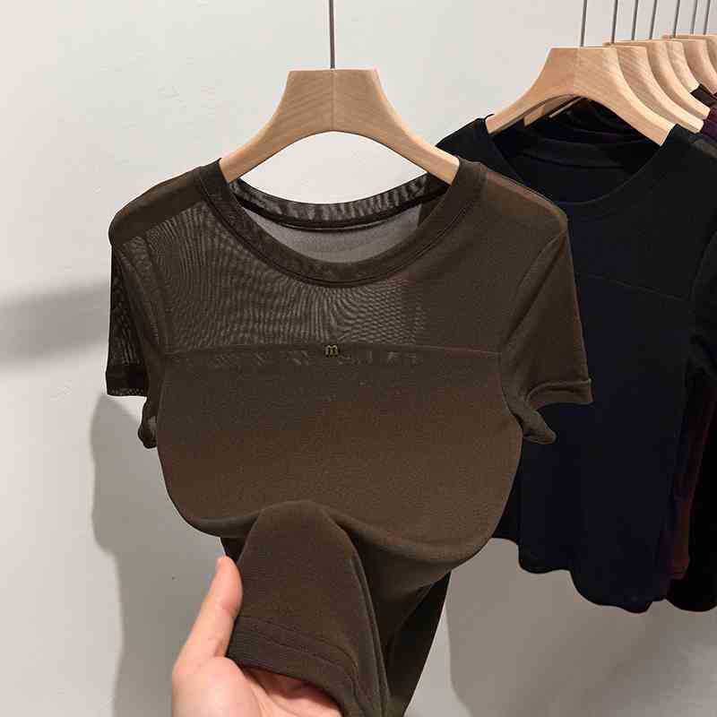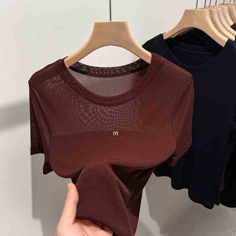 Модная женская футболка из сетки премиум-класса, лето 2025, новая, приталенная, с круглым вырезом и коротким рукавом, на одно плечо
