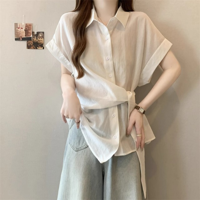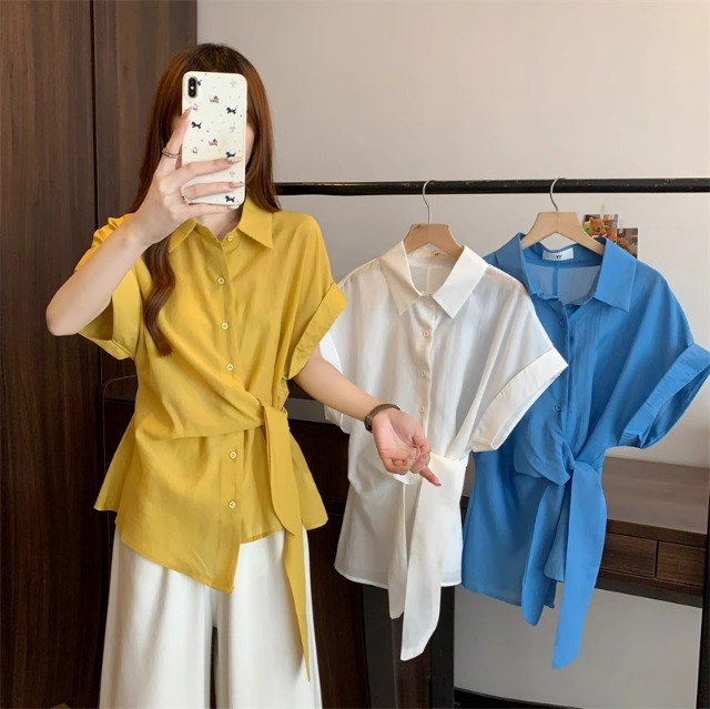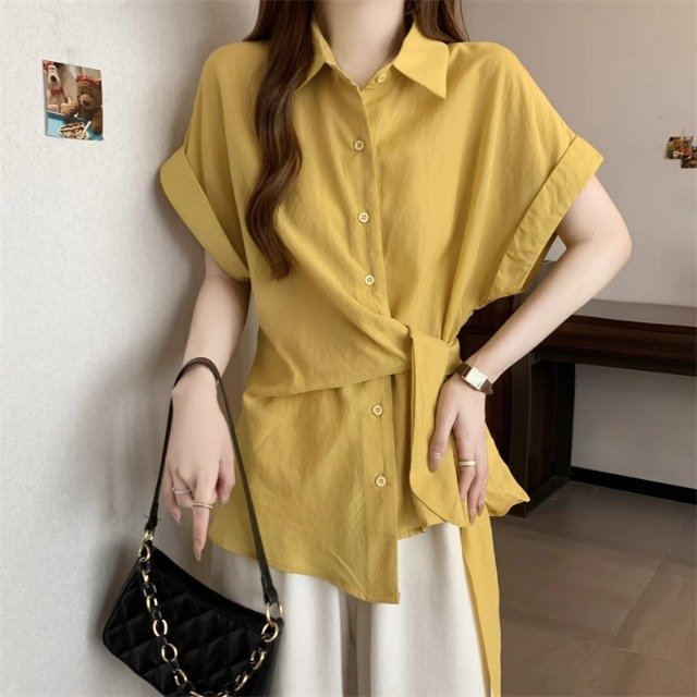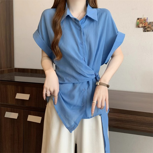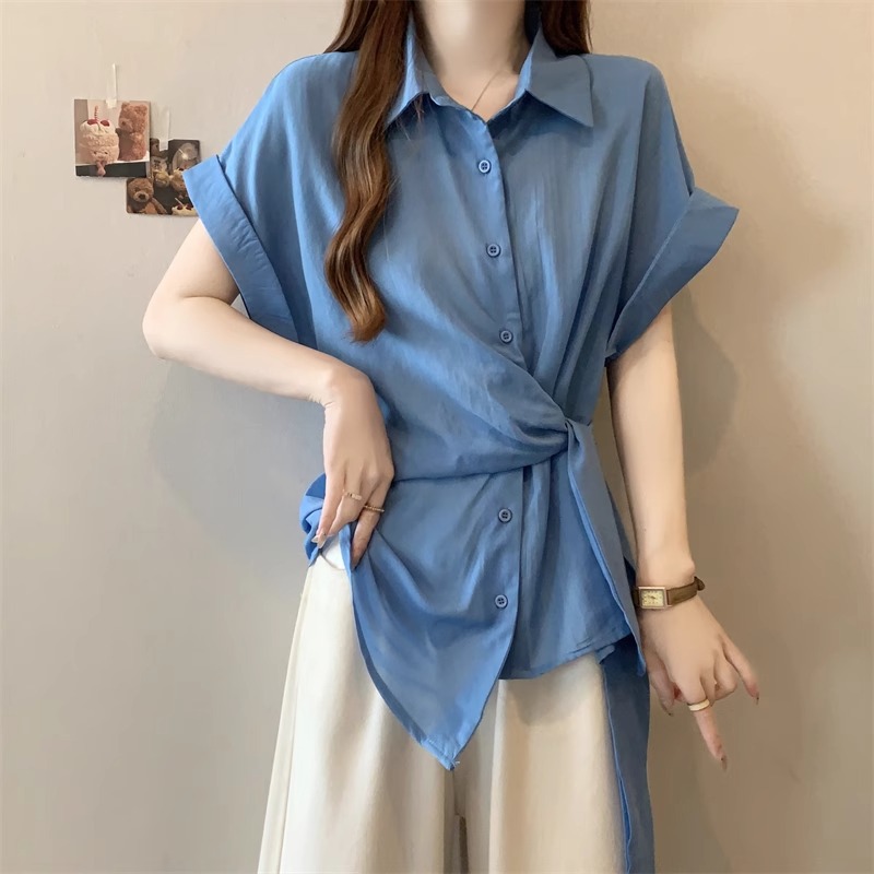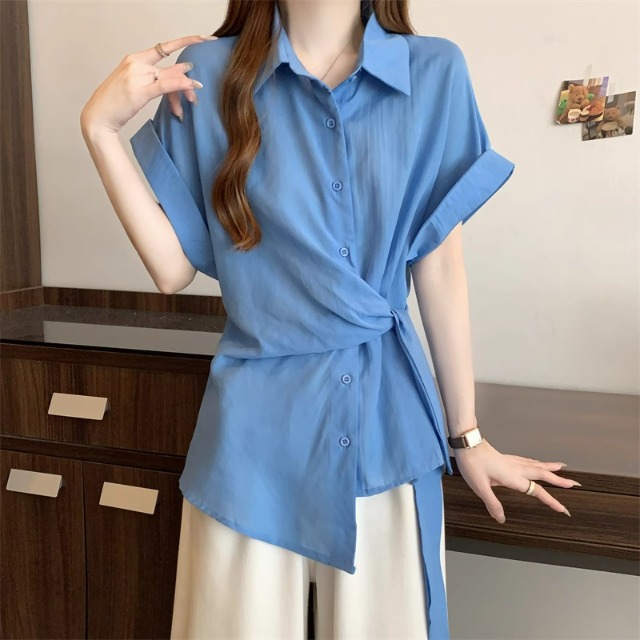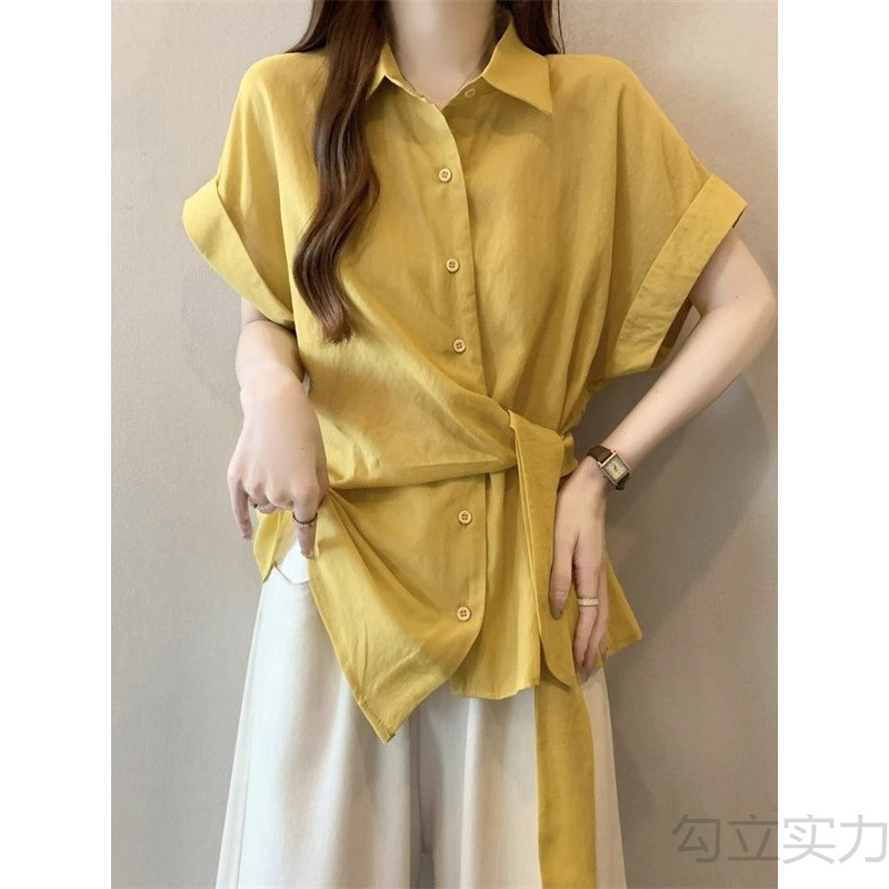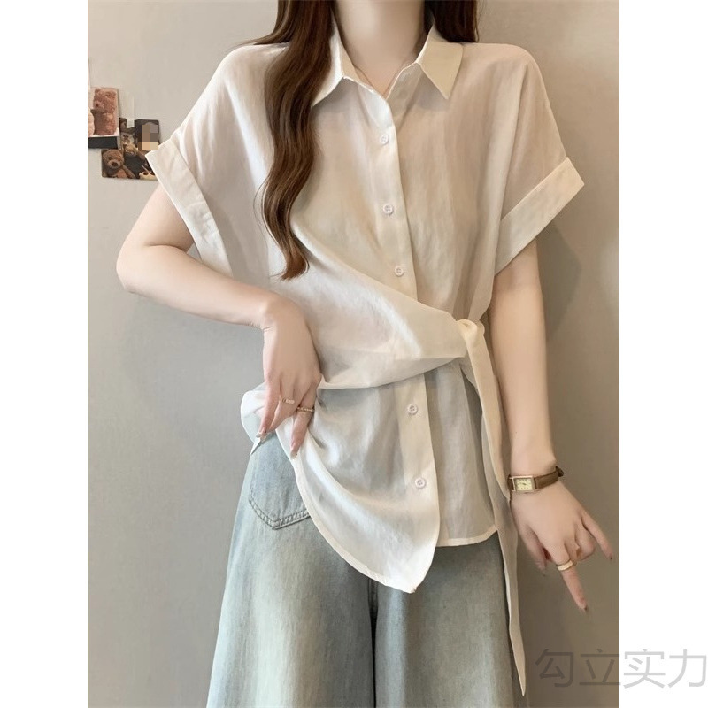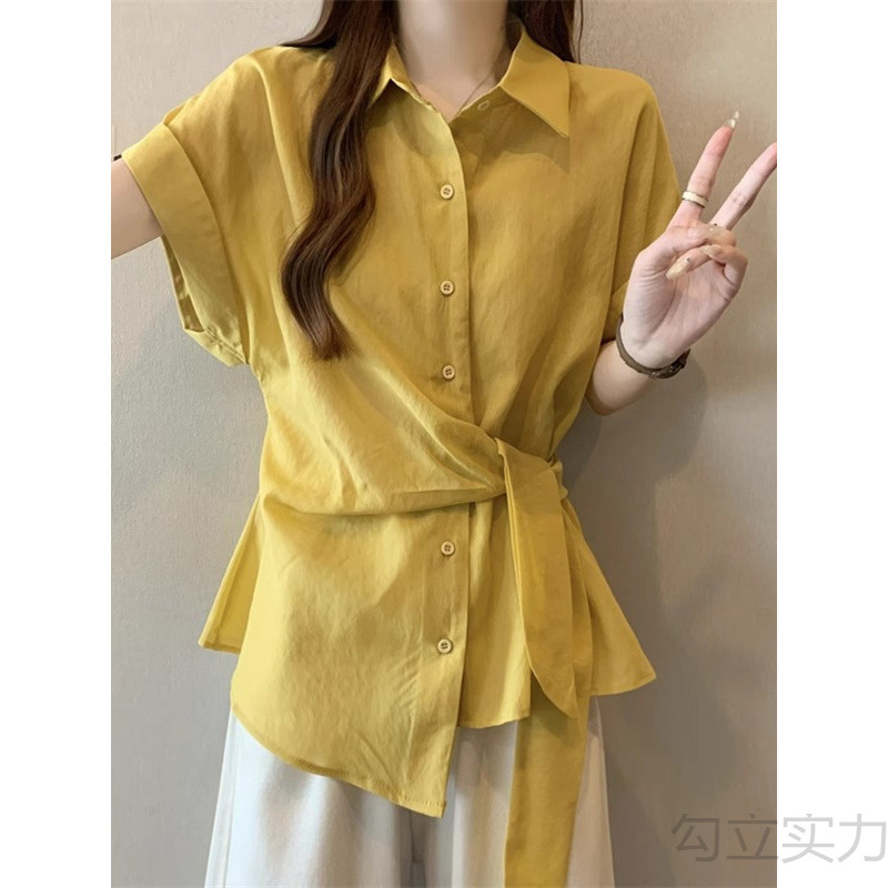 Женская рубашка с короткими рукавами и нерегулярной шнуровкой на талии, лето 2025, большой размер, толстые мм, маленькие летящие рукава, тонкий и стильный топ-рубашка