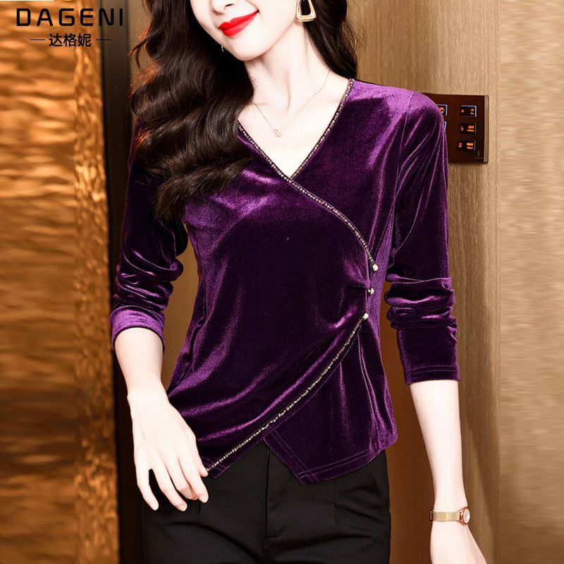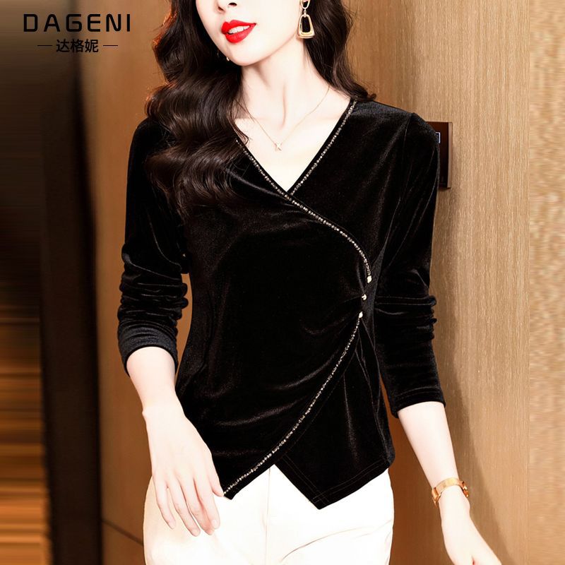 Элитная асимметричная рубашка с V-образным вырезом из бархата, новая европейская футболка с длинным рукавом для начала осени 2025 года, внутренний топ.