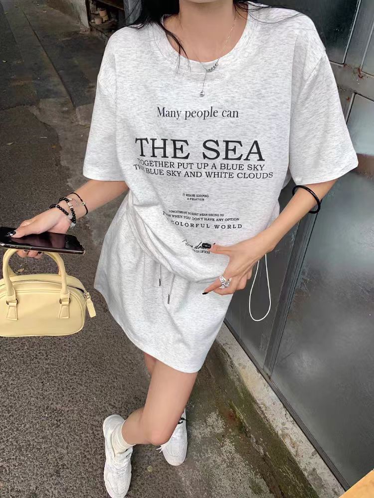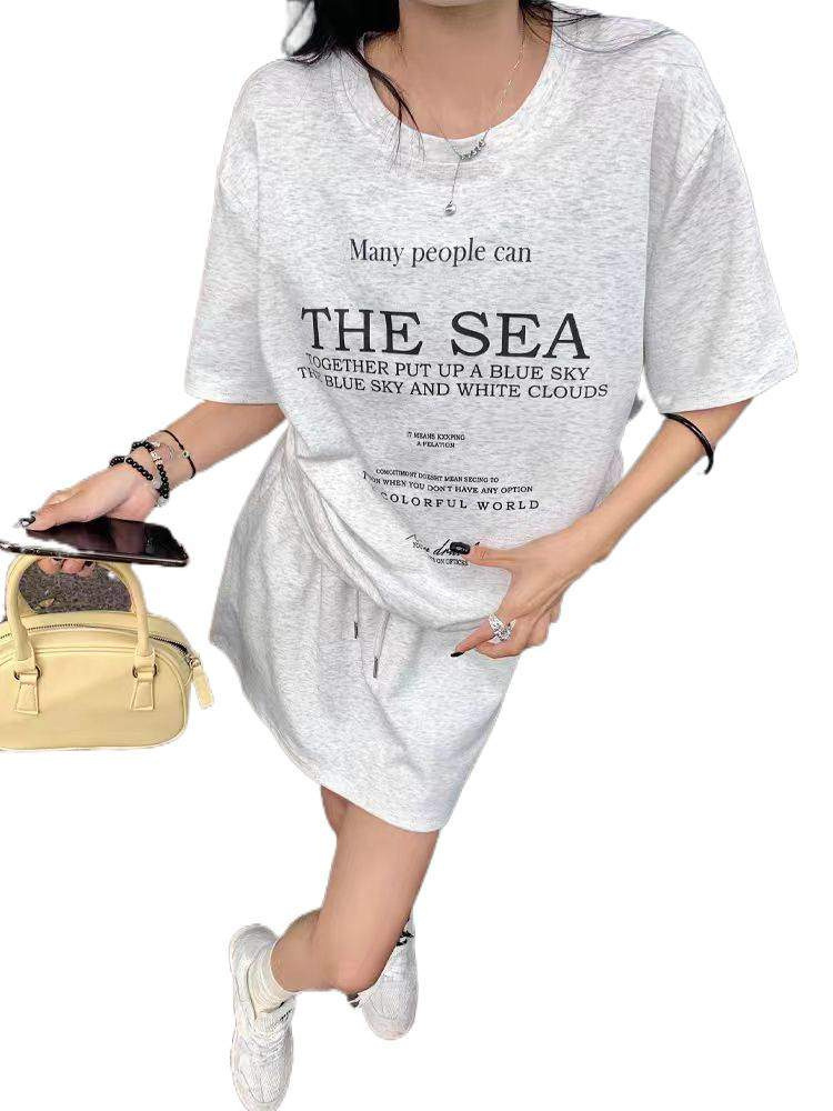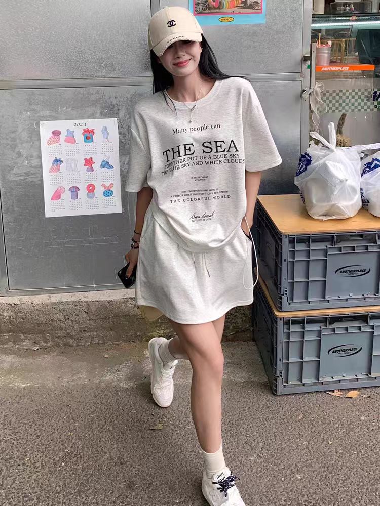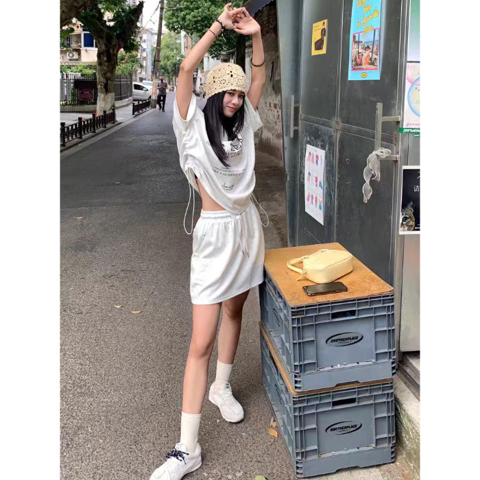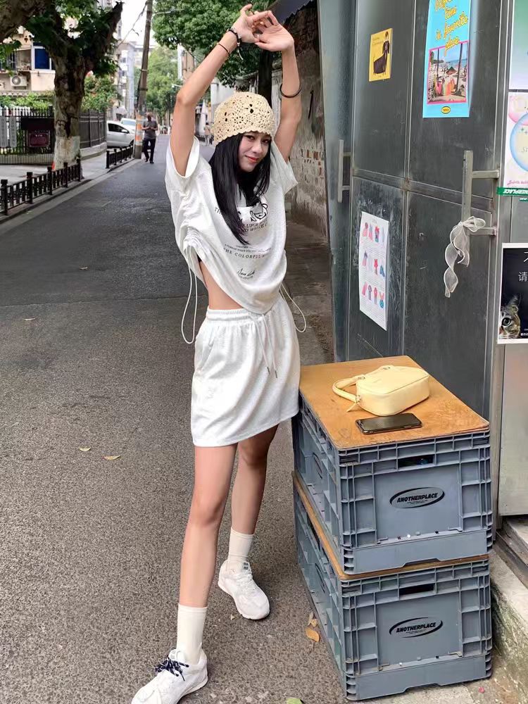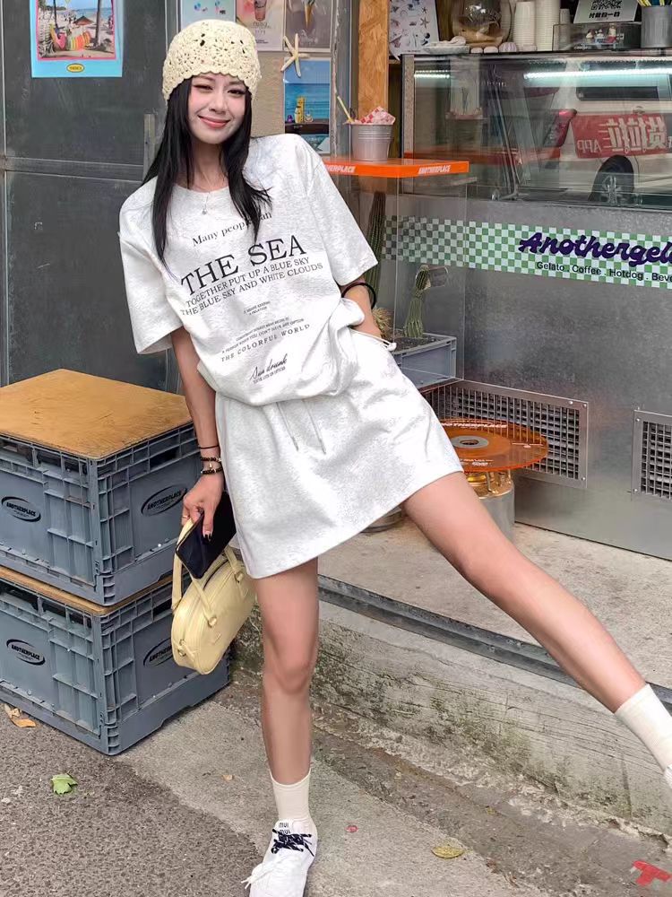 Повседневный спортивный костюм в корейском стиле для женщин летом, свободный и уменьшающий возраст, юбка-трапеция с короткими рукавами и завязками, модный комплект из двух предметов.